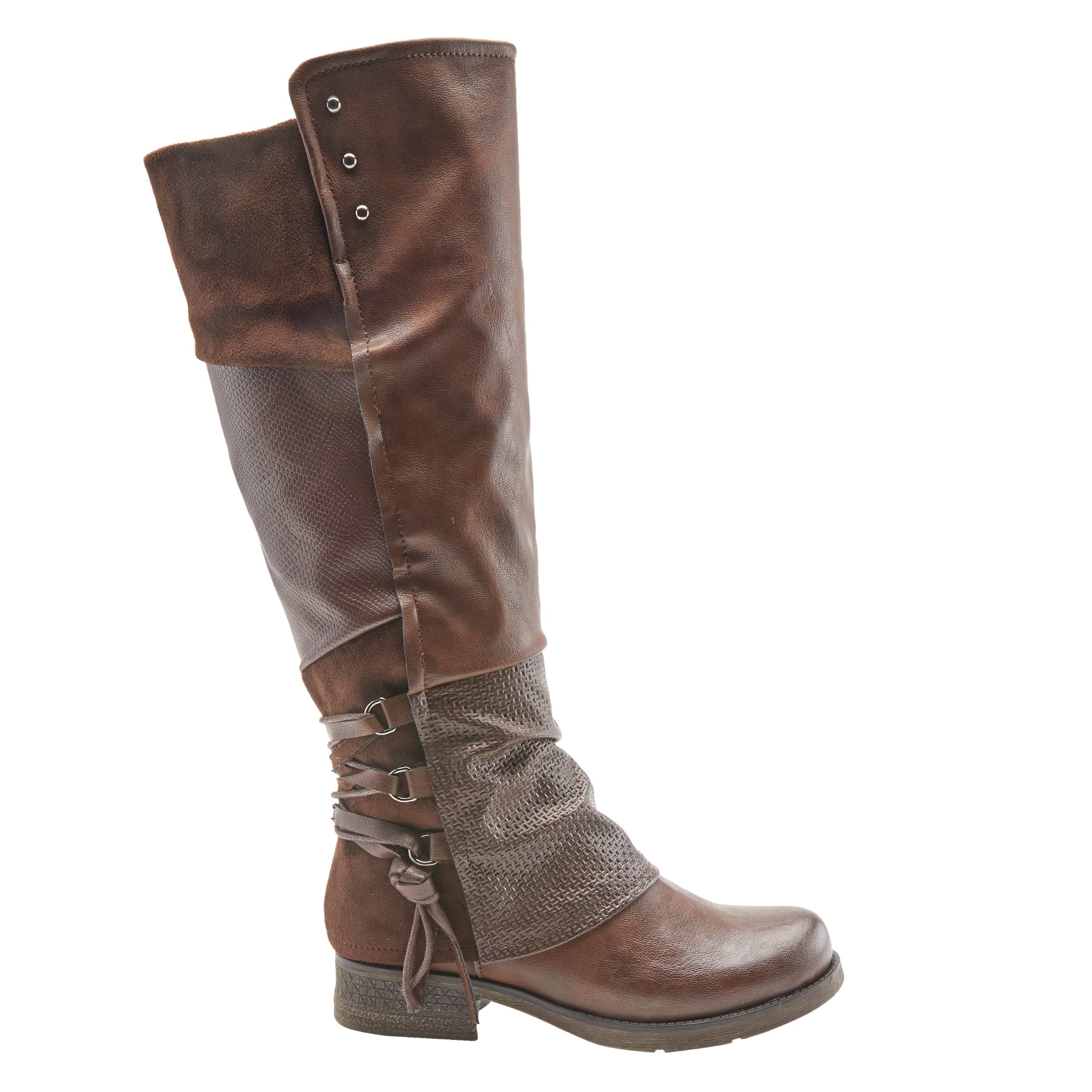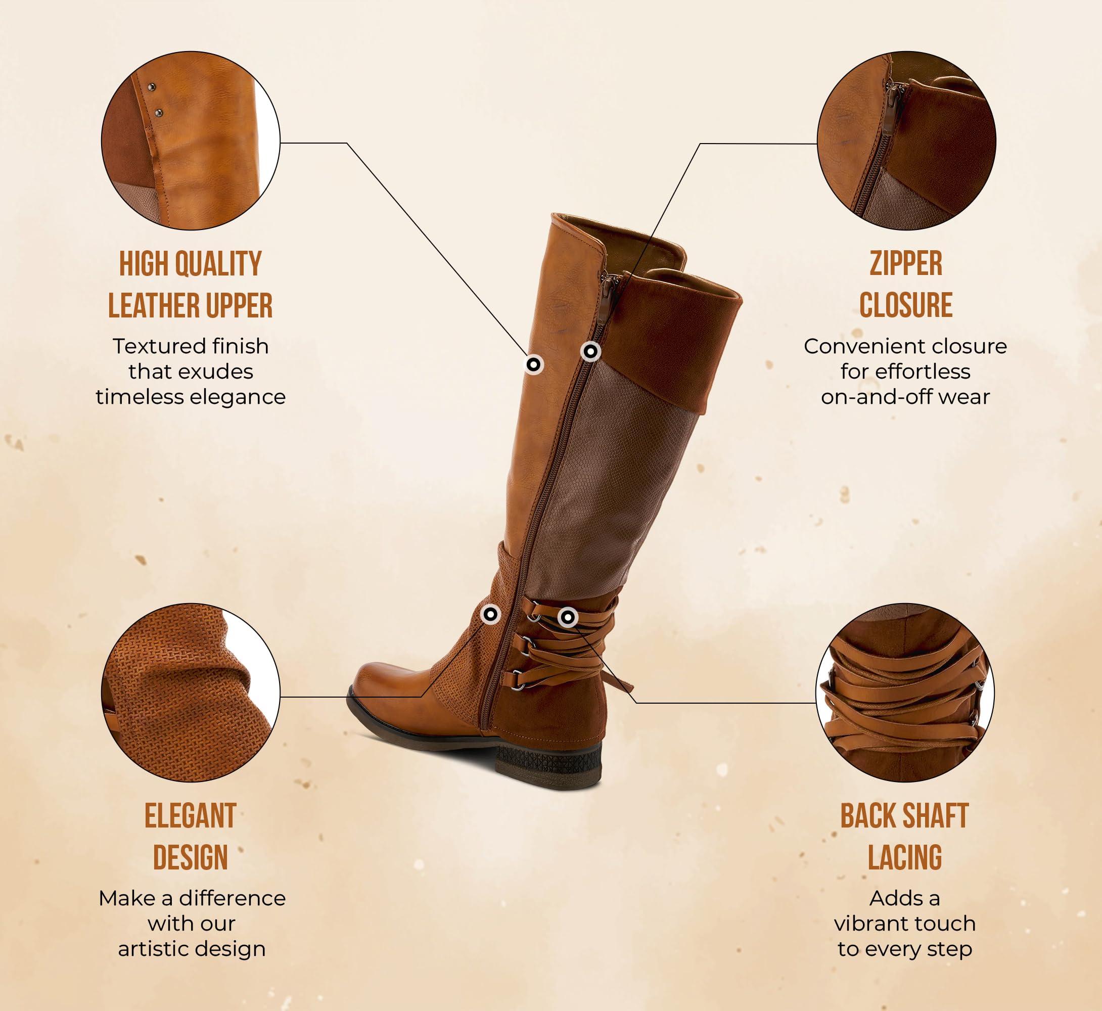 𝐄𝐌𝐁𝐎𝐒𝐒𝐄𝐃 𝐏𝐀𝐓𝐂𝐇𝐖𝐎𝐑𝐊 𝐃𝐄𝐒𝐈𝐆𝐍: These women's boots showcase an eye-catching soft embossed patchwork design make this knee-high boot a true piece of art. The addition of a decorative back and round-toe silhouette make these sculpted-heel boots a season must-have.