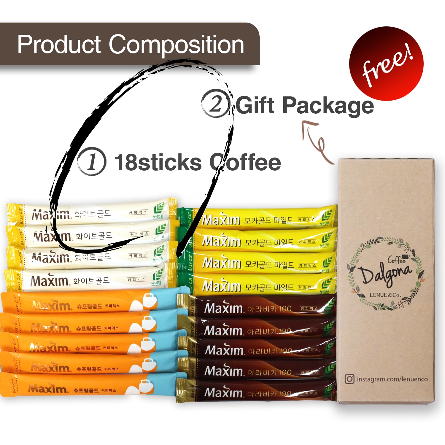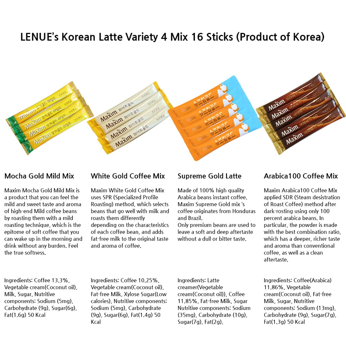 π LENUEβs Korean Latte Coffee Mix Gift set :Total 18 Sticks Best Korean Coffee Mix Sample packets : (5) x Maxim Supreme Gold Latte, (5) x Maxim Arabica100 Mix, (4) x Maxim Mocha gold Mild Mix, (4) x Maxim White gold Mix, Craft gift box; Product of Korea, Expiration: yyyy/mm/dd or yy/mm/dd