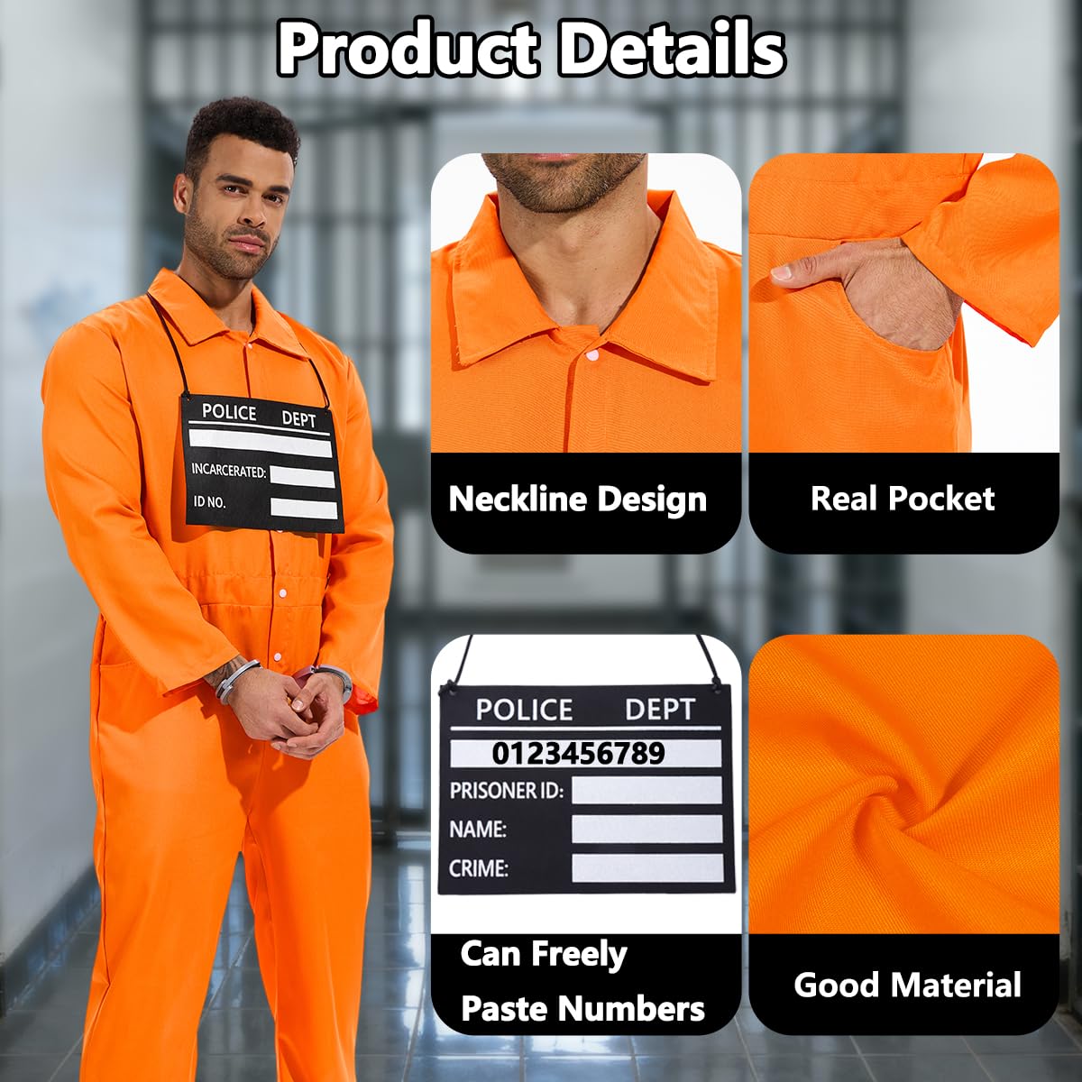 Applicable Occasions: cute orange prisoner jumpsuit set perfect for prisoner costume, Halloween, costume, prison inmate cosplay, theme party...you will get tons of compliments with this cute costume set