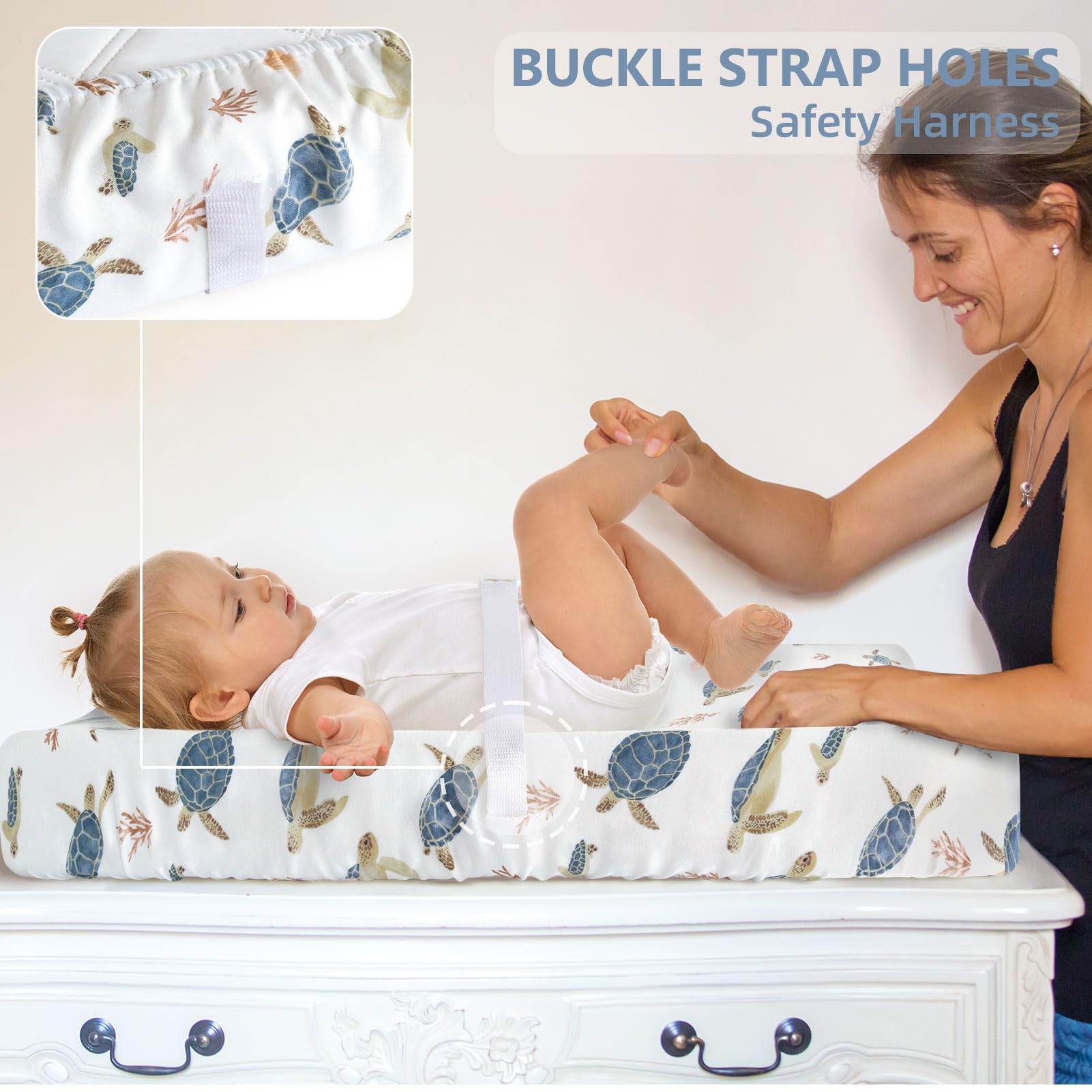Designed for Convenience - The diaper changing pad covers measures about 32" x 16", which is designed to fit most changing pads, flat changing table pads, bassinet mattresses and cradle mattresses. Buckle strap holes provide access to safety straps on changing pads.
