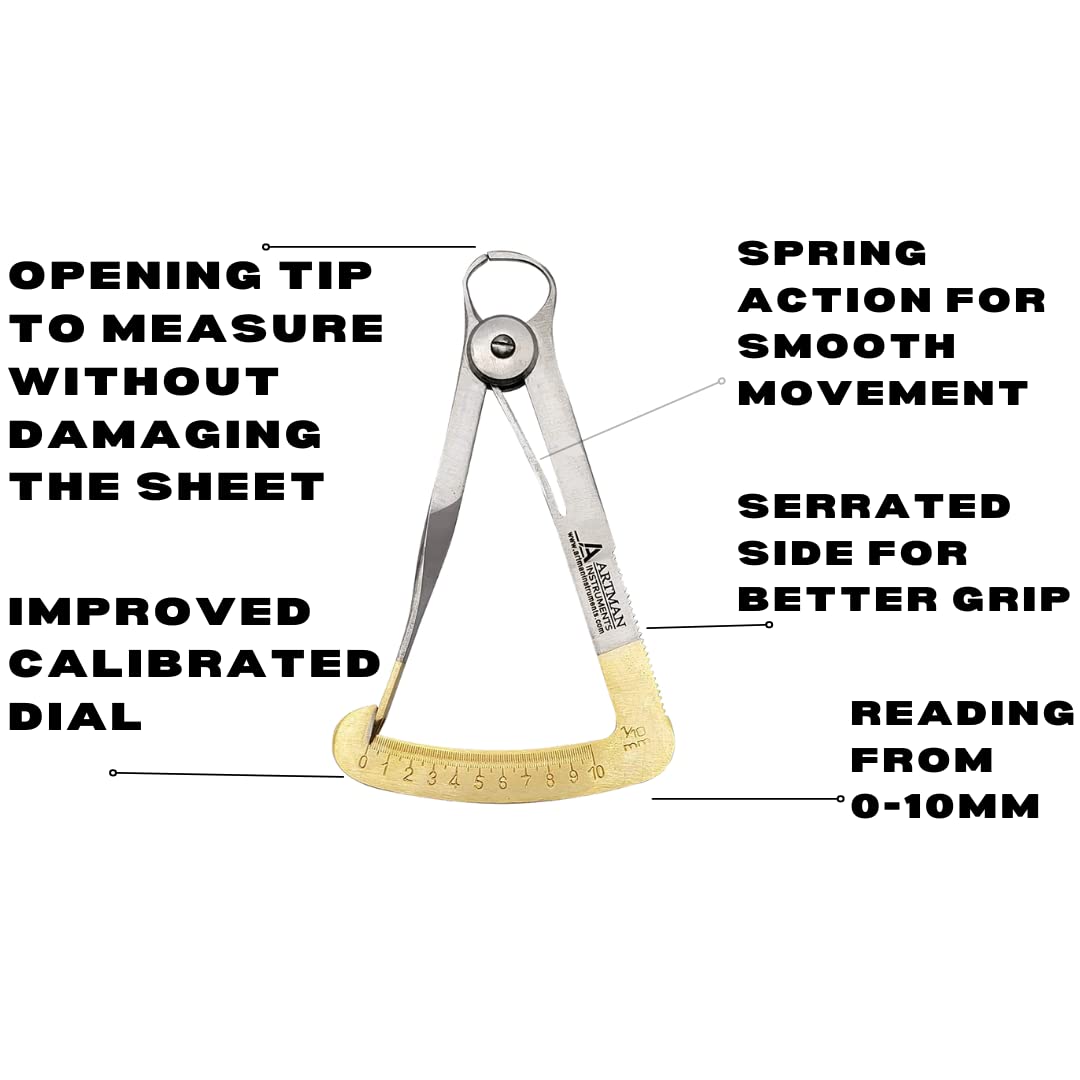 APPLICATION: Measure the thickness of sheets of wax, rubber, metal or leather up to 1/10 of mm. Wax caliper’s measuring arm tension is lighter than the crown caliper. A mandatory tool for jeweler’s art and craft workers and dental labs
