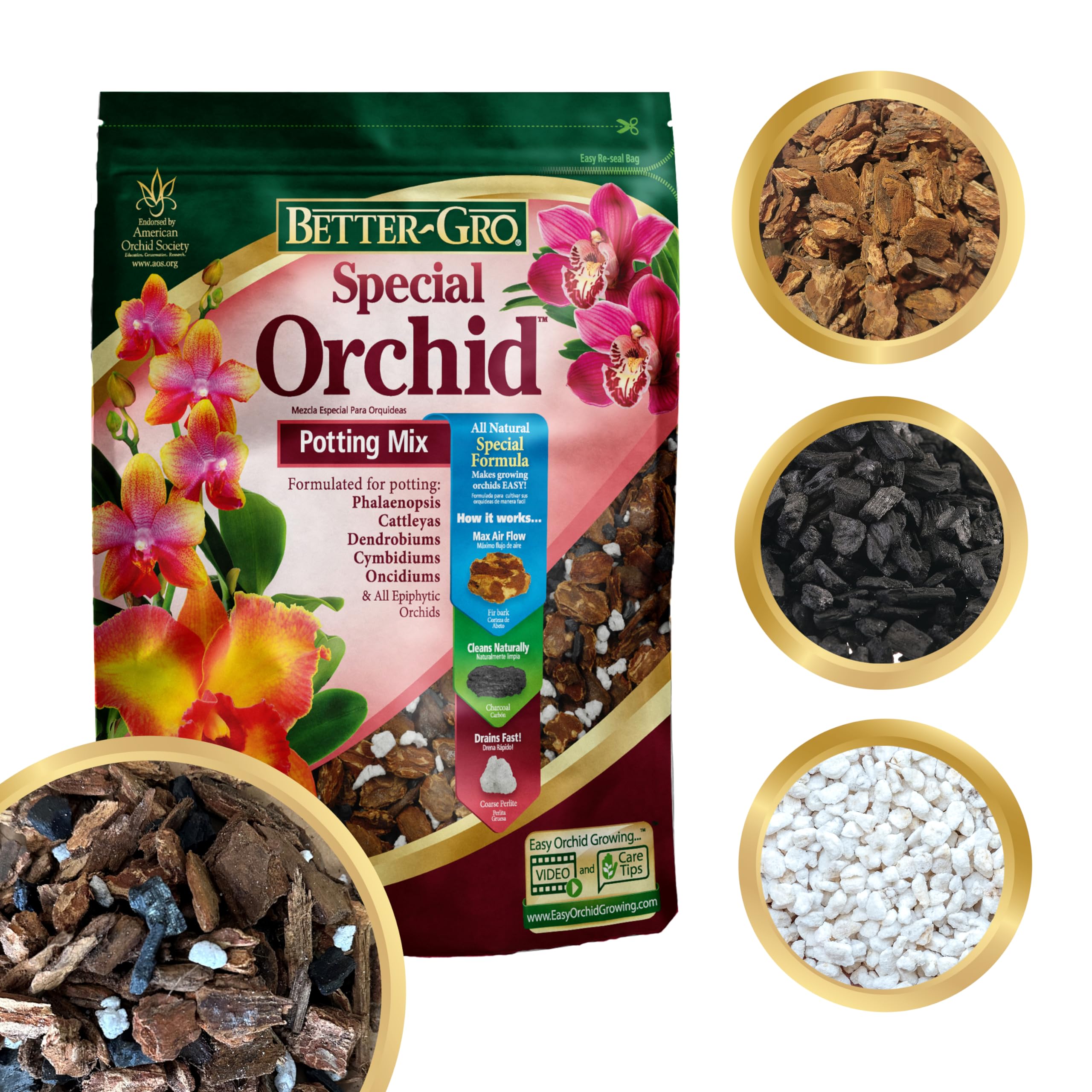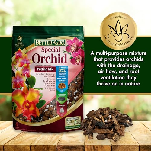 Better-gro special orchid mix is a multi purpose potting mixture for growing cattleyas, phalaenopsis, dendrobiums, paphiopedilums, oncidiums and all epiphytic orchids. The extreme versatility of better gro special orchid mix, makes it the clear choice for orchid hobbyists, small orchid collections and professional growers. It is a dynamic combination of western fir bark, hardwood charcoal and sponge rock that has been specifically formulated by a team of highly trained orchid growers. Better-gro special orchid mix promotes healthy, strong growth by providing superior drainage, allowing for proper root ventilation. Contains 4 quarts.