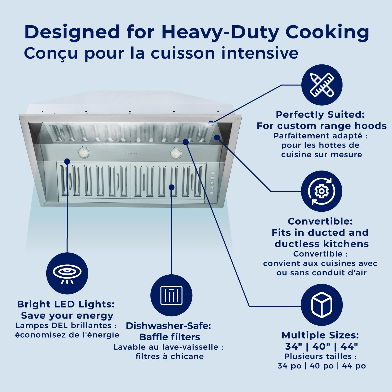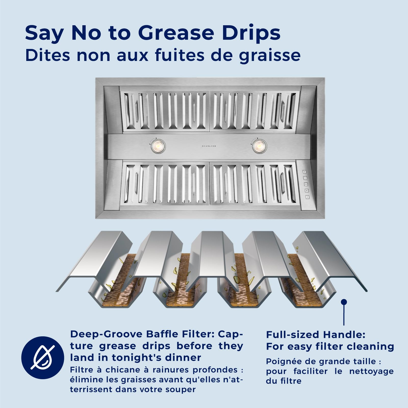 Dishwasher-Safe Heavy-Duty Baffle Filters: Stainless steel baffle filters efficiently trap grease to protect cabinets and countertops. Easy-to-remove, dishwasher-safe filters simplify maintenance and keep your kitchen spotless