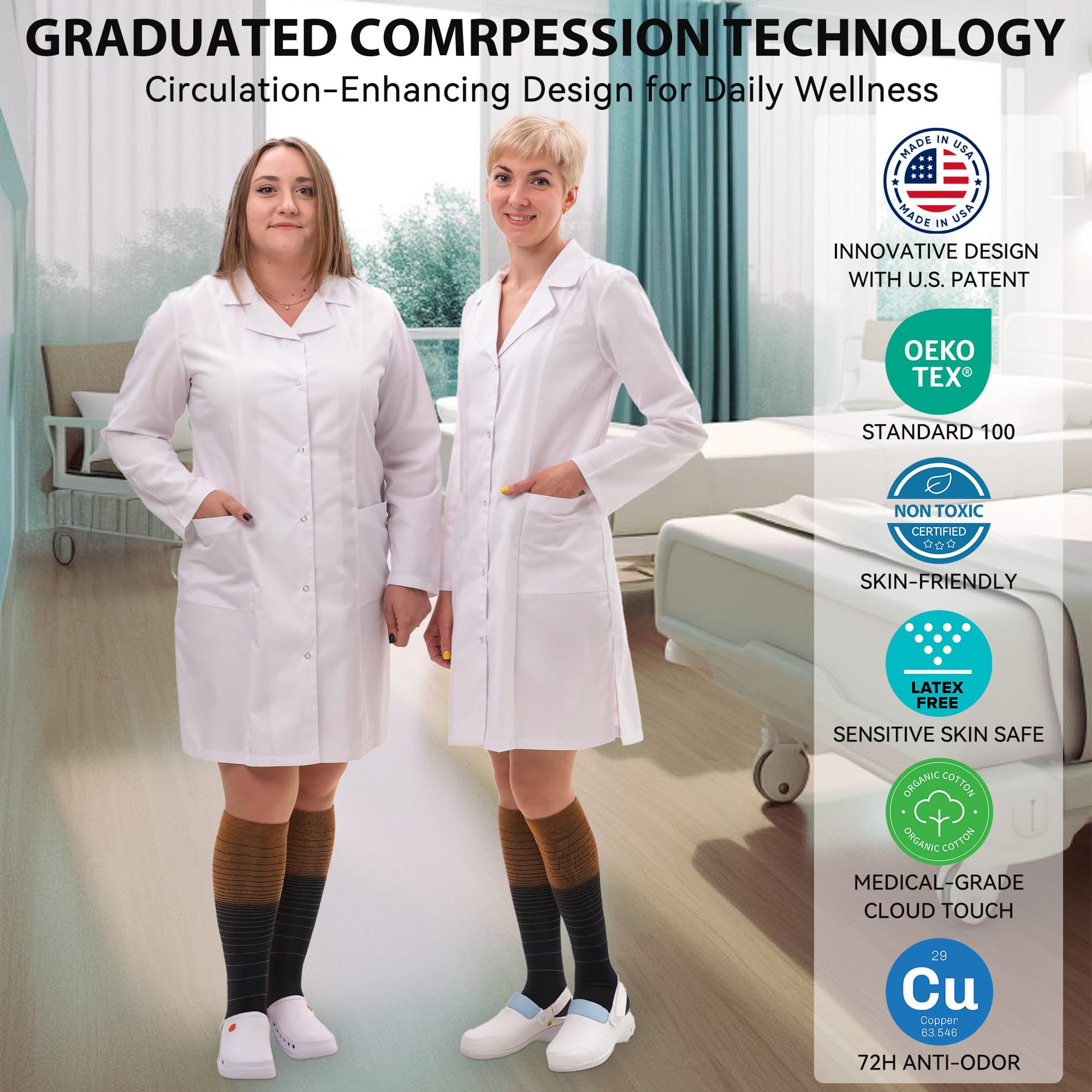 【COPPER COMPRESSION SOCKS】Copper is a great conductor of electricity, we extended its natural property to rejuvenate blood circulation through your legs through copper fibers capable reviving blood circulation along with providing a 15-20 mmHg compression. It offers the most perfect settlement scheme for those who sit for long period during travel or at work