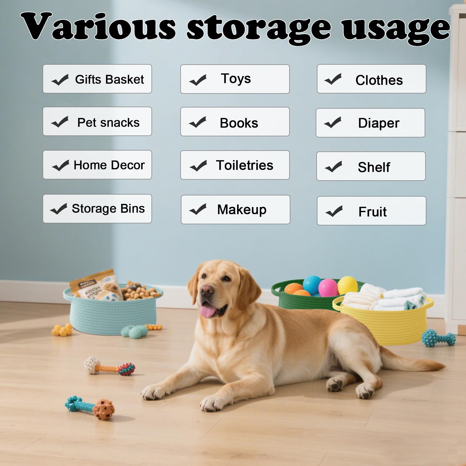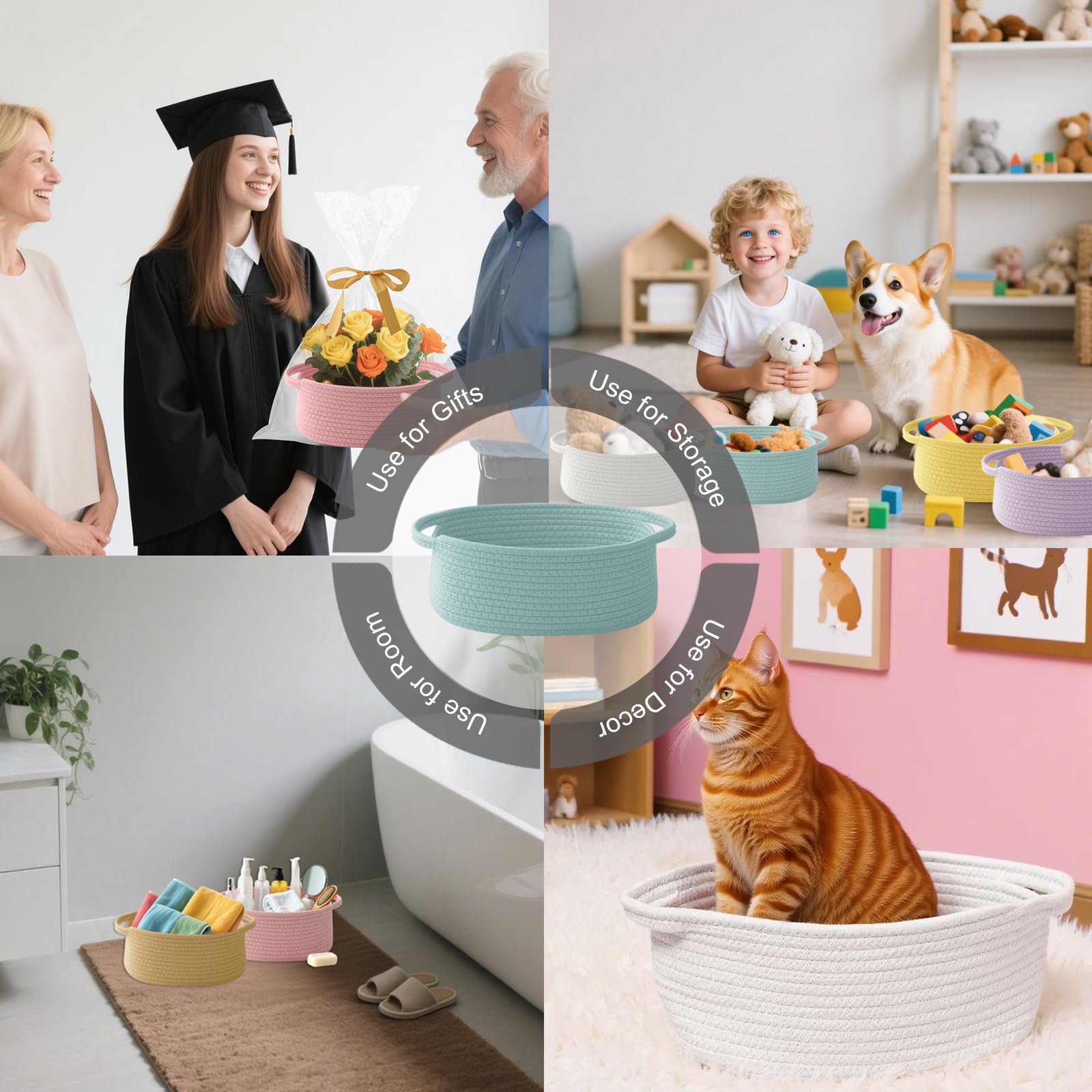 【Multi-Purpose Storage】Woven baskets for storage,bathroom organization, shelf styling,storage basket for organizing snacks, dog cat, magazine, shoes, remotes, books, towels, toiletries, keys and more.Widely used in living room,bedrooms,bathrooms,kids room,and Kitchen