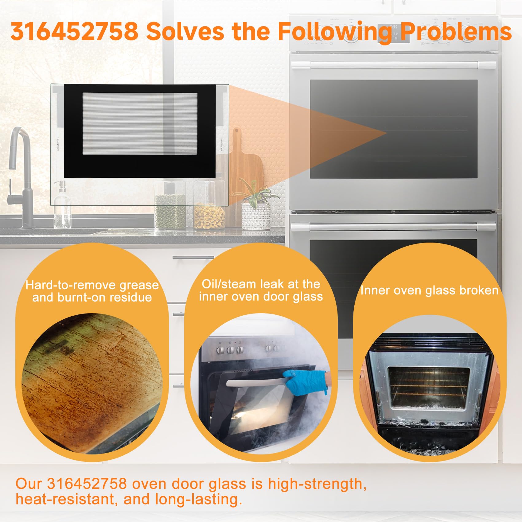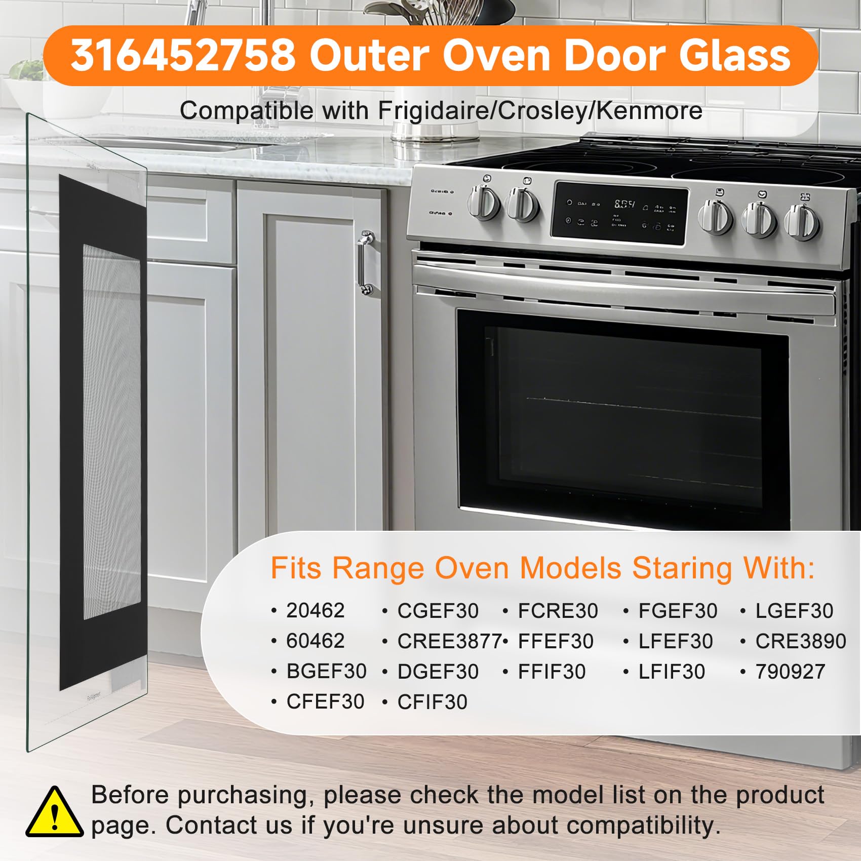 Upgraded 316452758 Outer Oven Door Glass: 316452758 range oven door glass size is 29.3 "(L) x 20.2" (W), thickness is 3mm. This outer oven door glass is designed to perfectly fit Frigidaire, Crosley, and Kenmore oven models. Before purchasing, please measure or verify the size and model of your oven glass door to ensure it matches the 316452758 oven outer door glass.