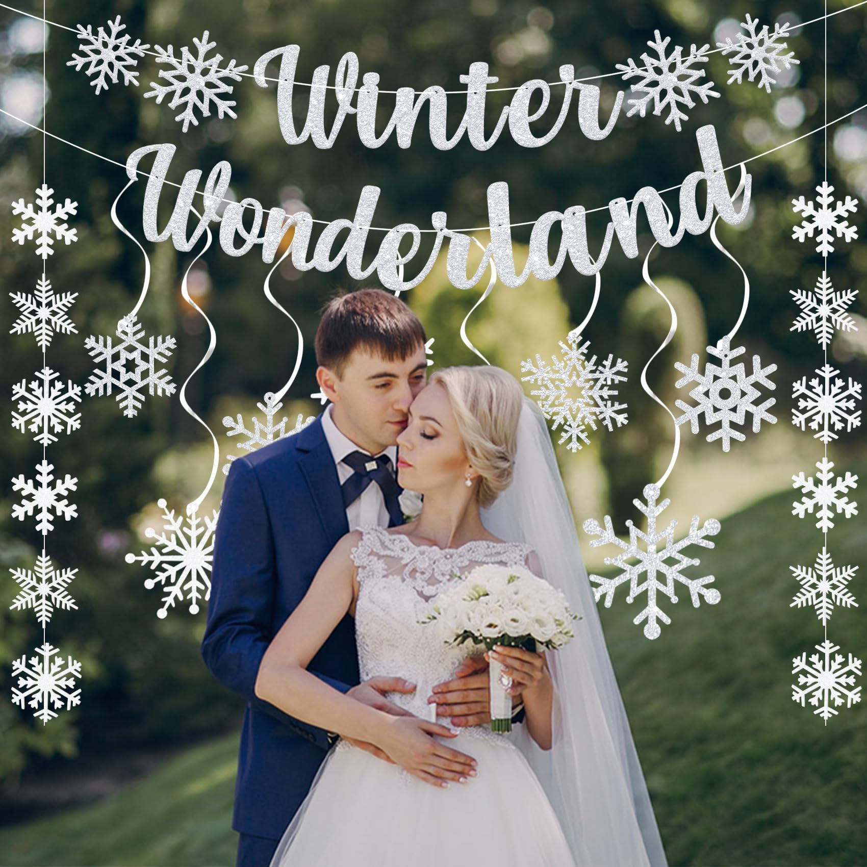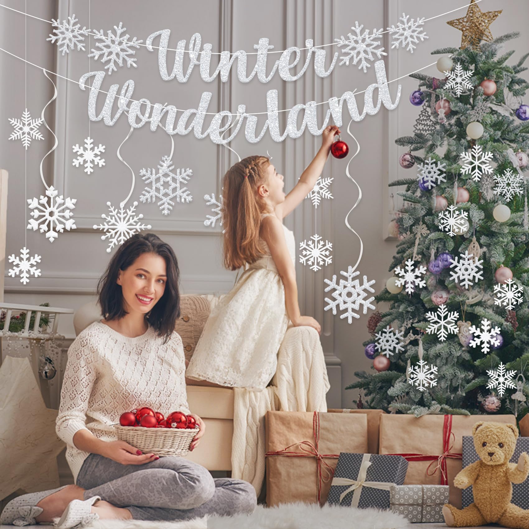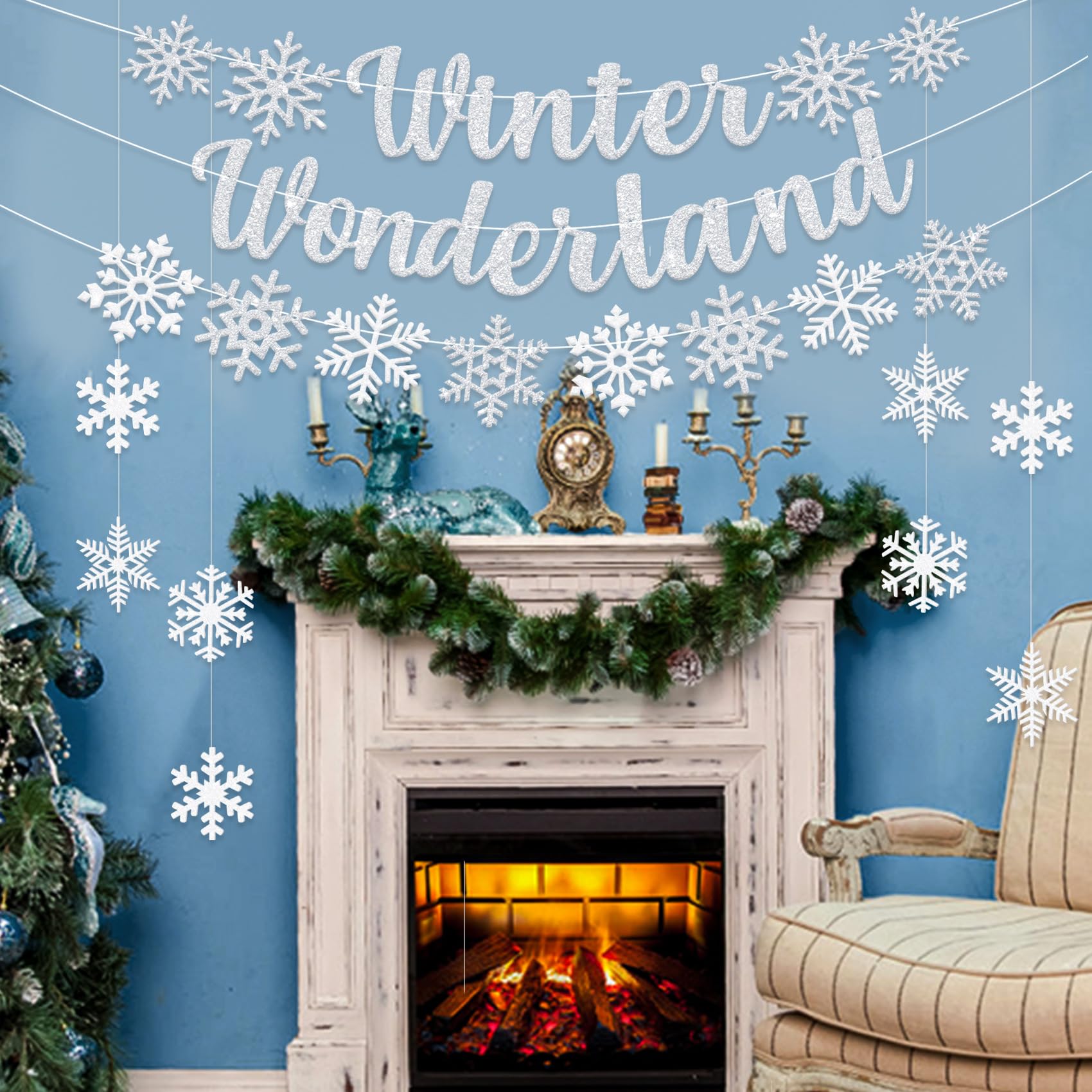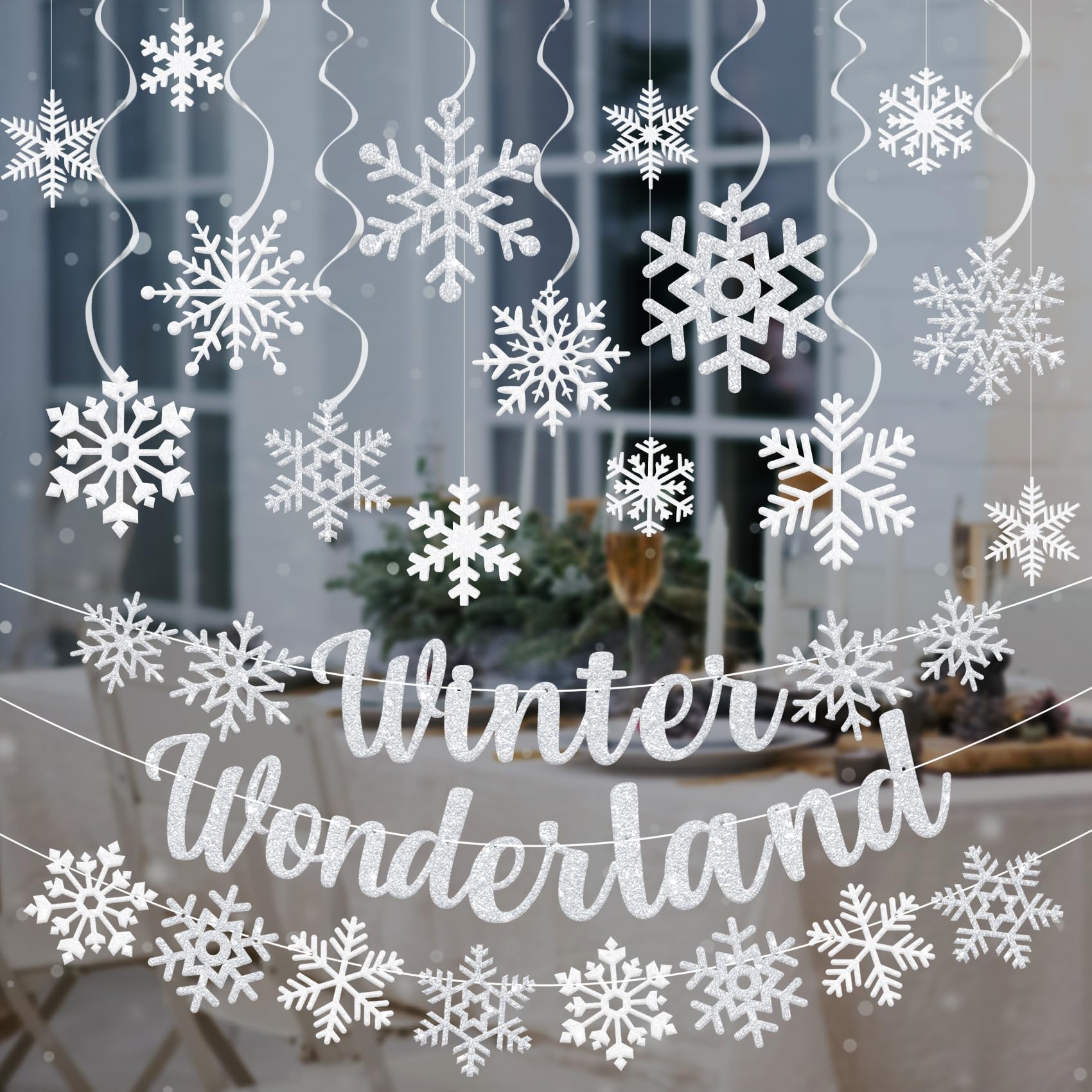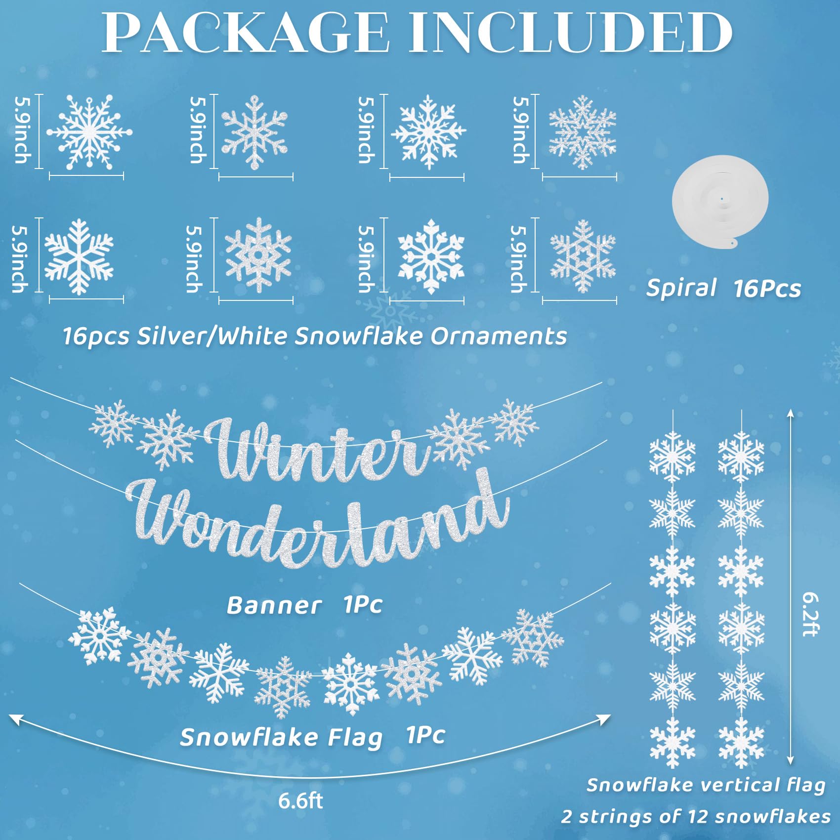 Winter Wonderland Decorations: Snowflakes decorations hanging includes 2 pcs silver letter banners,1 pcs snowflake banner, 16 pcs snowflake spiral, there are 8 snowflake styles in total, 2 strings of 12 pcs snowflake garland