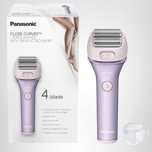 Enjoy a safe, gentle shave with the Panasonic Shaver for women ES-AWL8AV. Four ultra-sharp floating blades and outer foils hug your curves, for a silky-smooth, close shave. And blades are made of hypoallergenic stainless steel for less irritation, even on sensitive skin. The unique blade design of this women's electric razor allows you to shave backwards or forwards, to cover large areas more quickly. A pop-up women’s bikini trimmer lets you shape and trim even your most sensitive areas precisely and gently, while the bikini comb attachment lets you keep hair at a desired length. With this waterproof women’s shaver, you can shave and trim in or out of the shower, with an ergonomic handle that is easy to use even when wet. These electric shavers come with a full range of accessories, such as a trimming comb, and brush. And a neat charging stand eliminates messy charging cords. A full charge provides up to 35 minutes of use.