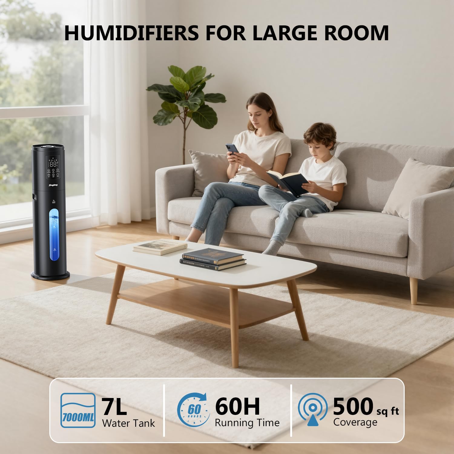 【Humidifier Large Room & Top Filling Design】: The cool mist humidifiers for bedroom with 7L removable large capacity , top-filling anti-leakage design improves the leakage problem and easy to refill,continuously up to 60 hours on a single refill needn't filling water frequently.350mL/h high moisture output is designed to humidify the air for cover up to 500 sq.ft ,better relieve air and skin dryness. Best whole house humidifiers for home, dorm and living room.