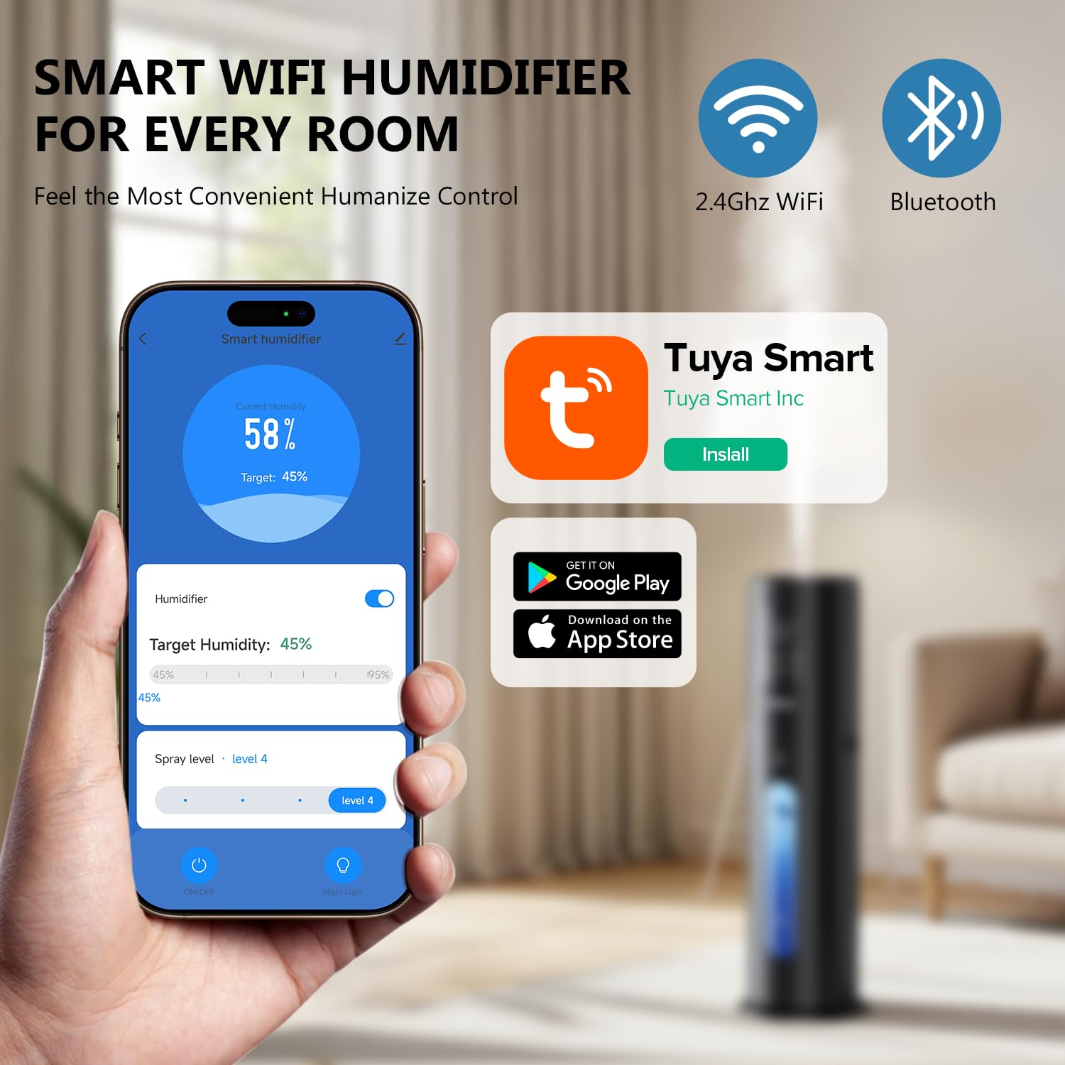 【Smart App & Remote & Touch Control】 : Connect the smart humidifier to the smart(TUYA) app to easily set up the large humidifier, you can control the air humidifier on your phone at any time. Adjust the humidity, timers, mist levels, night light and sleep mode. Large Room humidifier for bedroom also works with remote and touch control,You can create a moist and comfortable living environment at your own pace.(Only Support 2.4G Wi-Fi.)