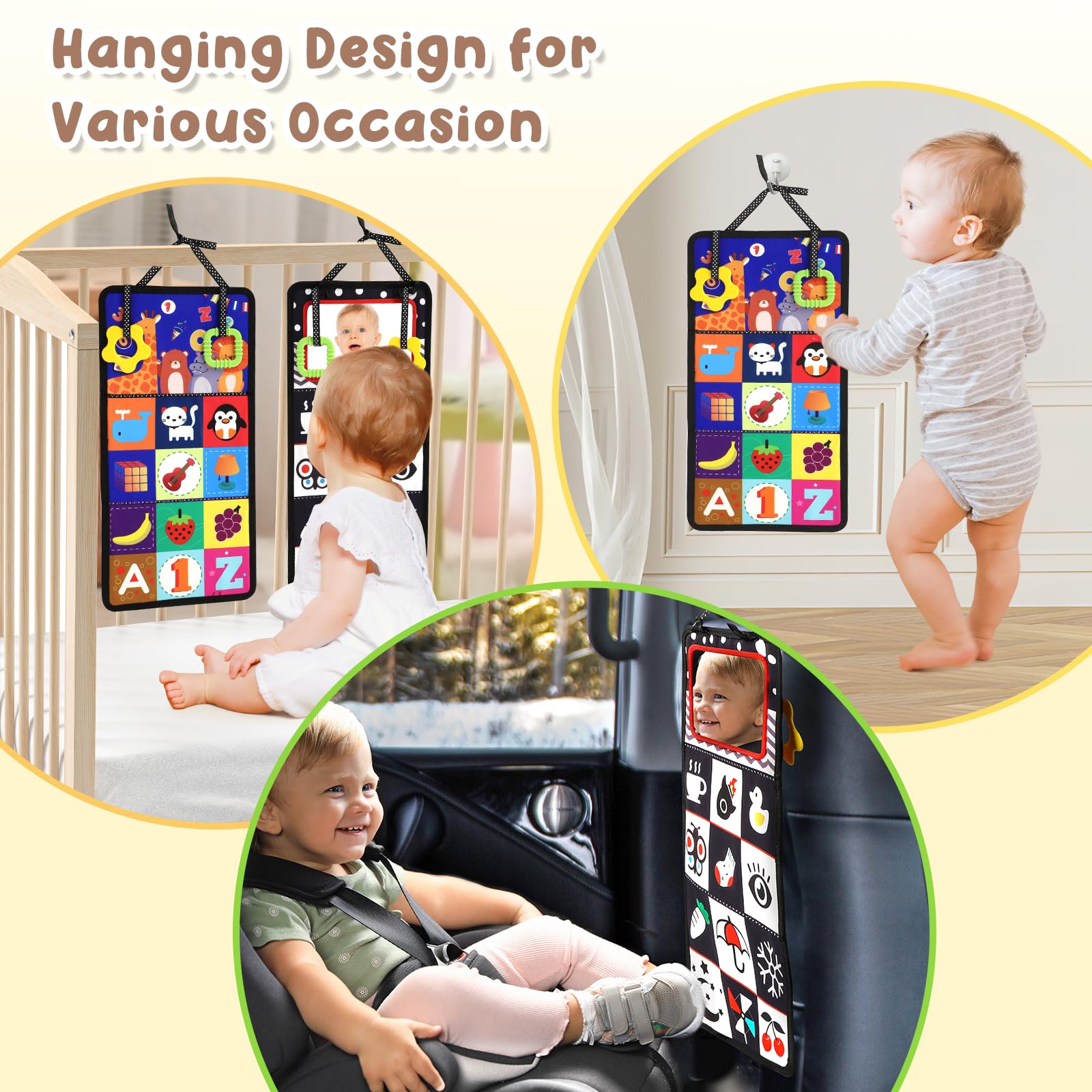 Versatile Hanging Options: Equipped with two tie straps, this toy can be securely attached to walls, cribs, or the back of a car seat, making it versatile for different environments. This allows your baby to enjoy visual and tactile stimulation whether at home or while traveling.