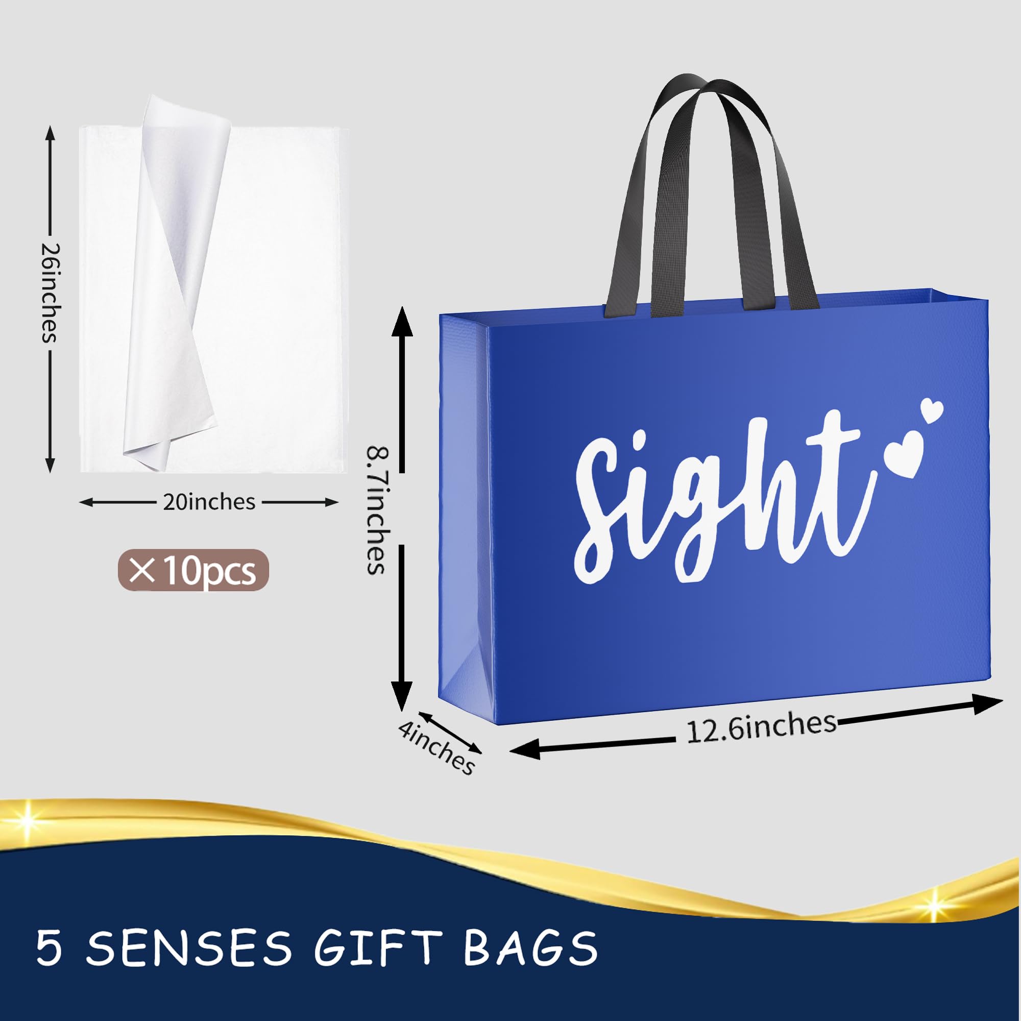 Size details: each sense gift bags measures 12.6 x 8.7 x 4 inches while accompanying tissue papers measure 19.7 x 26 inches, designed to accommodate uniquely shaped gifts, these 5 senses gift bags will help you create the great set of presents, and to show your love and add the last touch to your present