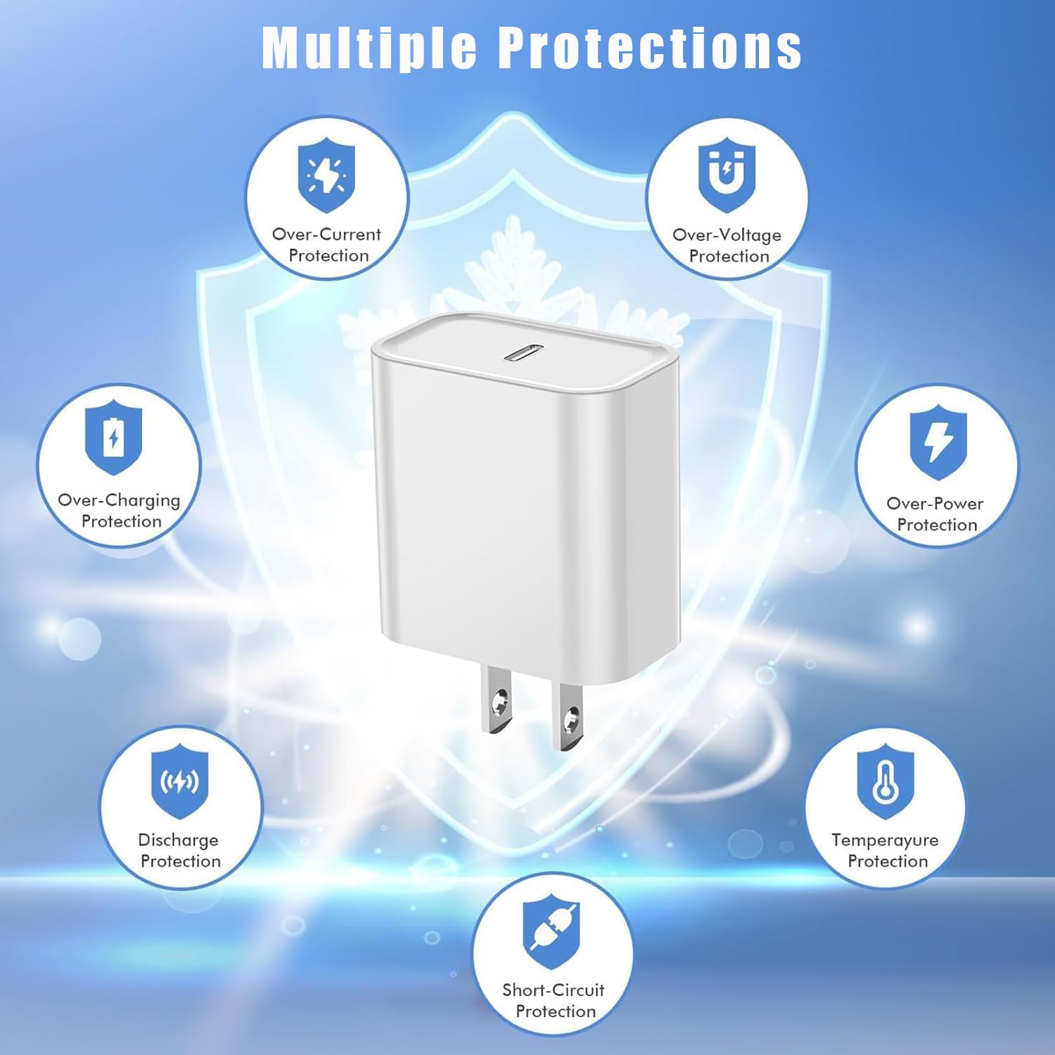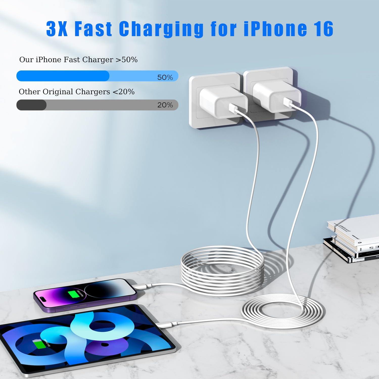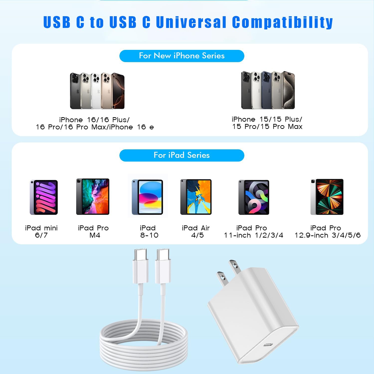 iPhone 16 Fast Charger The 20W PD charger use Power Delivery technology to deliver a rapid charge,bring you the ultimate charging experience The 60W cables support high-power devices and transfer files at 480 Mbps. No more waiting around for slow chargers! Safety and Durability Certified by MFi, you can rely on them completely for safe, worry-free charging. The cables has undergone over 1,000 bending tests and feature thickened copper wires ,extremely strong and durable. Compatible Devices iPhone 16/16 Plus/16 Pro/16 Pro Max/16 e iPhone 15/15 Plus/15 Pro/15 Pro Max apple iPad Pro 13-in.(M4),iPad Pro 11-in.(M4),iPad Air 13-in.(M3) iPad Air 11-in.(M3),iPad (A16),iPad mini (A17 Pro) iPad Pro 12.9-in.(6th Gen),iPad Pro 12.9-in. (5th Gen),iPad Pro 12.9-in. (4th Gen) iPad Pro 12.9-in. (3rd Gen),iPad Pro 11-in.(4th Gen),iPad Pro 11-in. (3rd Gen) iPad Pro 11-inch (2nd Gen),iPad Pro 11-inch, iPad Air 11-in.(M2) iPad Air 13-in.(M2),iPad Air (5/4th Gen),iPad (10th Gen),iPad mini (6th Gen) Samsung Galaxy S25, S24, S23, S23+, S23 Ultra, S22,S21 and more USB-C devices Package Include 2 Pack 20W (USB-C Port Wall Chargers 2 Pack 10FT 60W USB-C to USB-C Cables
