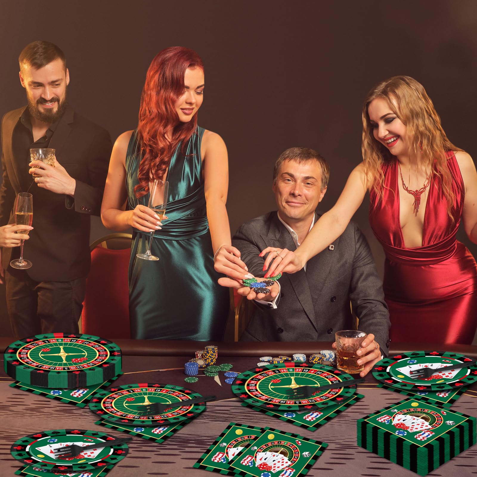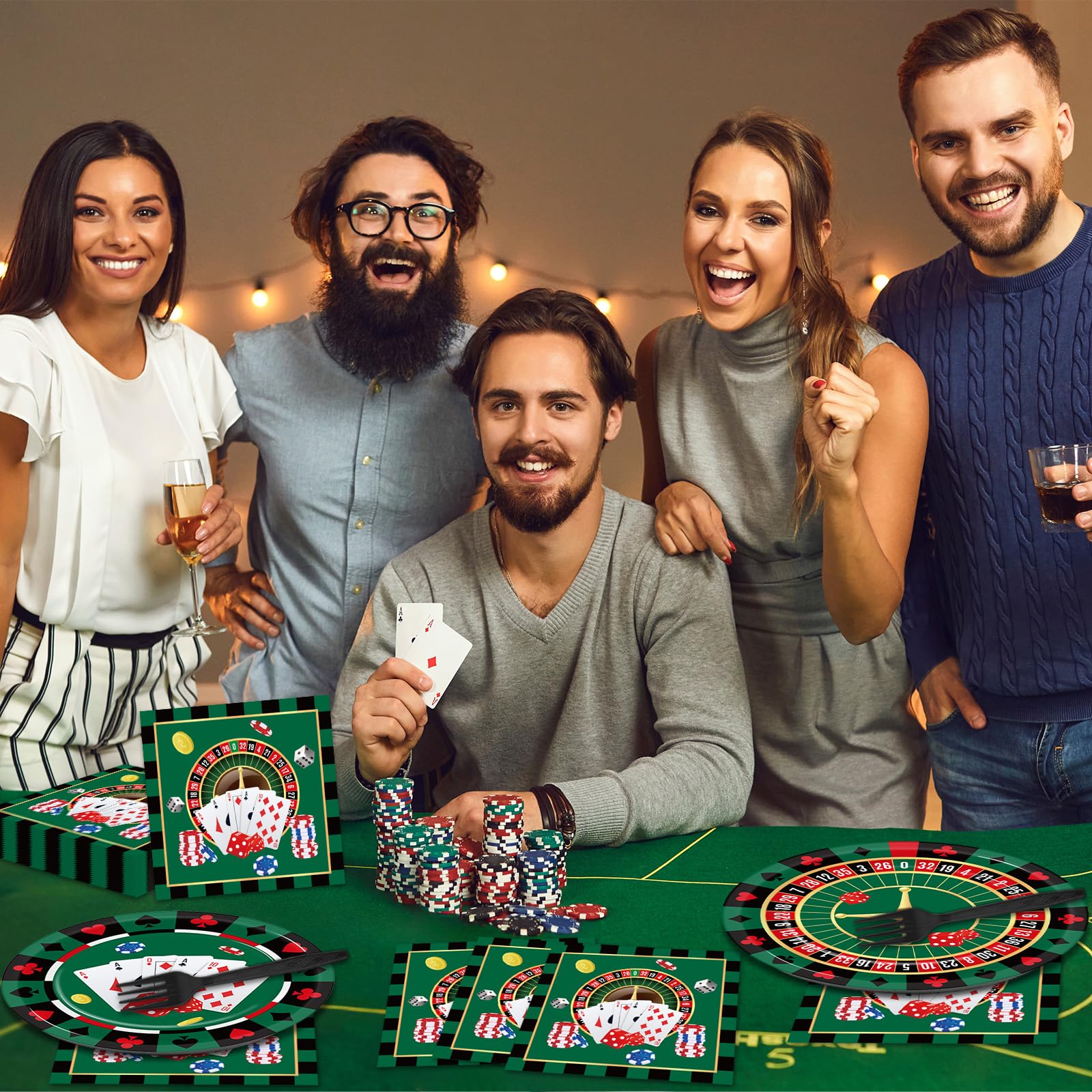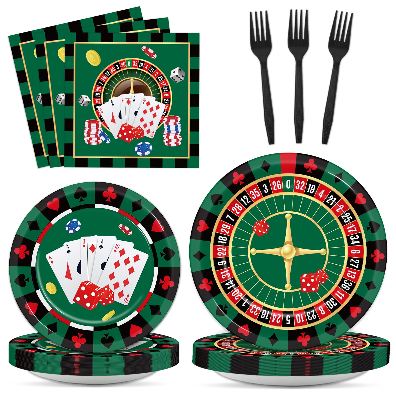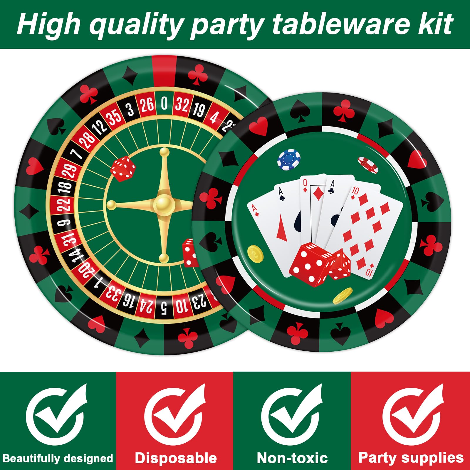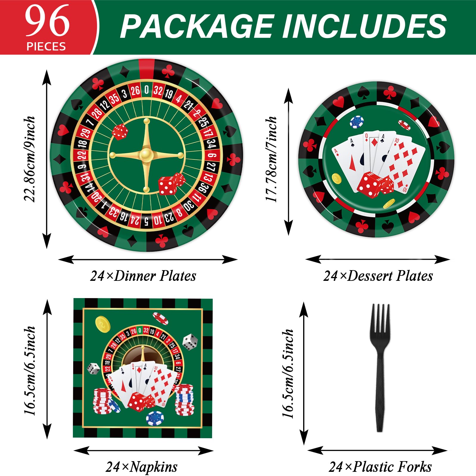 Package includes:Casino poker tableware set includes 24 9-inch plates, 24 7-inch plates, 24 green forks, 24 double-layer napkins, and a wide variety of color and patterns, allowing 24 people to enjoy the perfect meal happily.