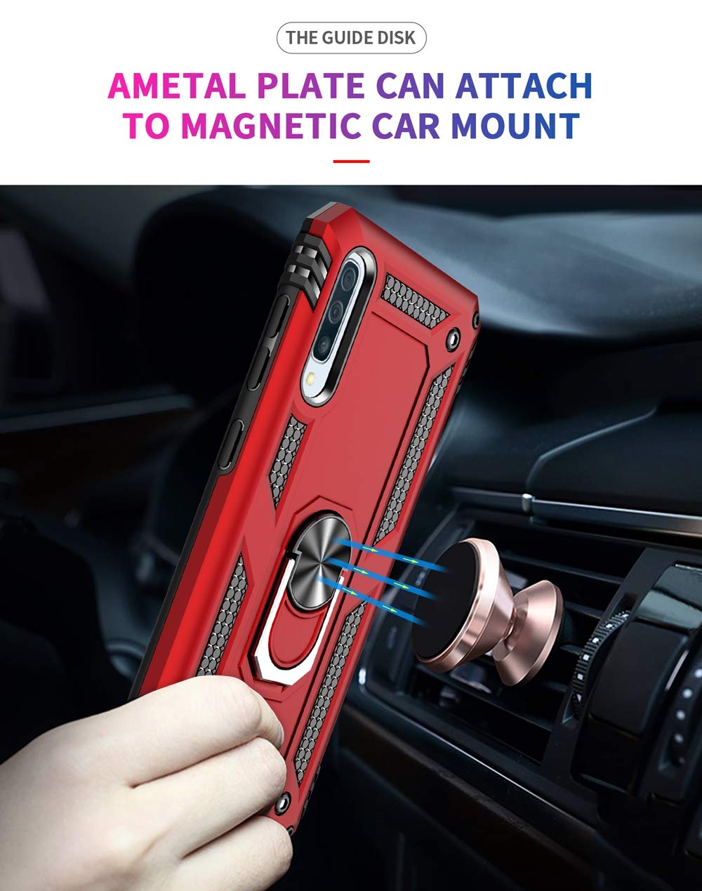 [Material]:High Qualit Full Body case for Samsung Galaxy A50 Phone Case.Armor Heavy Duty Shockproof for Samsung Galaxy A50 Case.redesigned TPU frame with Metal kickstand, and extra reinforcement from hard PC material provide aesthetic.with 360 Metal Rotating Ring Built-in Magnetic Car Mount.