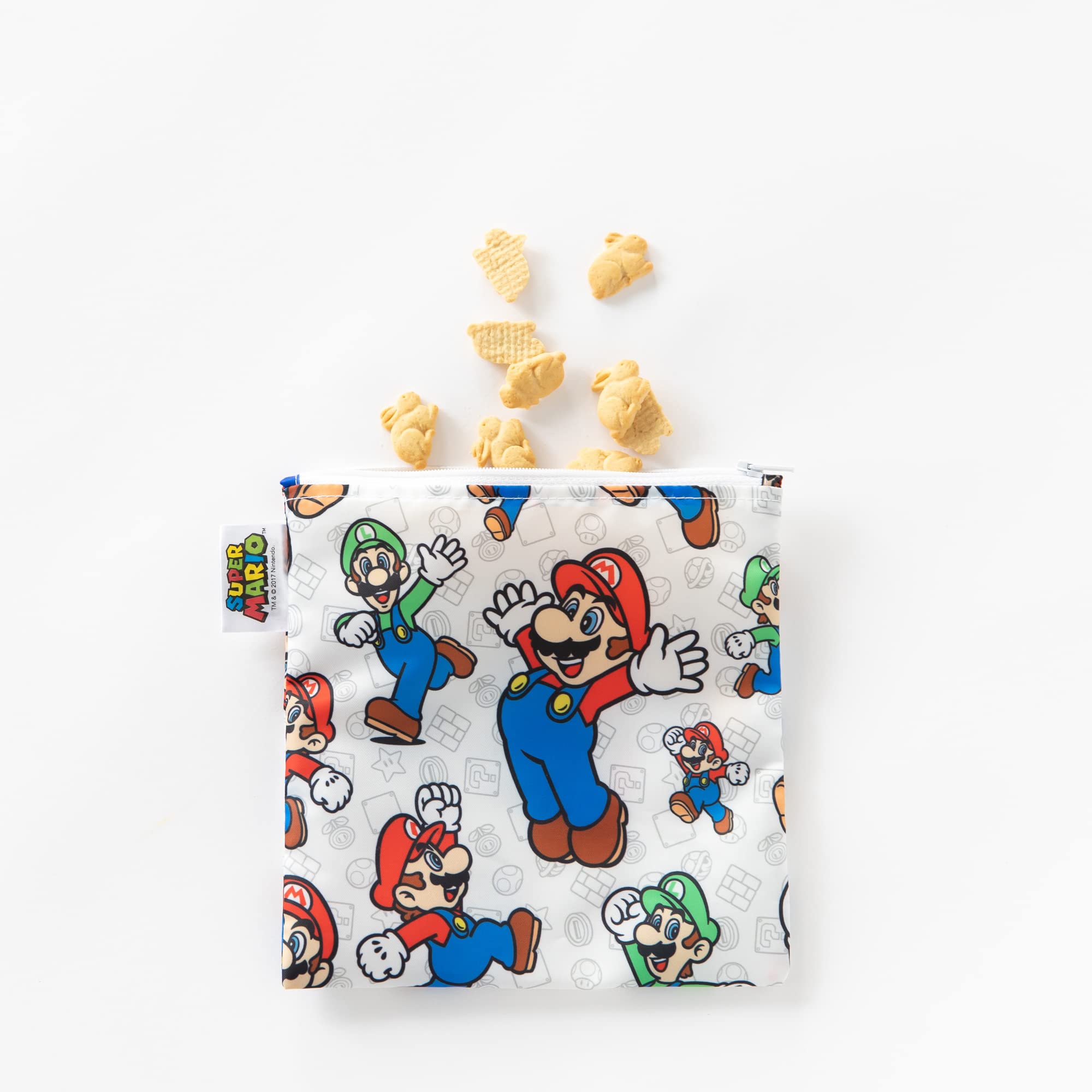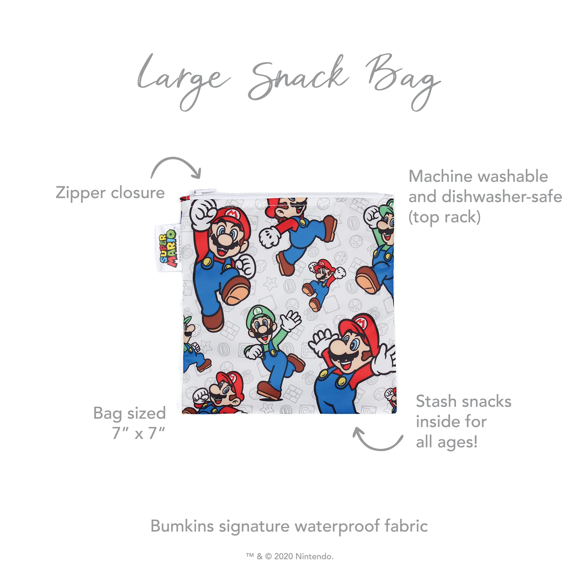Let's-a go! Our Super Mario snack bag is great for quick fuel-ups! The better alternative to single-use plastic bags, our reusable sandwich and snack bags are made from Bumkins’ original easy-wipe waterproof fabric. Reusable cloth bags help reduce waste from plastic bags and takeout containers. By packing lunches and snacks, you can stay on budget, ensure foods are allergy-free and adhere to dietary restrictions, plan healthier options. Plus, you’ll have something on hand when you’re hungry!Not just for food—snack bags make excellent organizers for storage and travel! Stash inside a lunch bag, purse, diaper bag, or travel bag. Great for lunches; zip away toys, electronics and more. Our reusable bag has a strong and durable zipper closure that keeps in crumbs, and the single-ply fabric means no worrying about icky stuff growing between layers of extra material. Made from Bumkins’ original fabric that’s 100-percent polyester with embedded TPU for water resistance. It’s lightweight and lays flat, so when traveling it takes up less space when empty than other containers and bags. Machine washable and dishwasher-safe (top rack) for easy cleaning. Measures approximately 7in x 7in, it’s large enough to fit a sandwich or bagel. We use third party labs to ensure the products we manufacture comply with CPSC and CPSIA standards for BPA, Lead, and Phthalates. Tested for Small Parts according to 16 CFR 1500.50 – Results: No small parts. For over 30 years, Bumkins has been creating thoughtful and responsibly made essentials for babies and kids, making parenting easier so families can cherish those special moments. Designed in Arizona, responsibly made in China.