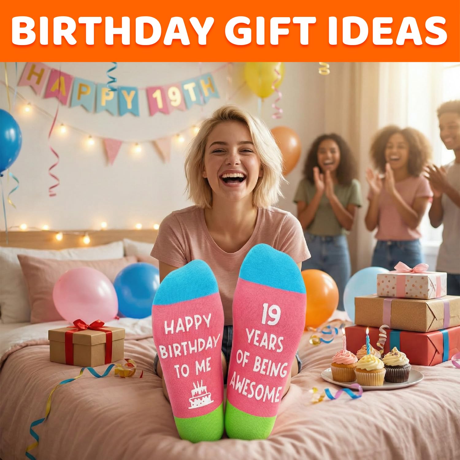 GIFT FOR 19 YEAR OLD FEMALE: These pink "HAPPY BIRTHDAY TO ME, 19 YEARS OF BEING AWESOME" socks are perfect for teen girls