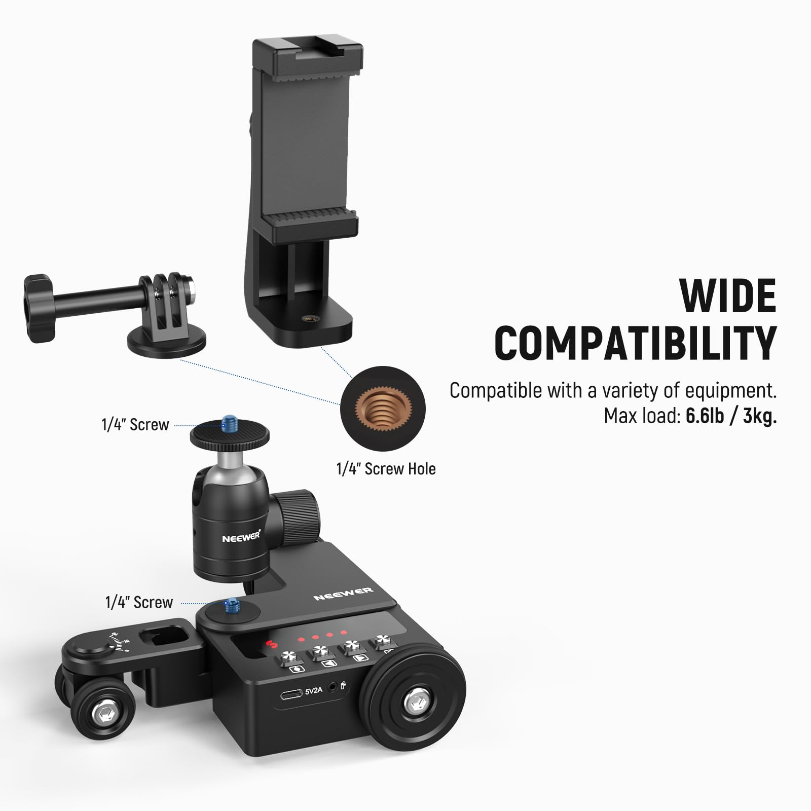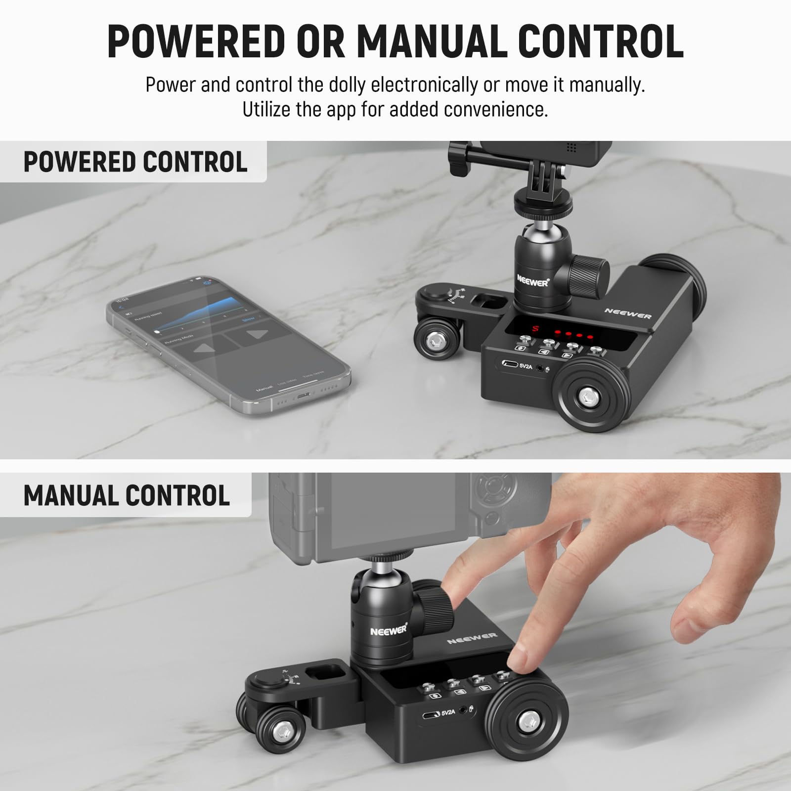 【Upgraded Motorized Camera Cine Dolly】The upgraded camera dolly offers streamlined cable management for reliable power and exceptional performance. Also includes a 360° ball head, phone holder, and action camera mount to be compatible with GoPro Hero 13 12 11 iPhone 15 14 13 Pro Max Samsung S23 S22 Huawei P60 smartphones, DSLR and mirrorless cameras. With a 6.6lb/3kg maximum load capacity, recommended for live streaming, interviewing, advertising, food videos, filmmaking, and more