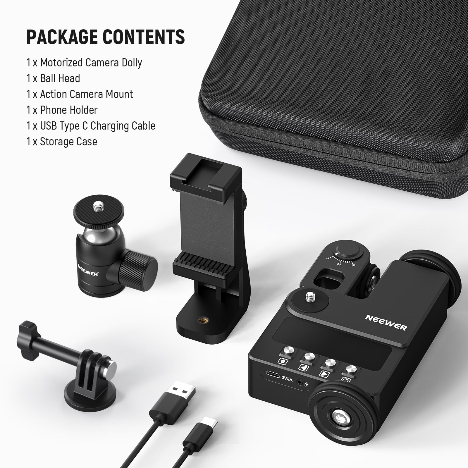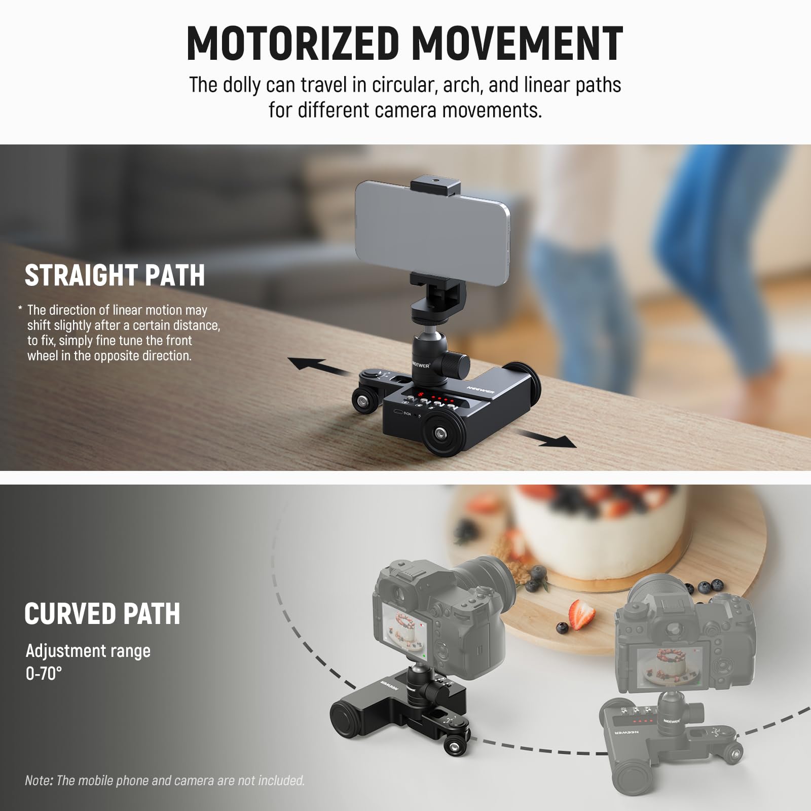 【Upgraded Motorized Camera Cine Dolly】The upgraded camera dolly offers streamlined cable management for reliable power and exceptional performance. Also includes a 360° ball head, phone holder, and action camera mount to be compatible with GoPro Hero 12 11 iPhone 15 14 13 Pro Max Samsung S23 S22 Huawei P60 smartphones, DSLR and mirrorless cameras. With a 6.6lb/3kg maximum load capacity, recommended for live streaming, interviewing, advertising, food videos, filmmaking, and more