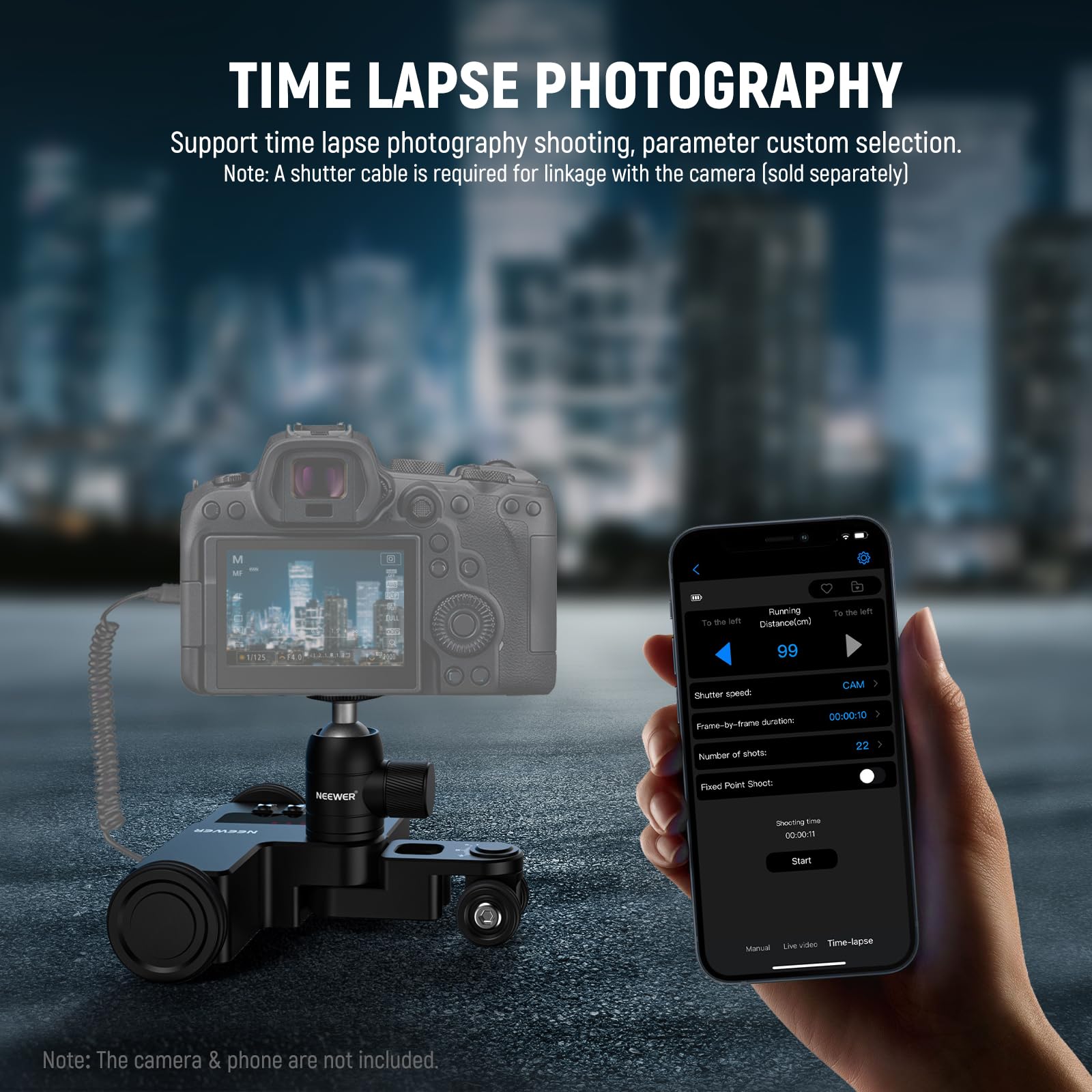 【Shooting Mode Customization】 In Manual mode, you can set movement directions, speed (1-5 levels), and movement mode (even/slow). In Video mode, you can set movement directions, movement distance (66-999cm), and movement mode (even/slow). In Time Lapse mode, you can set shutter speed, frame length, number of shots, and fixed point shooting (Note: Time lapse photography needs a camera shutter cable and it is not included.)