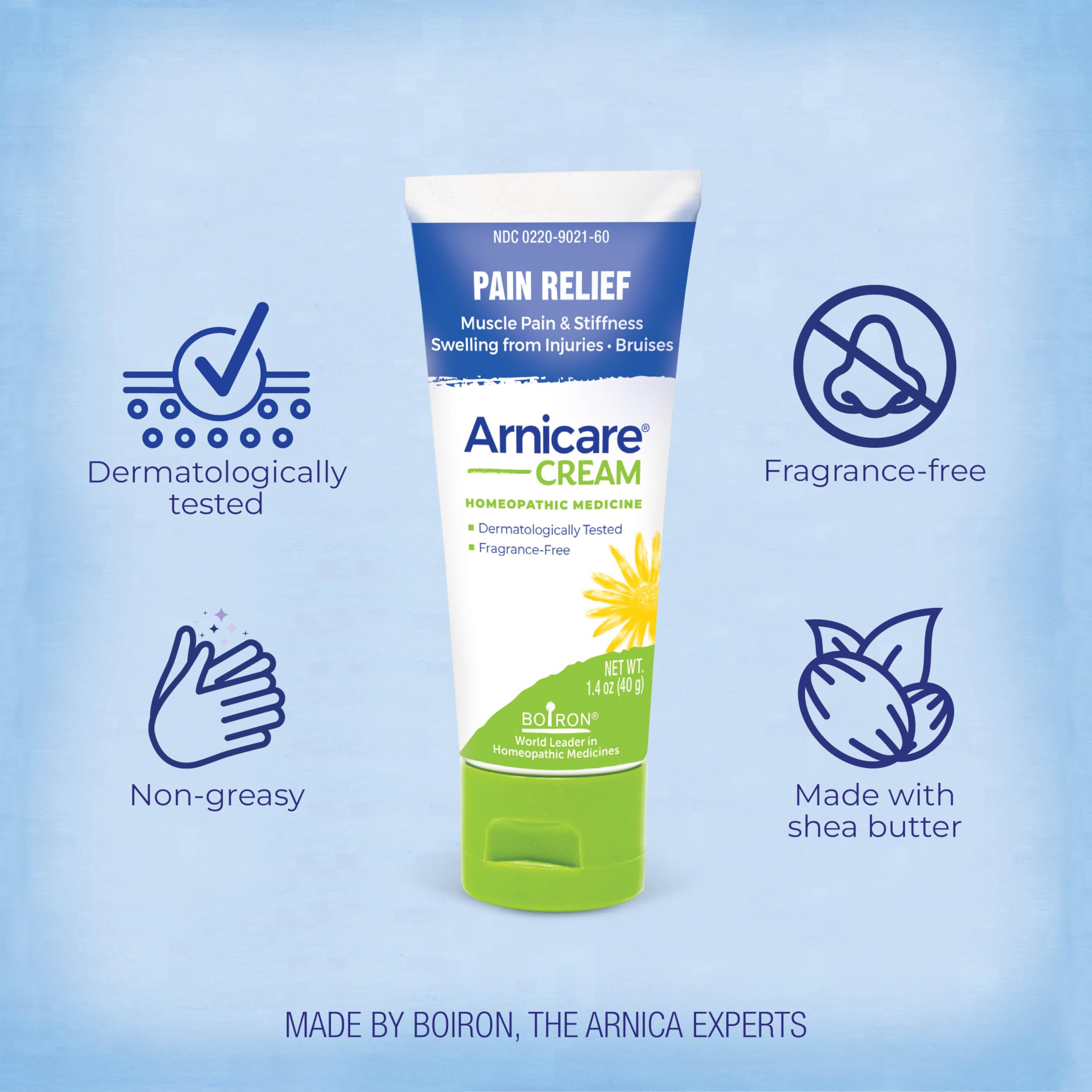 Arnicare Cream's natural active ingredient, Arnica montana, helps to relieve muscle pain and stiffness and to reduce pain, swelling and, discoloration from bruises. This pain relief cream is unscented and paraben-free.