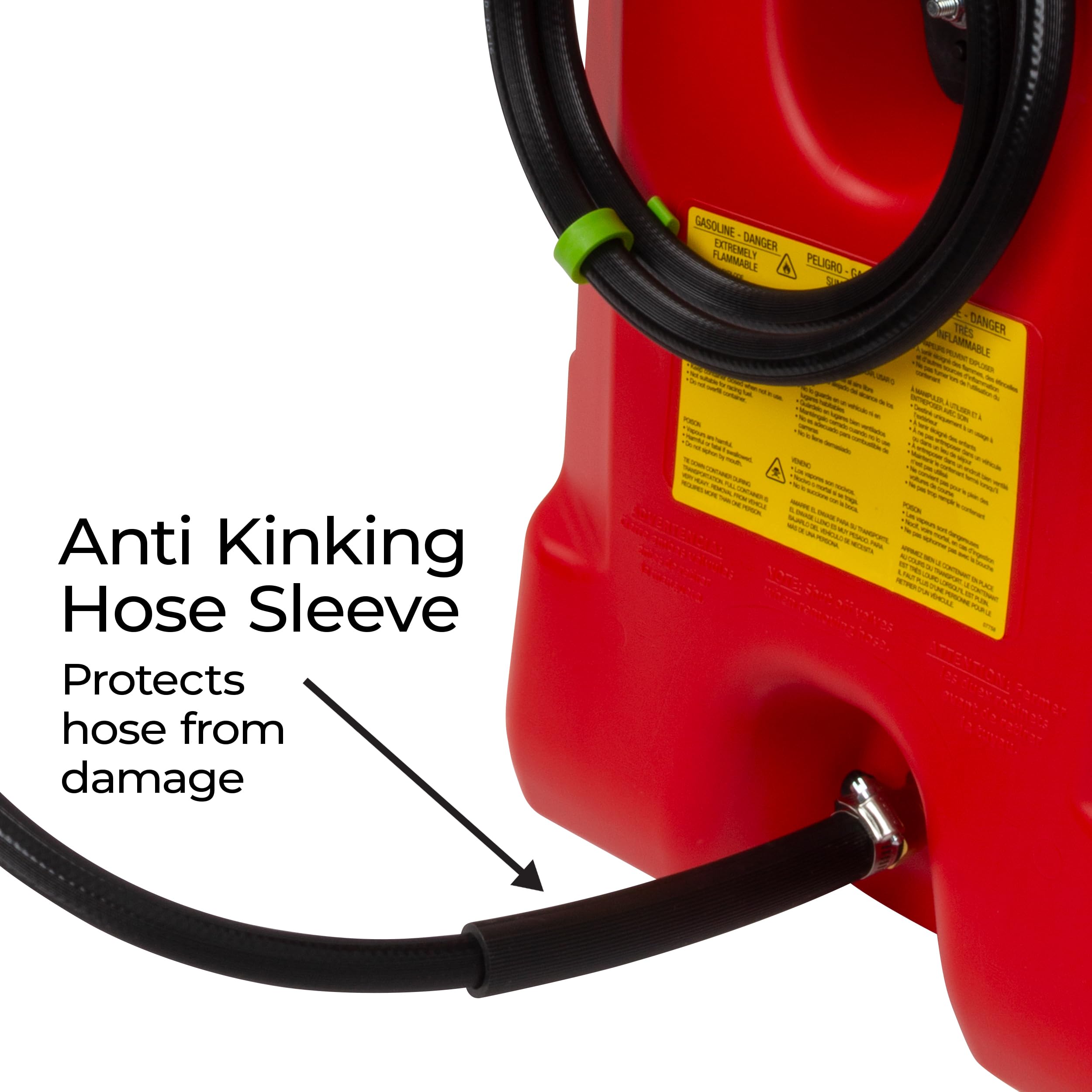 SAFETY FEATURES: Anti-kinking hose sleeve adds prevents damage to the fuel hose at the connection point; Brass shut-off valve provides safe and quick hose disconnection; Spill-proof shut-off mechanism delivers mess-free fueling