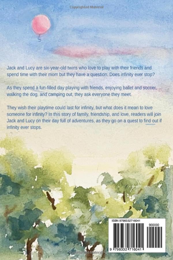 Jack and Lucy are six-year-old twins who love to play with their friends and spend time with their mom but they have a question. Does infinity ever stop? As they spend a fun-filled day playing with friends, enjoying ballet and soccer, walking the dog, and camping out, they ask everyone they meet. They wish their playtime could last for infinity, but what does it mean to love someone for infinity? In this story of family, friendship, and love, readers will join Jack and Lucy on their day full of adventures, as they go on a quest to find out if infinity ever stops.