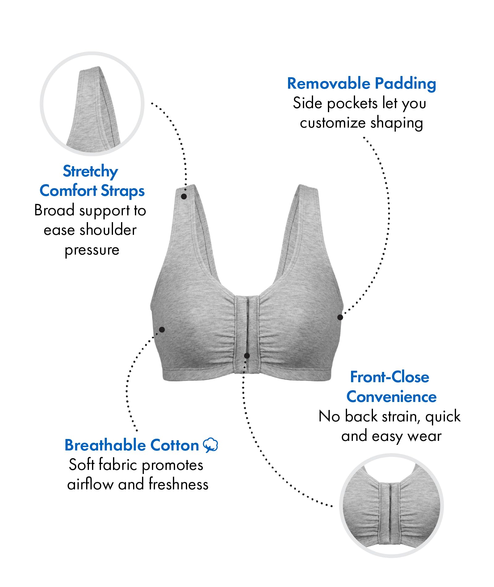 DAILY WEAR. Great to wear post surgery as well as light exercise, this simple bra for women is built with unlined cups for lightweight comfort, and features ruching at the front for added shape.