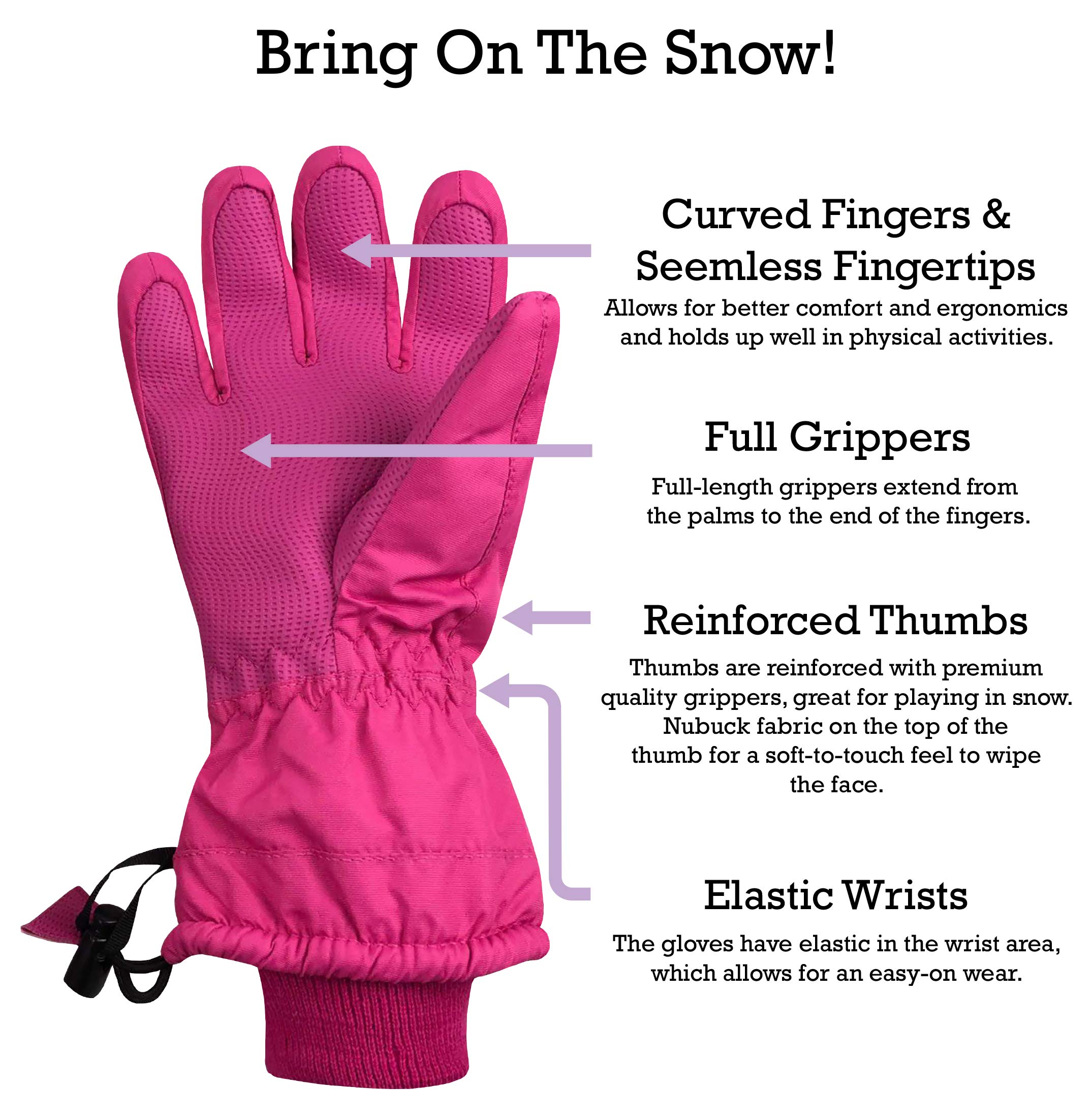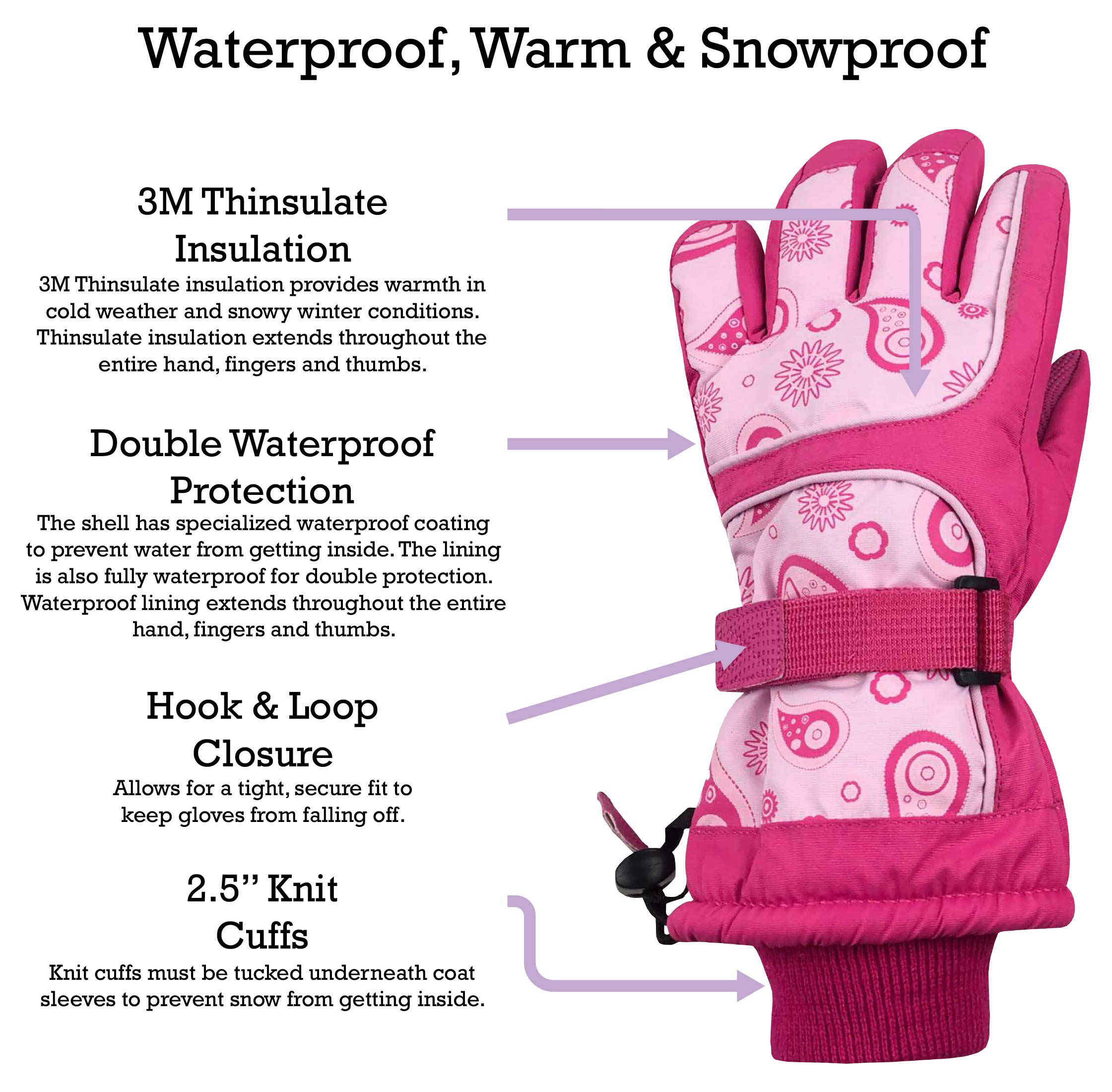 WATERPROOF, WARM AND SNOW-PROOF: The children's snow gloves are insulated with 3M Thinsulate for warmth in cold weather. The youth gloves are fully waterproof and keep hands dry in wet, snowy and icy conditions