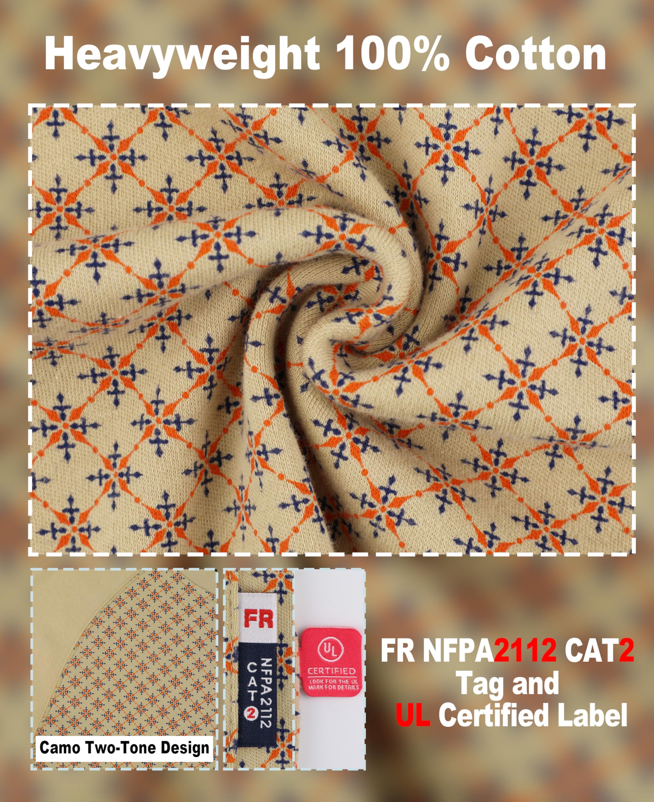 FR MATRIALS:7OZ Cotton Knit FR Treated,FR Buttons,FR Sewing Threads!Clear FR Tag on arms and bottom front.More FR info On Neck Tag About UL Certification.We Attached A Small Sample Inside Package For Cunstomers Simple FR Try