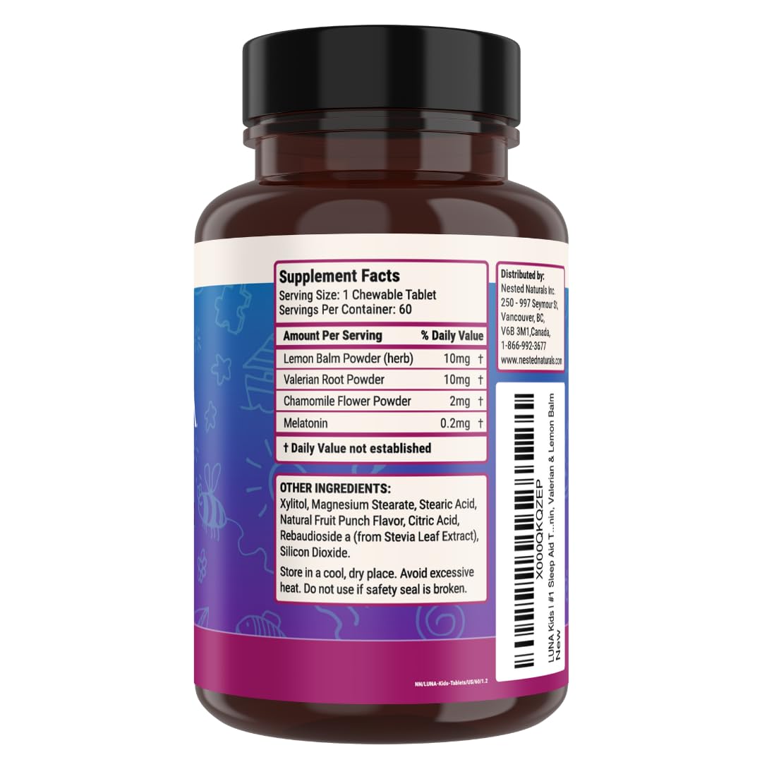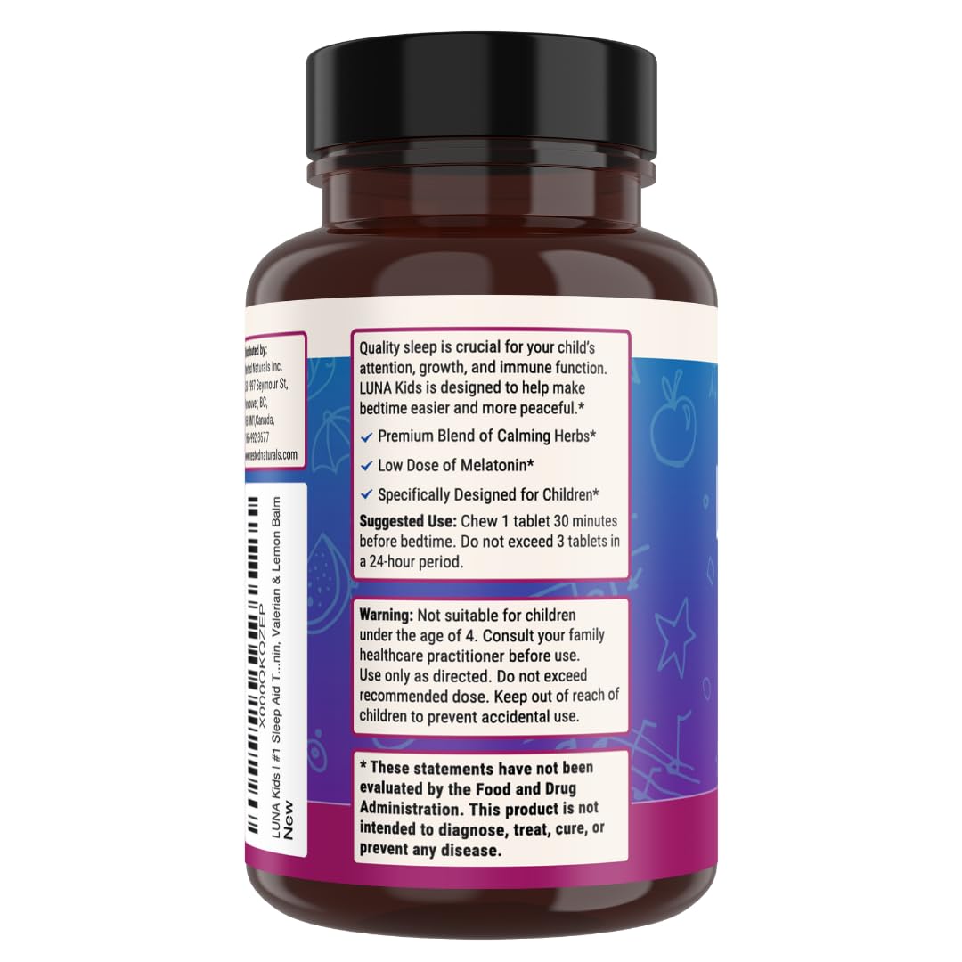 LUNA Kids | #1 Sleep Aid Tablets for Children 4+ and Sensitive Adults | Naturally Sourced Ingredients | 60 x Chewable Pills | Gentle, Herbal Supplement with Chamomile, Melatonin, Valerian & Lemon Balm