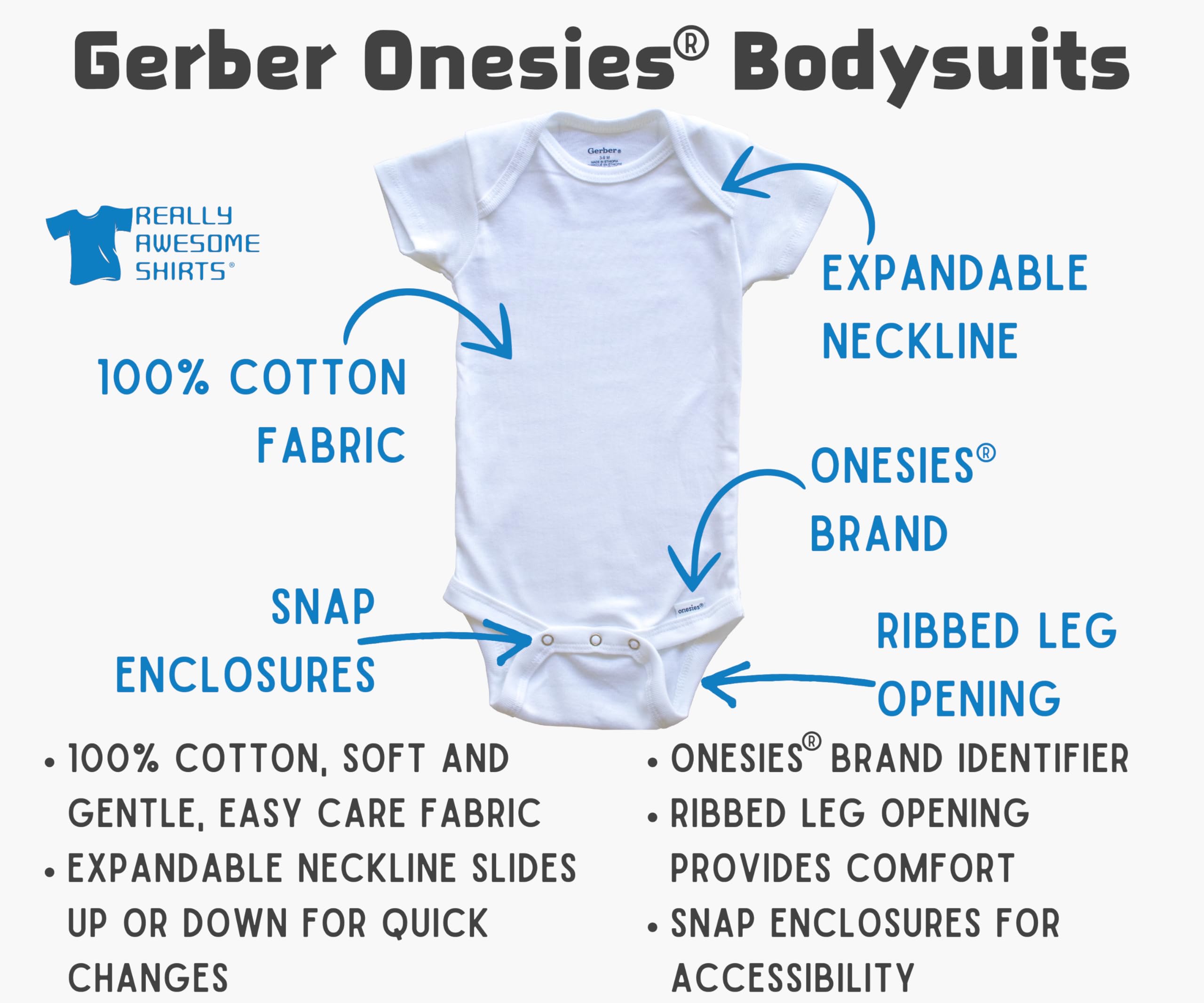 100% cotton Onesies brand baby bodysuit. Printed in the USA using industry leading direct-to-garment printing technology. Machine washable. Water based inks certified to be safe for adults and children, including babies.