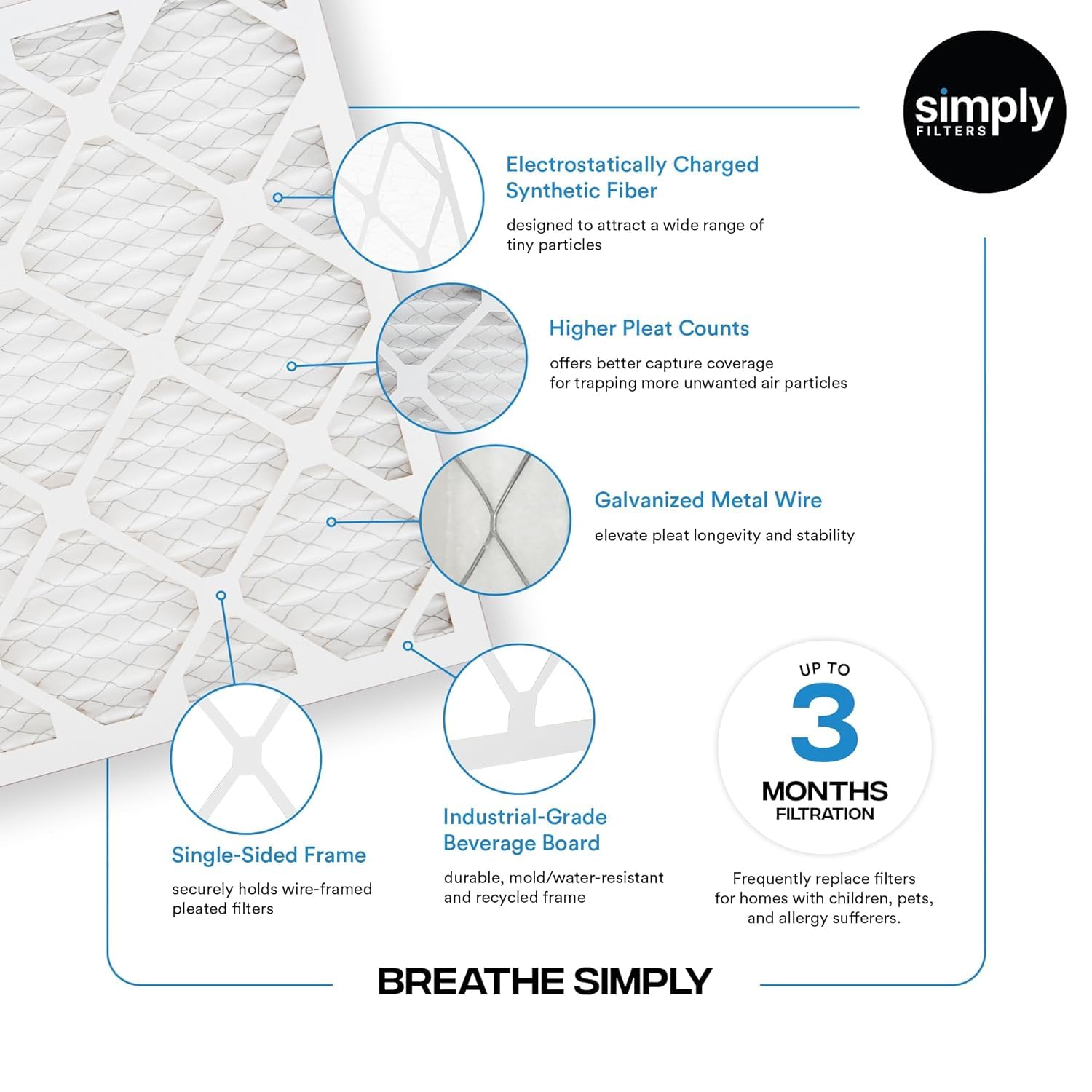Introducing Simply Filters 20"x20"x4" MERV 8 Air Filter, your go-to solution for a healthier indoor environment. This six pack of filters, with an actual size of 19.5"x19.5" x 3.63", is universally compatible, fitting seamlessly into both residential and commercial HVAC systems, working effortlessly with almost any brand. Comparable to renowned brands like 3M Filtrete MPR 600, Filterbuy AFB Silver, and Honey well FPR 5, our filters are designed to create a cleaner environment by capturing airborne particles like dust, pet dander, lint, and pollen, ensuring fresh and clean indoor air. Experience advanced pleated technology with a higher pleat count than most retail filters, enhancing airflow and efficiency. Crafted in the USA with meticulous attention to detail, our filters are ideal for any residential setting, providing long-lasting performance for up to 3 months. Easy to install or replace, whether in air condition units, furnaces, heat pumps, or HVAC systems, simply slide the filter into the slot or follow the airflow arrows for return grills, and you're done! Your order is delivered germ and dust-free, thanks to our heat-sealed shrink wrap packaging. Consider significant savings with our subscription program for convenient auto-deliveries. Plus, experience the excellence of American craftsmanship - every filter is proudly made in the USA using 100% American components, ensuring superior filtration. Trust Simply Filters to exceed your expectations, delivering clean, fresh air for a healthier living and working space.