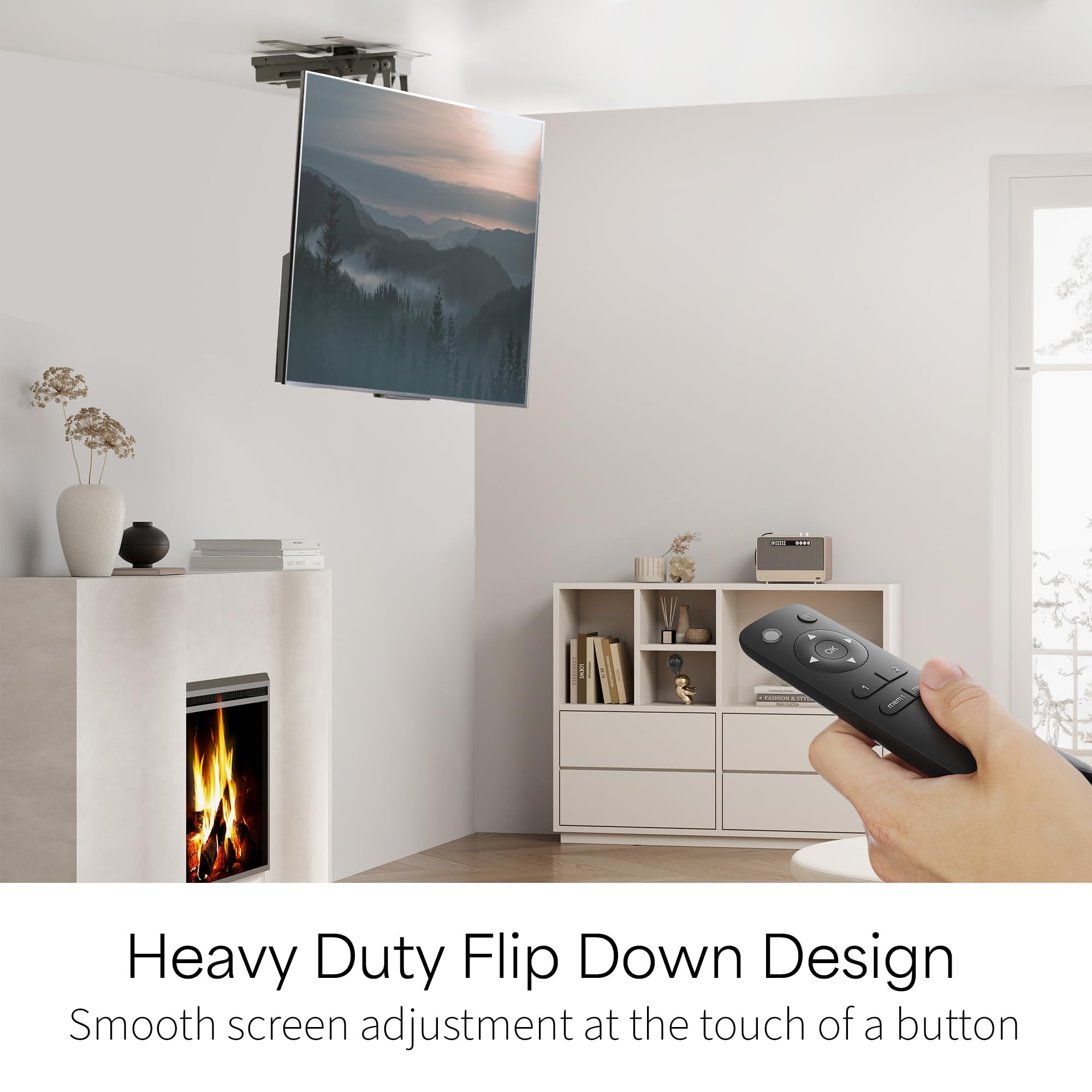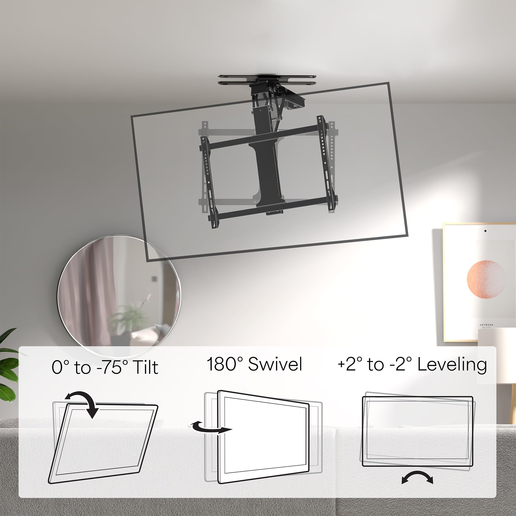 Motorized Height and Swivel: With the included wide range RF remote with 2 programmable memory settings, easily adjust the height, 180° swivel, 0° to -75° tilt, or +2° to -2° screen leveling for optimal viewing angles