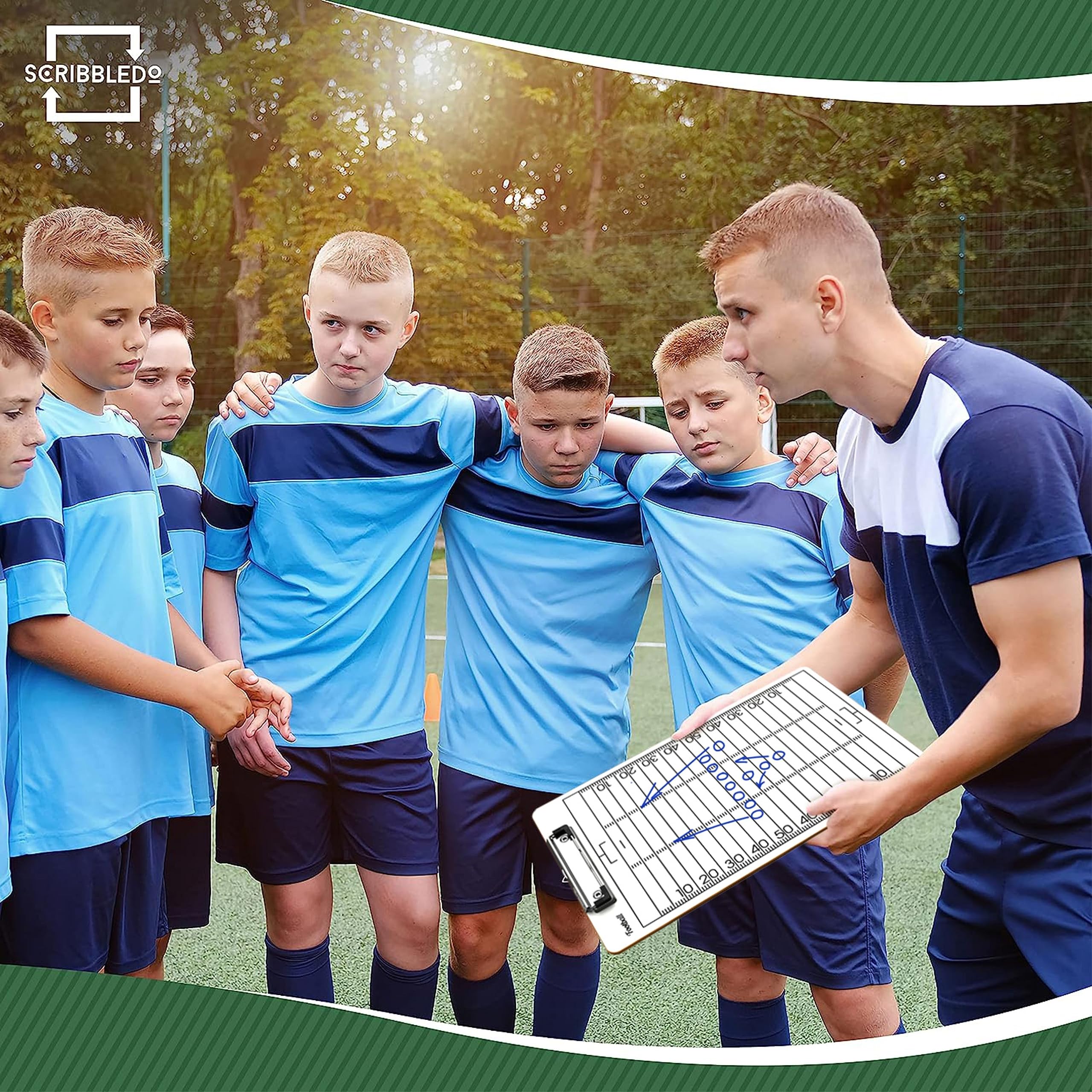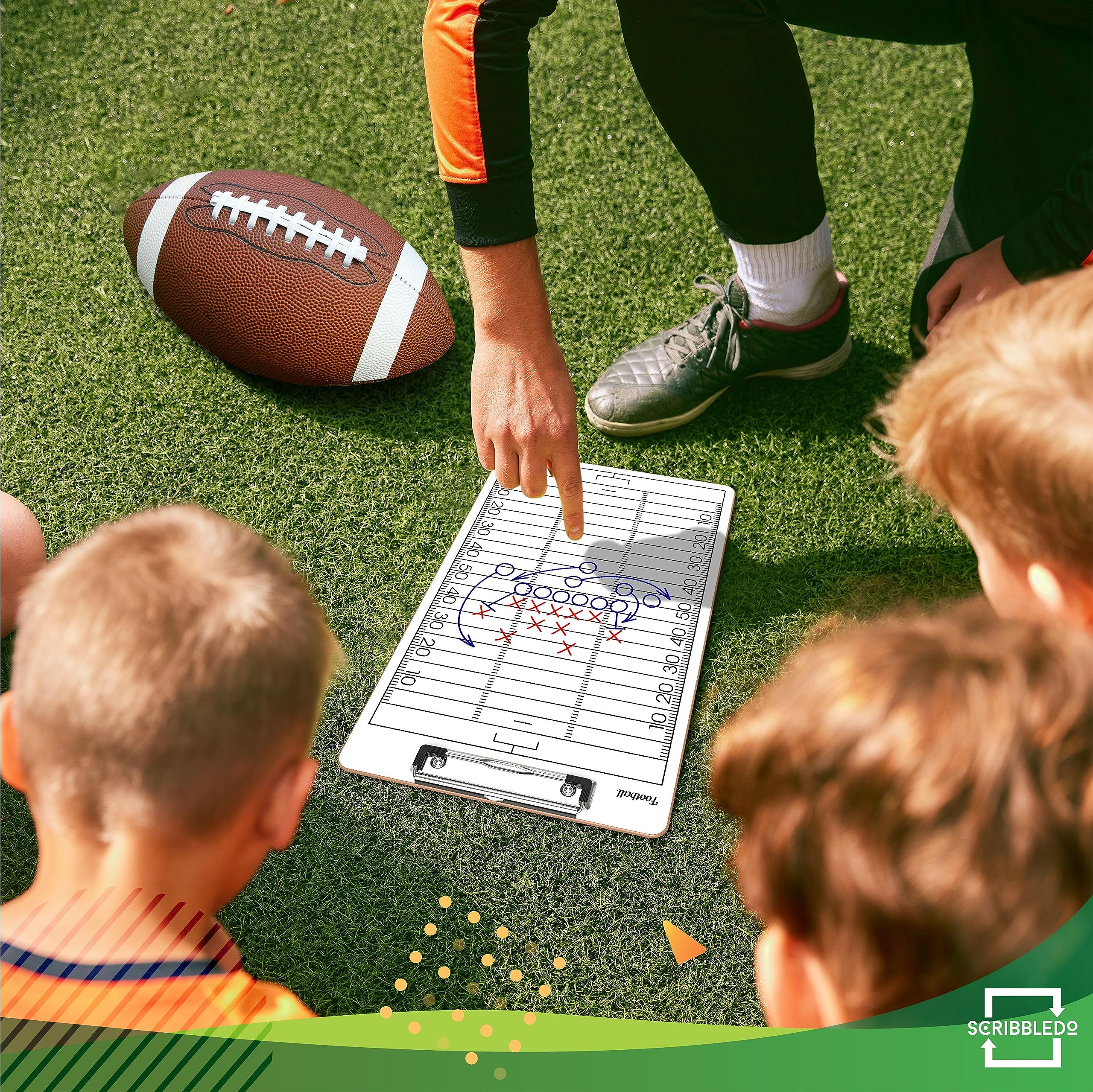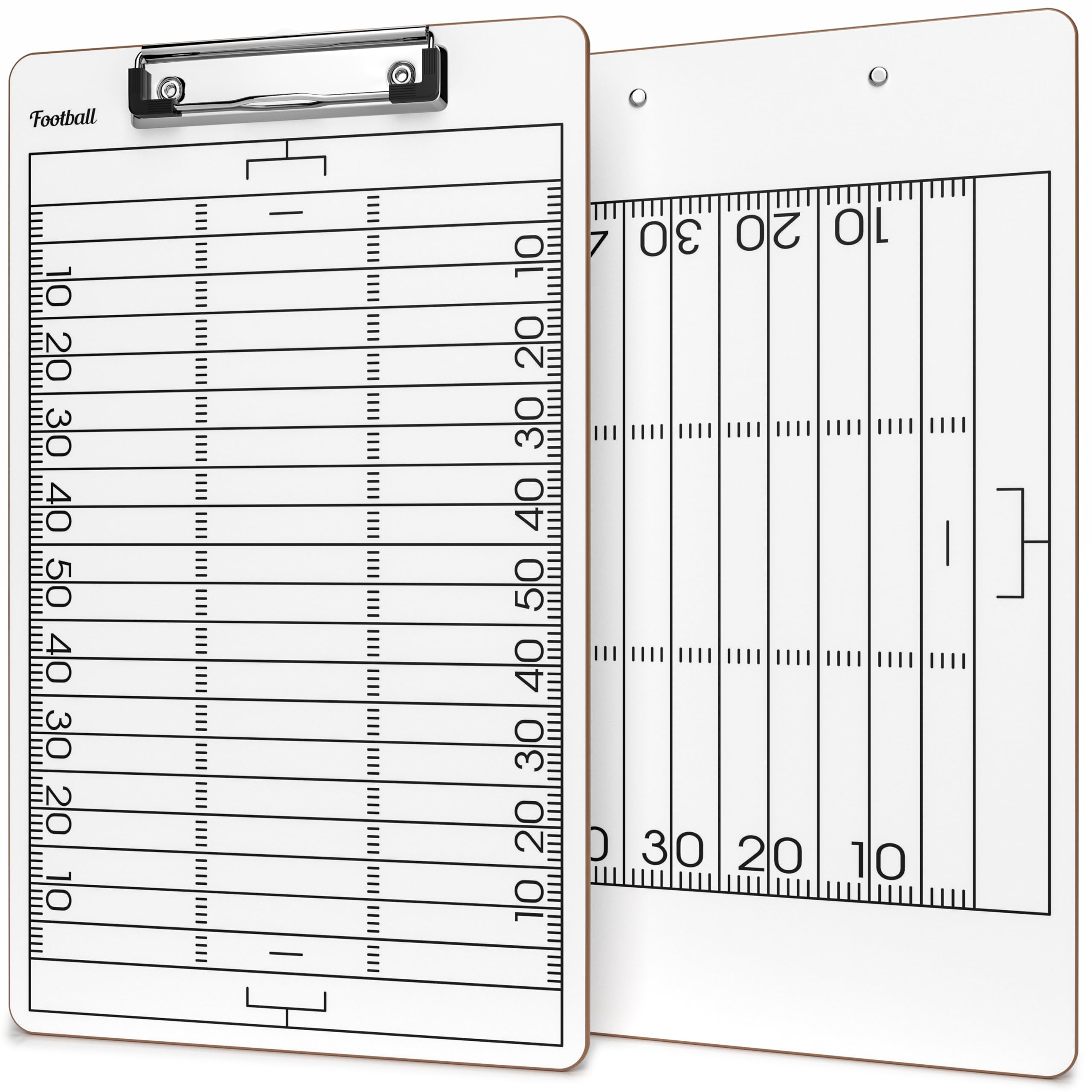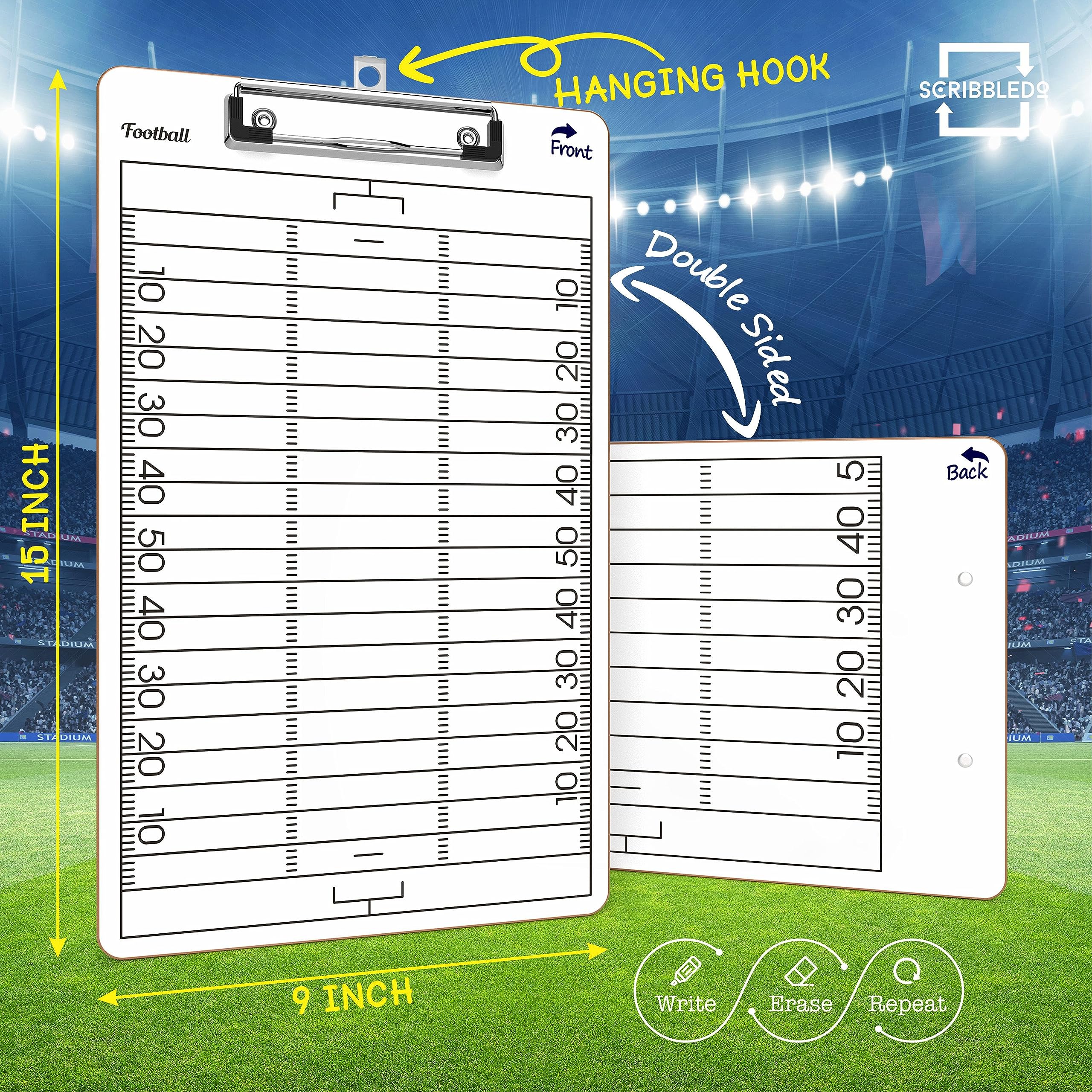 ROBUST & HIGH QUALITY - Our Whiteboard football dry erase coaching board has a smooth surface for easy writing and wiping, its waterproof, durable, long-lasting and high quality. Unlike other football clipboards that can be ruined by rain, dust, sweat or wear and tear. DOUBLE-SIDED DESIGN - This dry erase football coaching accessories are double sides with a full court on the front and a score board on the backside to help coaches get a clear picture of the full football play board. ULTIMATE COACHING TOOL - Our football clipboard dry erase for coach makes it easy to communicate, organize and optimize game plans and strategy throughout the game. White board Football training Perfect for football coach gifts for men. ERGONOMIC DESIGN - Our extra-large football accessories whiteboard for coaches is a must have on the field. VERSATILE USAGE - You can utilize this football score book for coaches to strategize for multiple sports, including softball, and many other games.