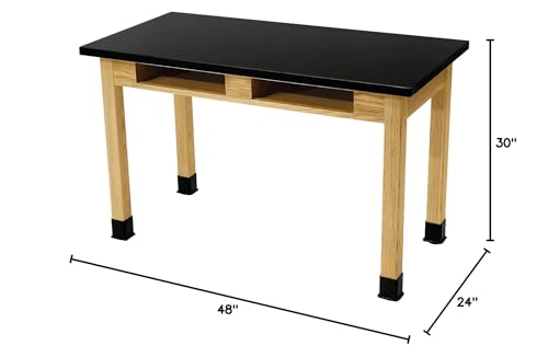 The NPS SLT Science Lab Tables with Book Compartments have "perfect chemistry" with any science classroom. These paragons of endurance are built with solid ash framework, side panels and legs beneath a thick "Chem-Res" tabletop with a MDF core. The work surface is of solid black, firmly secured, high-pressure laminate, proof to water and 13 commonly-used laboratory chemicals. Includes two storage compartments with the option of concealment with the included side-panel aprons. Robust legs are spot-welded to the frame with metal-on-metal double-bolts on 13-gauge steel corner braces for maximal strength and durability. Feet are outfitted with rubber liquid-protective boots and adjustable glides for accurate floor leveling. The SLT meets MAS Certified Green environmental industrial standards. Features: - Material: Solid ash legs and apron; chem-res high-pressure laminate top on a 1" thick core - Finish: Black - Legs attach with metal on metal double bolt through assembly on 13-gauge steel corner braces - Rubber liquid protecting boots Specifications: - Product Dimensions: 30"H x 24"W x 48"D - Product Weight: 66 lbs - Weight Capacity: 500 lbs - Assembly Required: Yes