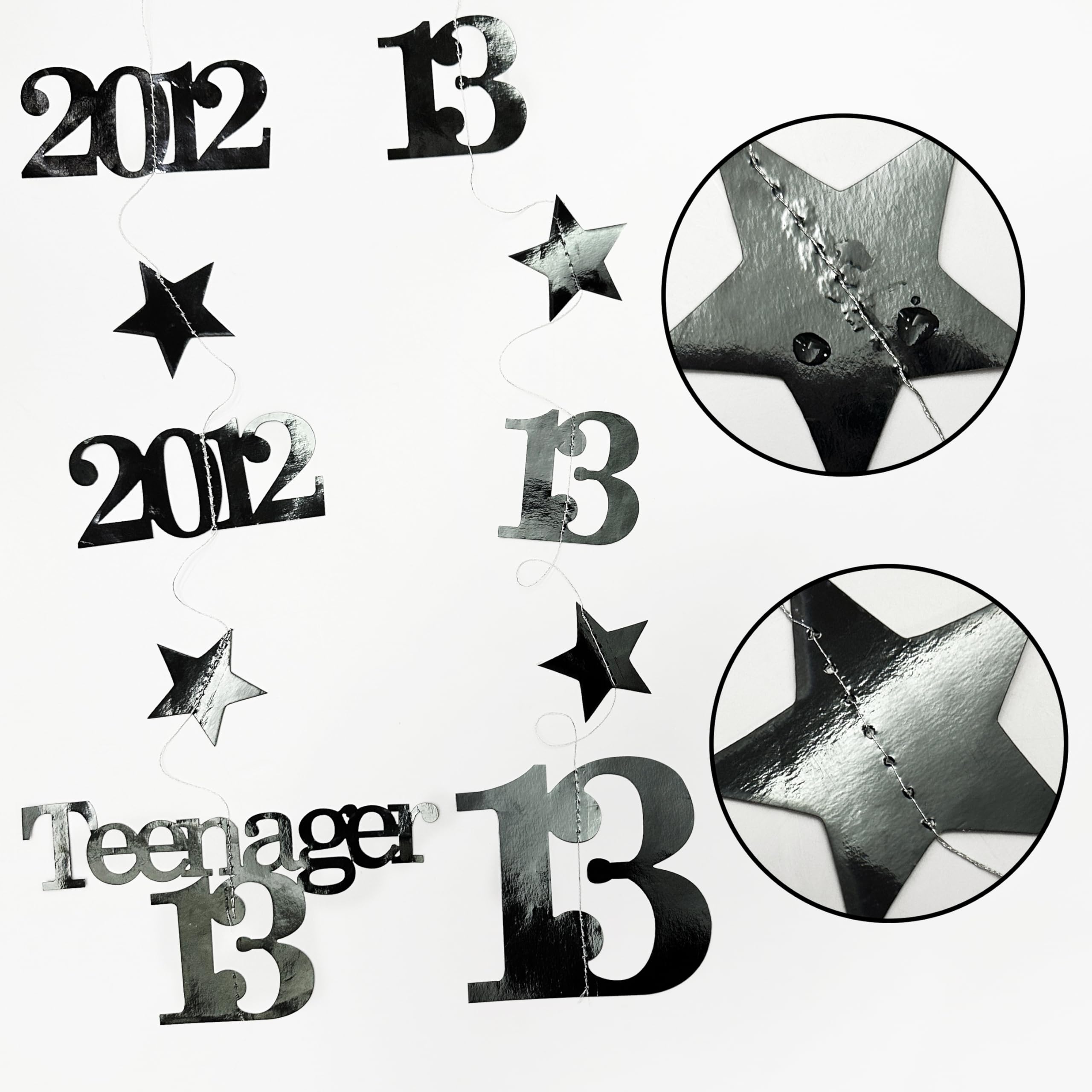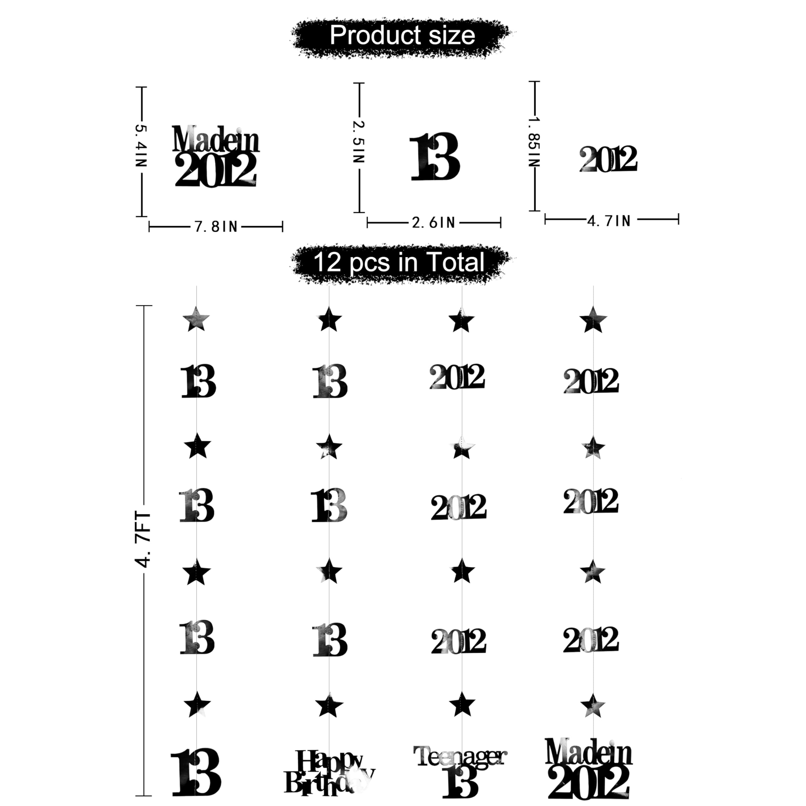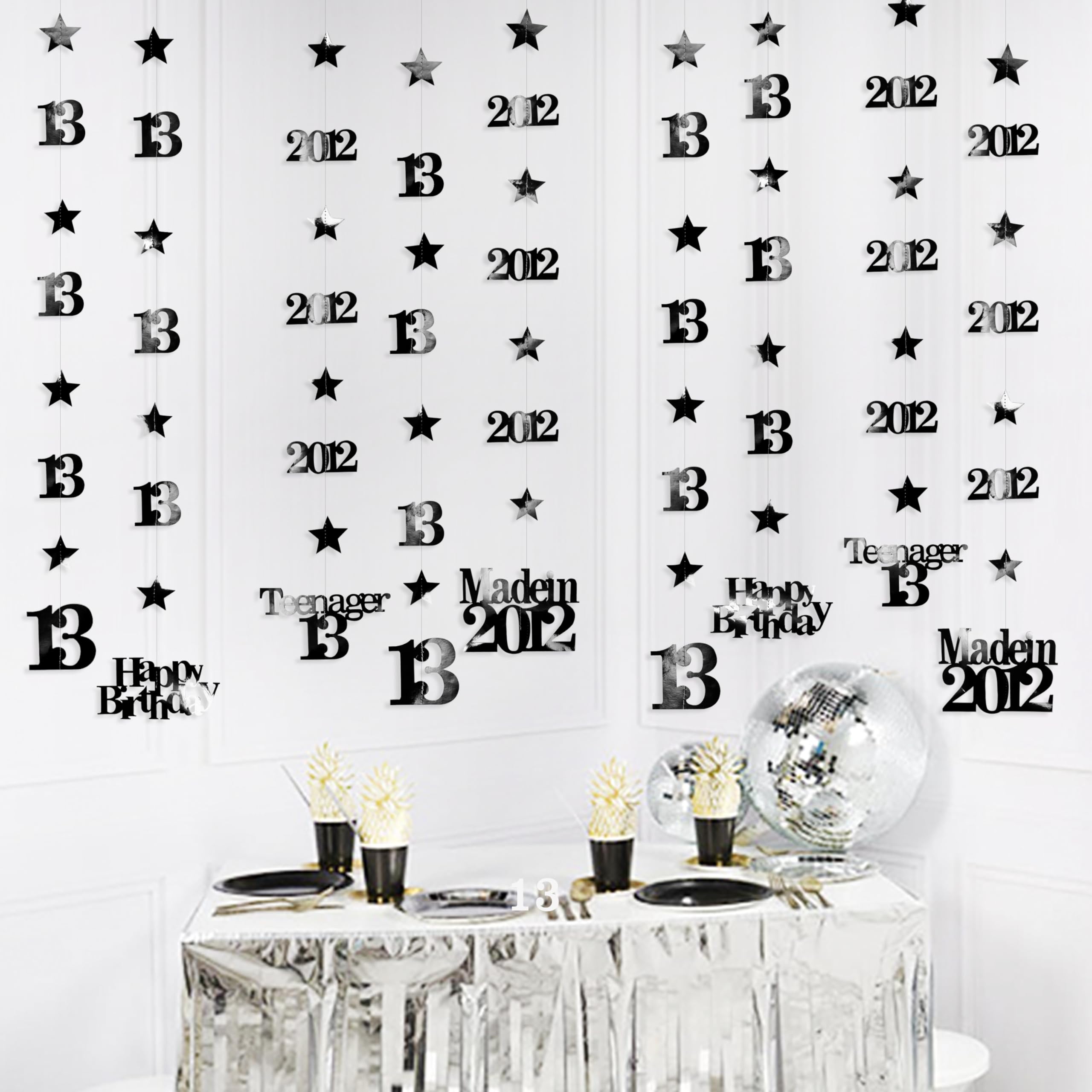 👍 Package includes - 12 strings of metallic black 13th birthday theme sparkling twinkle star garlands with 13, Happy Birthday, Teenager 13 and Made in 2012 cutouts (in 4 styles) , each string is 4.7 feet/1.45 meters, totally is 56.4 feet/17 meters.