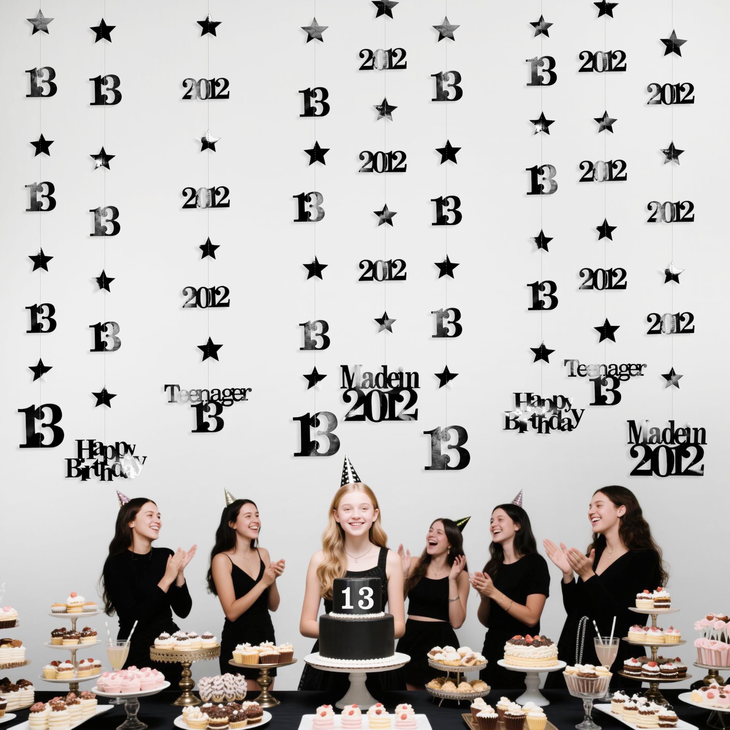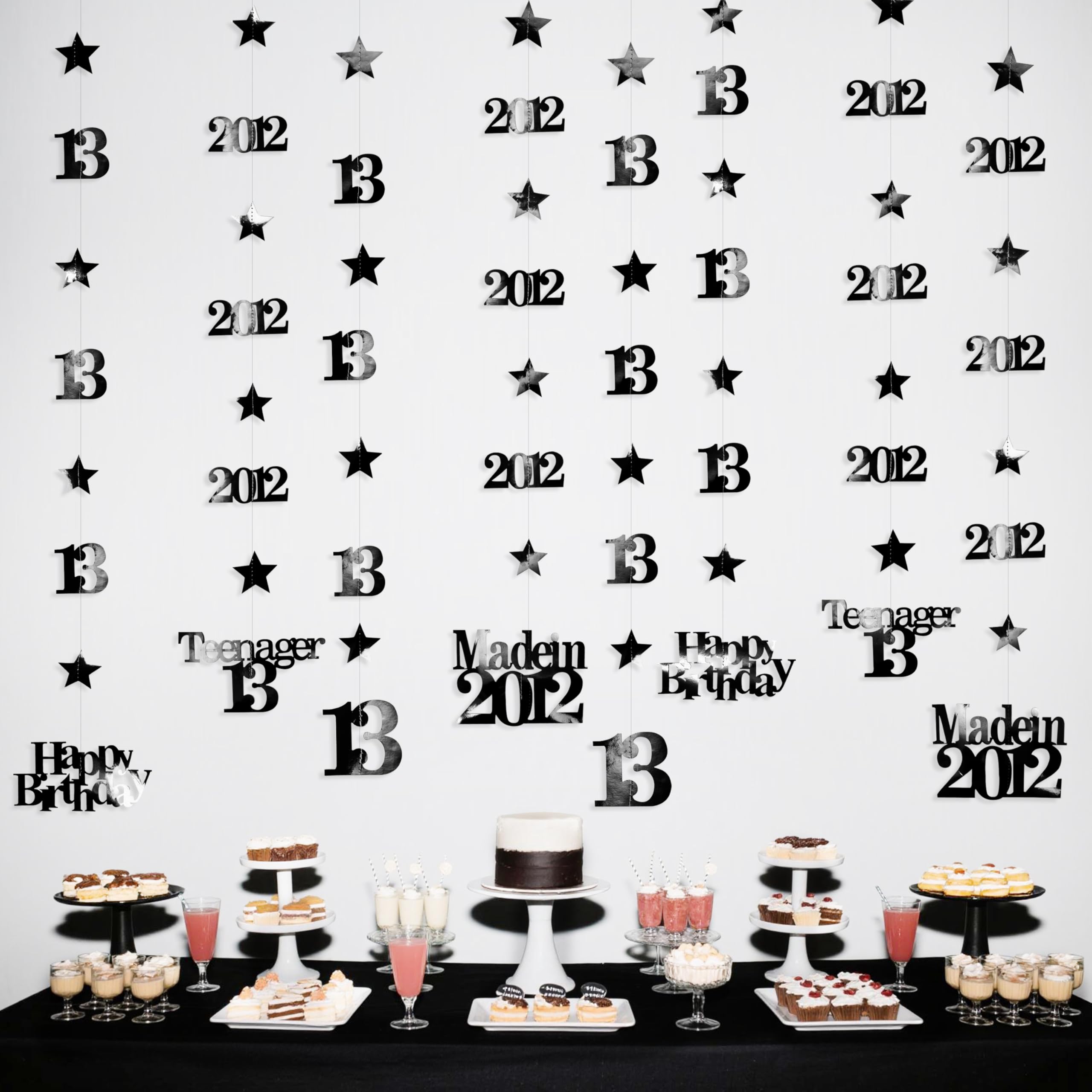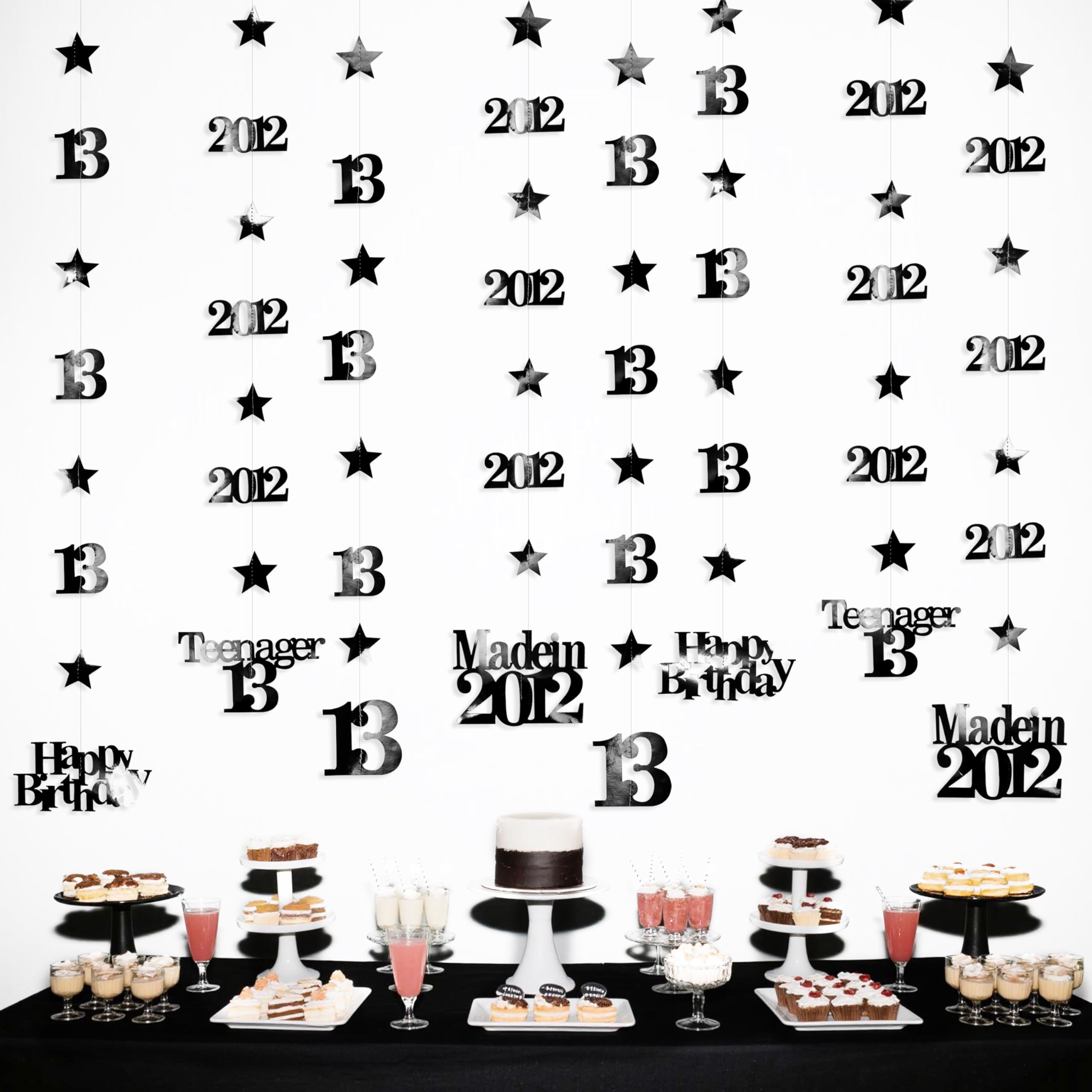 👍 Package includes - 12 strings of metallic black 13th birthday theme sparkling twinkle star garlands with 13, Happy Birthday, Teenager 13 and Made in 2012 cutouts (in 4 styles) , each string is 4.7 feet/1.45 meters, totally is 56.4 feet/17 meters.
