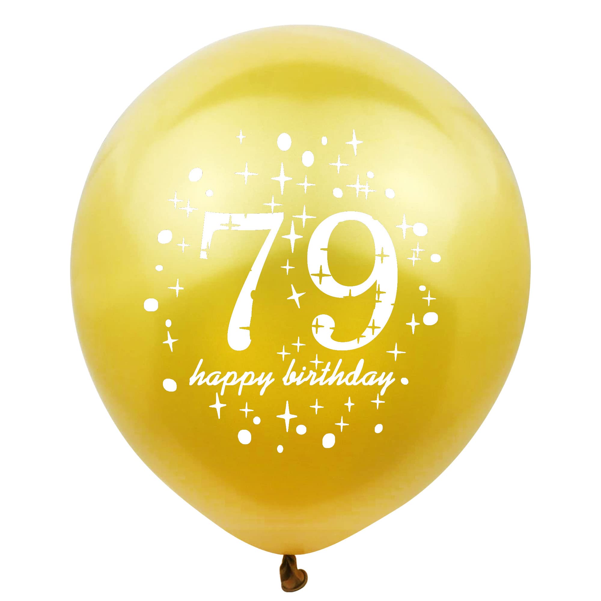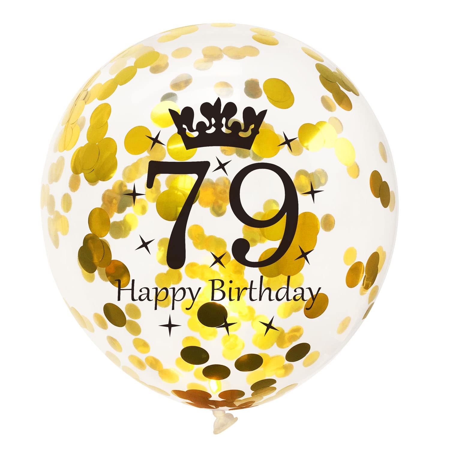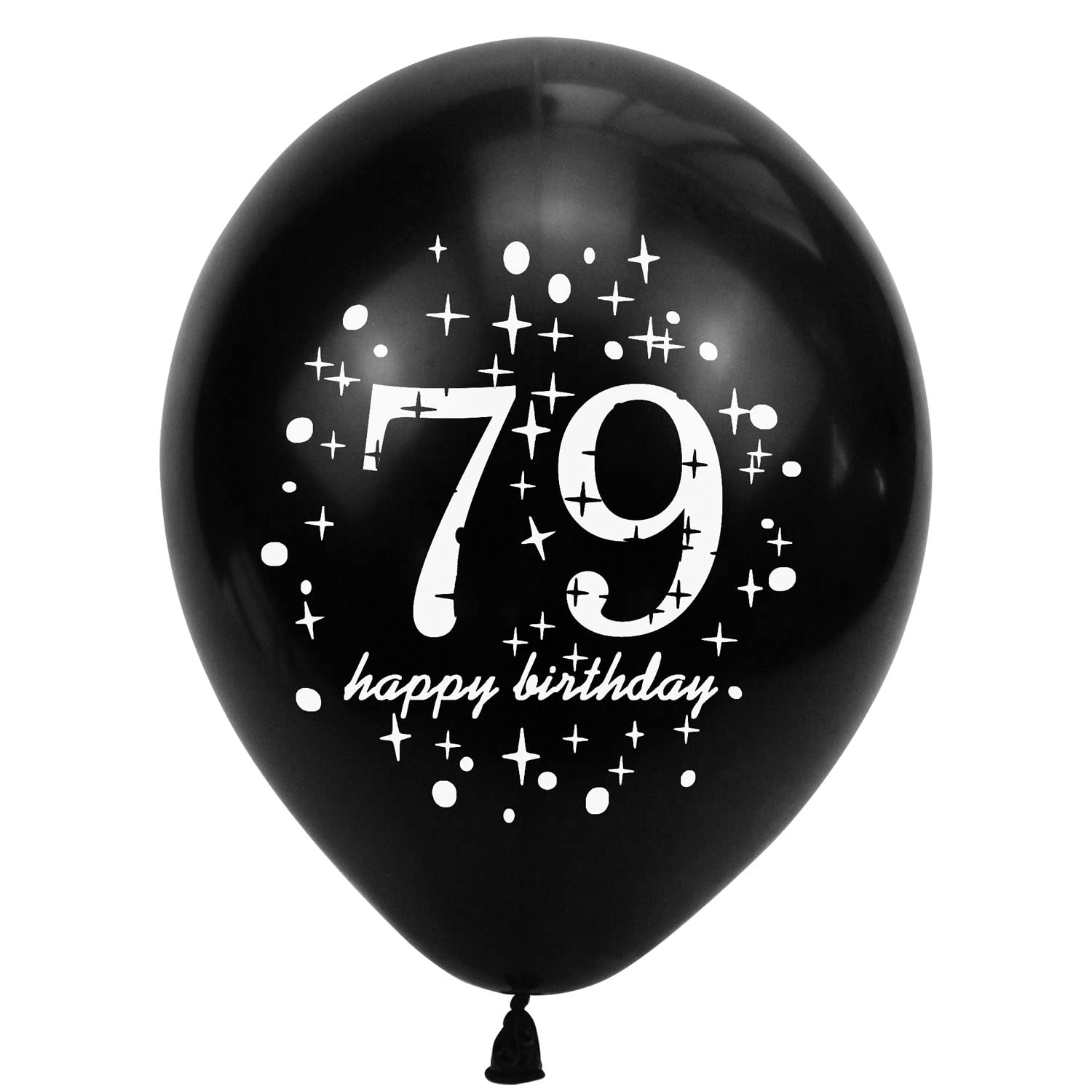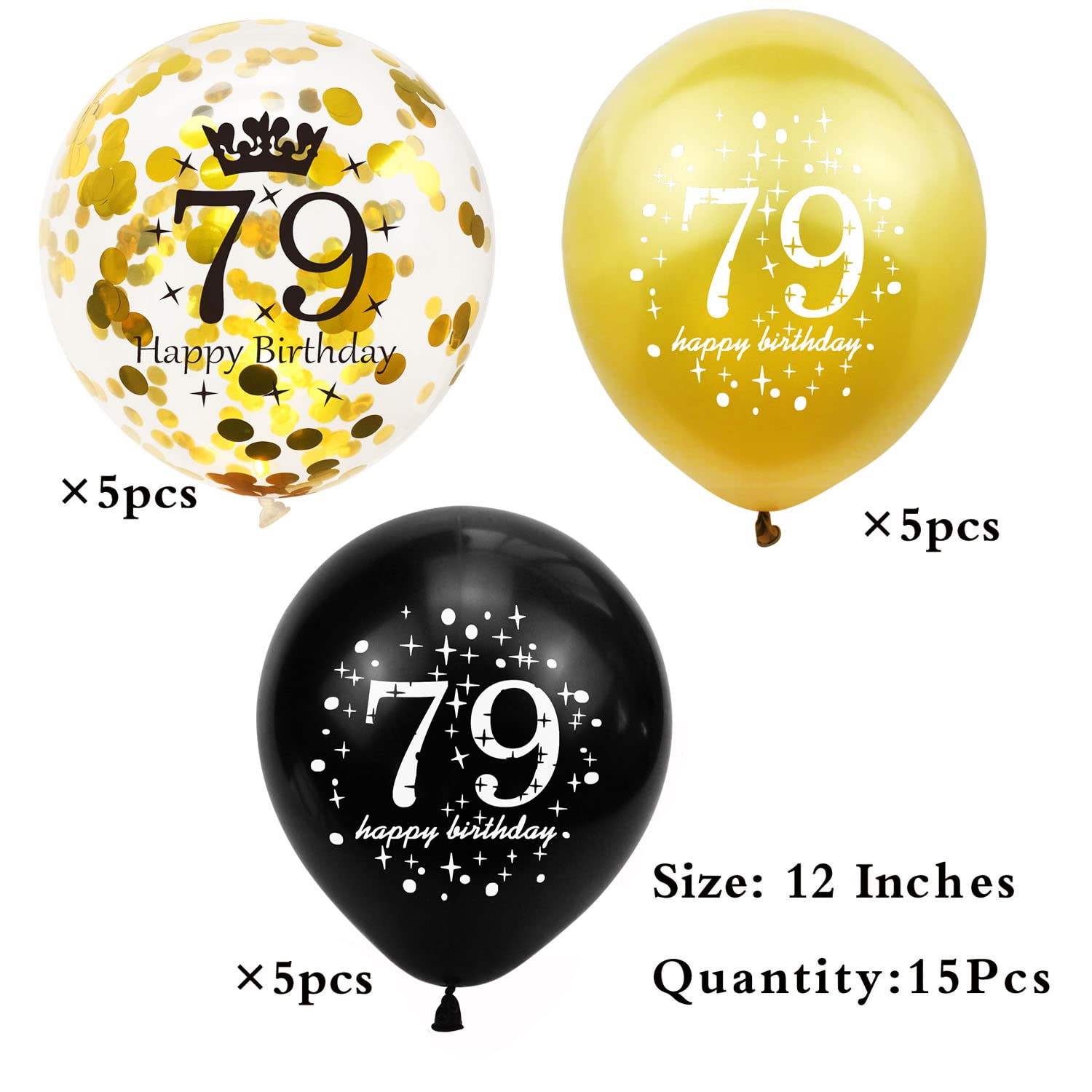 Package:5 pieces 12 inch black latex balloon printed with the words "79 Happy Birthday",5 pieces 12 inch gold latex balloon printed with the words"79 Happy Birthday",5 piece 12 inch gold confetti balloons printed with the words"79 Happy Birthday", very suitable for women men 79th birthday party decorations