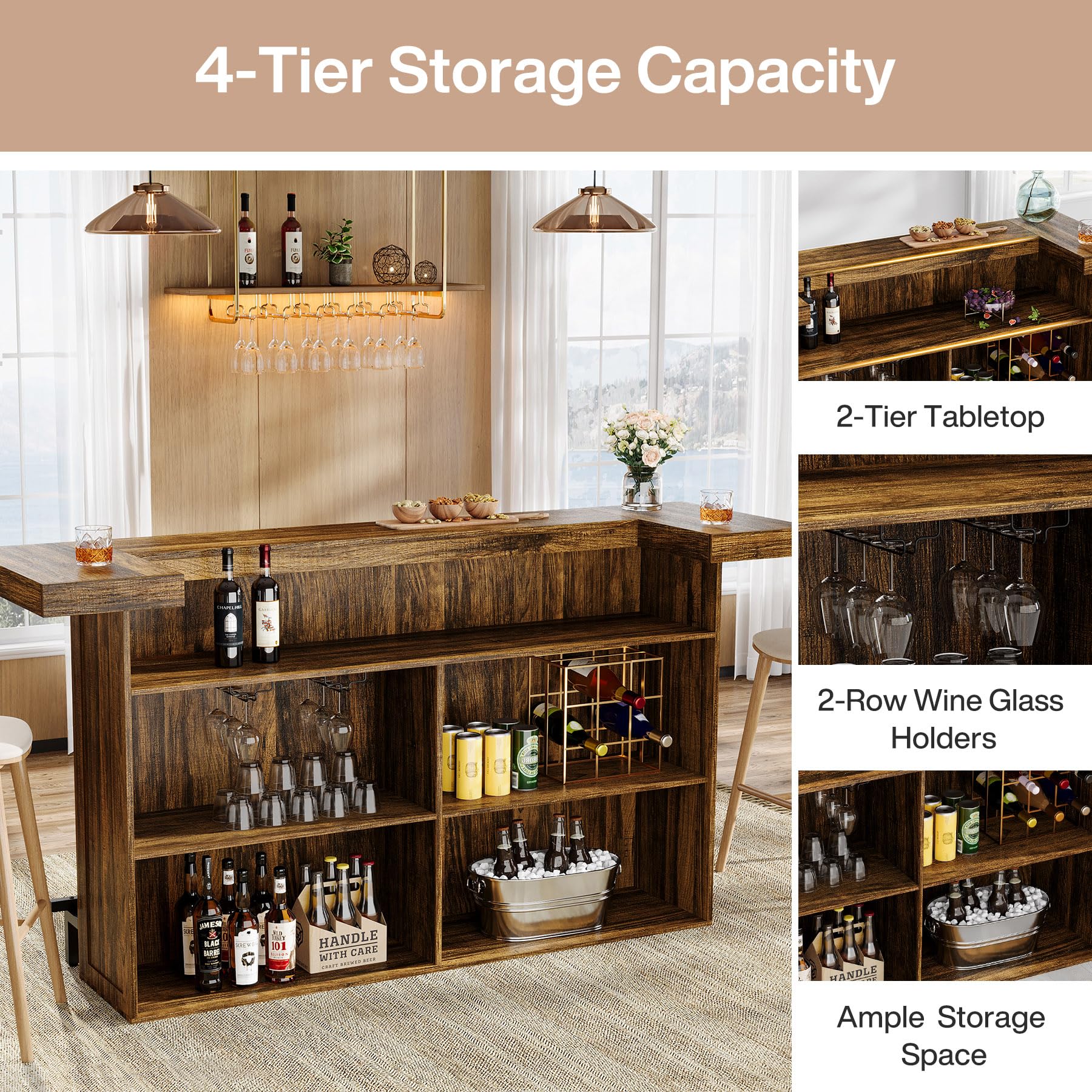 Spacious 4-Tier Design: This bar table features 4-tier storage space with multiple compartments, providing ample space to place your wine glasses, glassware, bar accessories and other necessities, allowing for easy access while enabling neat organization