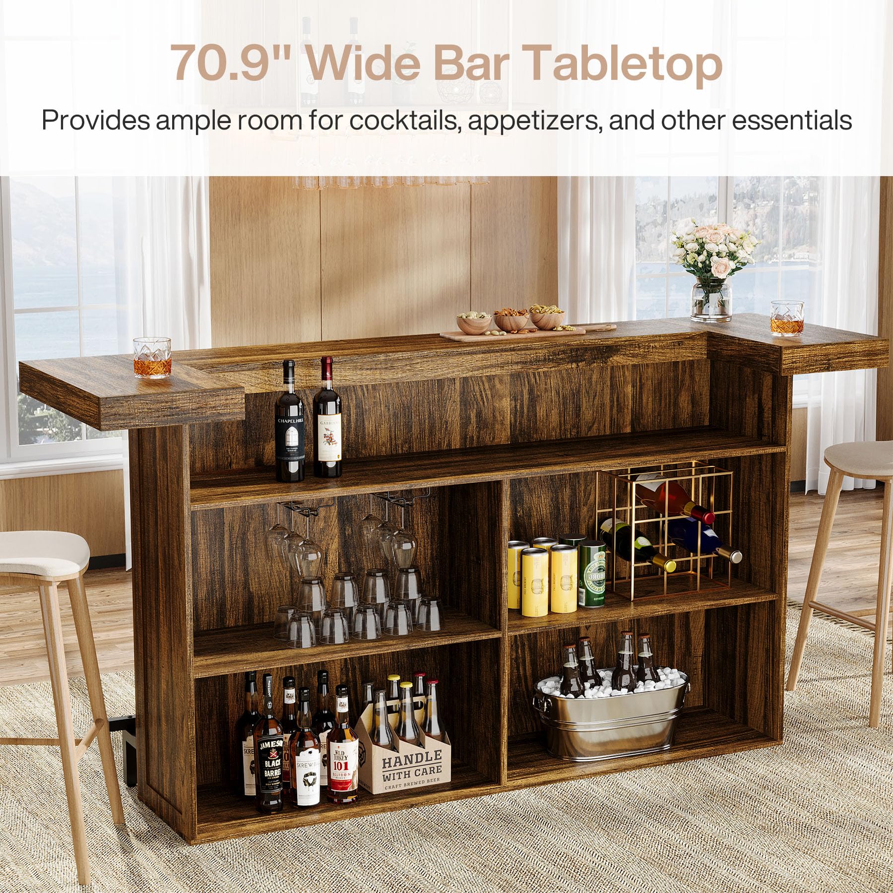 Large Countertop Space: The 70.9-inch wide countertop provides a spacious surface to prepare drinks, serve snacks or display decorations. You can easily place multiple cocktail shakers, glasses and ingredients on it without feeling crowded