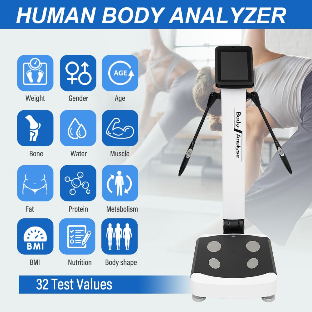 【INTELLIGENT BODY COMPOSITION ANALYZER OUTPUTS THE FOLLOWING DATA】: Body Moisture, Protein, Minerals, Body Fat, Weight, Fat Free Mass, Skeletal Muscle Bmi、 Body Fat Percentage, Waist Hip Fat Ratio, Water Content Ratio, Segmental Muscles (Left/Right Upper/Lower Limbs, Trunk), Segmental Fat (Left/Right Upper/Lower Limbs, Trunk), Visceral Fat Index, Body Shape Assessment, Nutritional Assessment, Weight Assessment, Obesity Assessment, Target Weight, Weight Control, Fat Control, Muscle Control, Basal Metabolism, Health Assessment, Body Age.