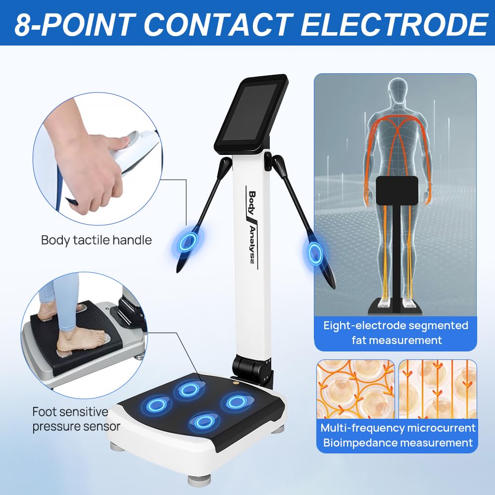 【ACCURATEMEASUREMENT】:Body Scanner Analyzer Body Fat 8-Point Contact Electrode Sheet,Accurate Measurement Ofwhole Body Data,Body Fat Measurement Device Utilizing The Structural Characteristicsof The Human Bodythe Handle And Pedal Are Respectively Equipped With Two Current Andvoltage Electrodes Fixed Testing Points Thereby Improving Therepeatability And Accuracy Of Measurements