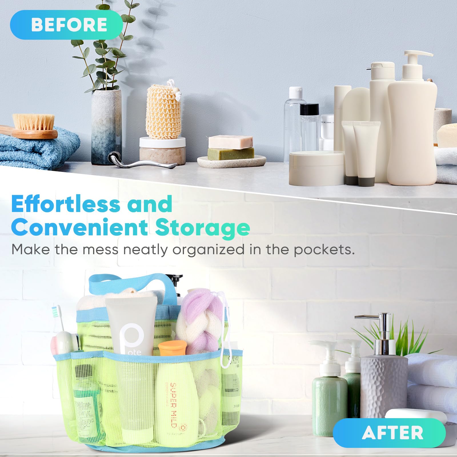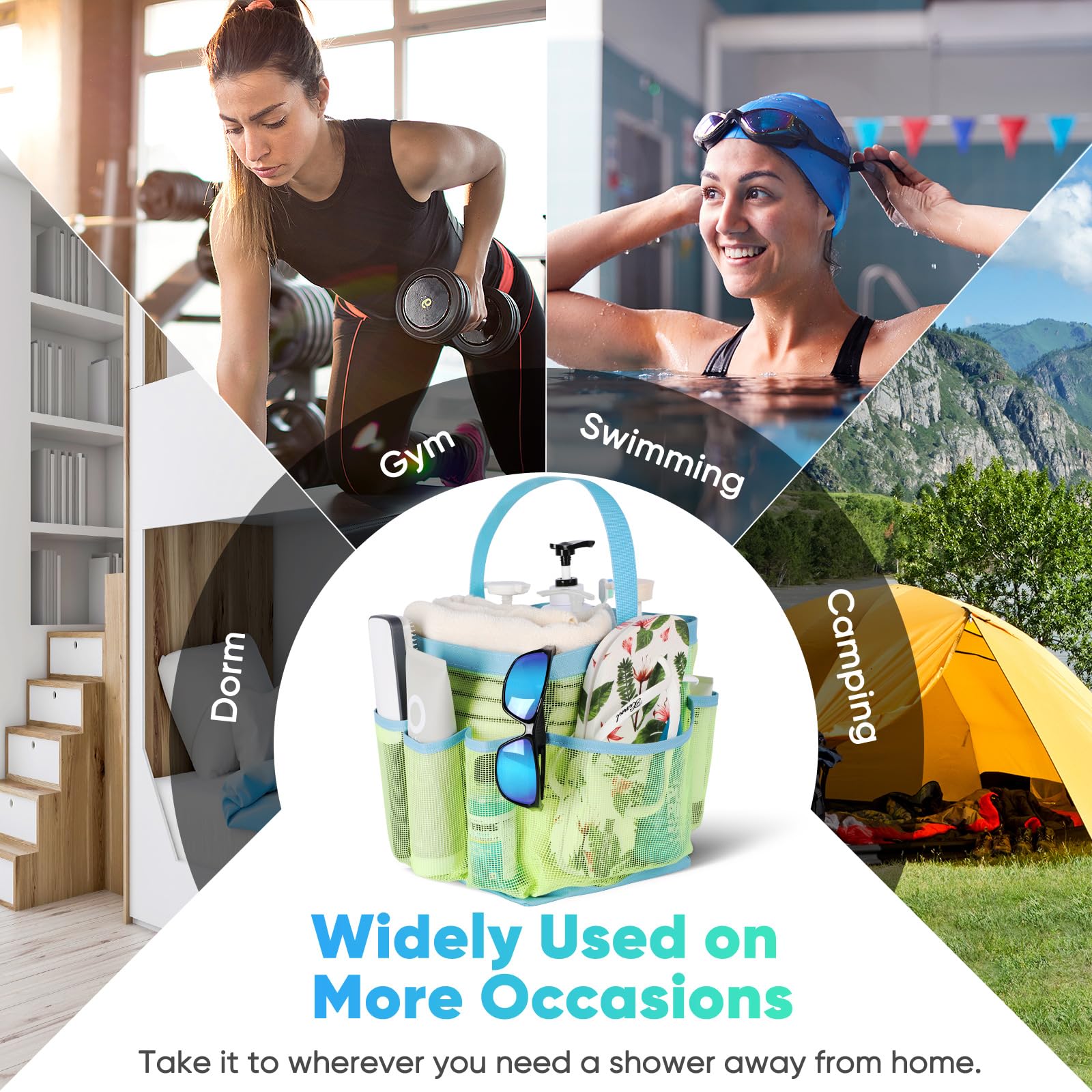 Quick Dry, Easy Clean:Quickly get access to the needed item stored in the portable shower caddy. Breathable mesh fabric is the perfect choice for shower bags, which drains water away easily and dries up quickly. Wash and dry the shower bag at any dry and ventilated place to prolong the lifespan.