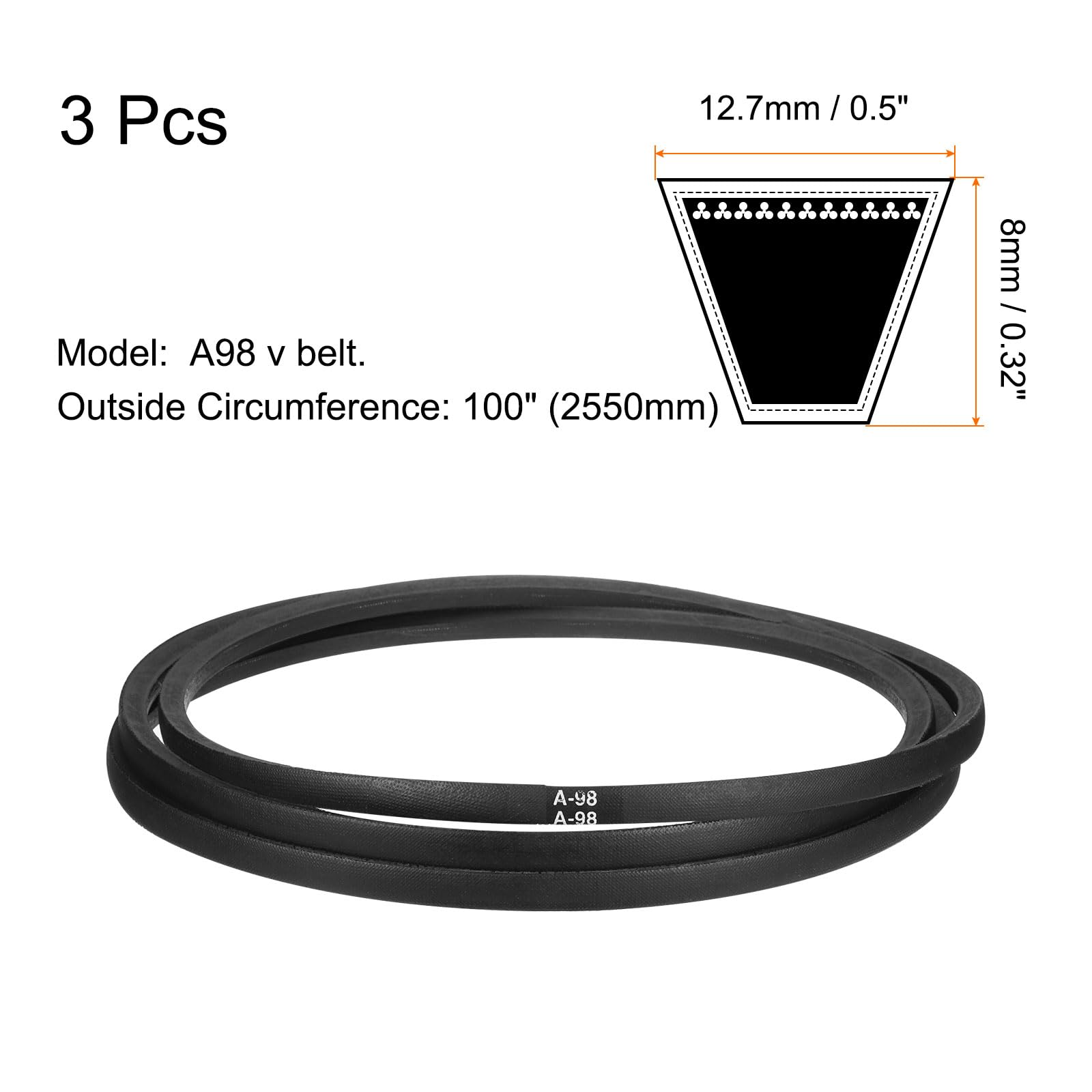 Model: A98 or 4L1000 v belt. Inner Circumference: 98" (2500mm); Outside Circumference: 100" (2550mm).