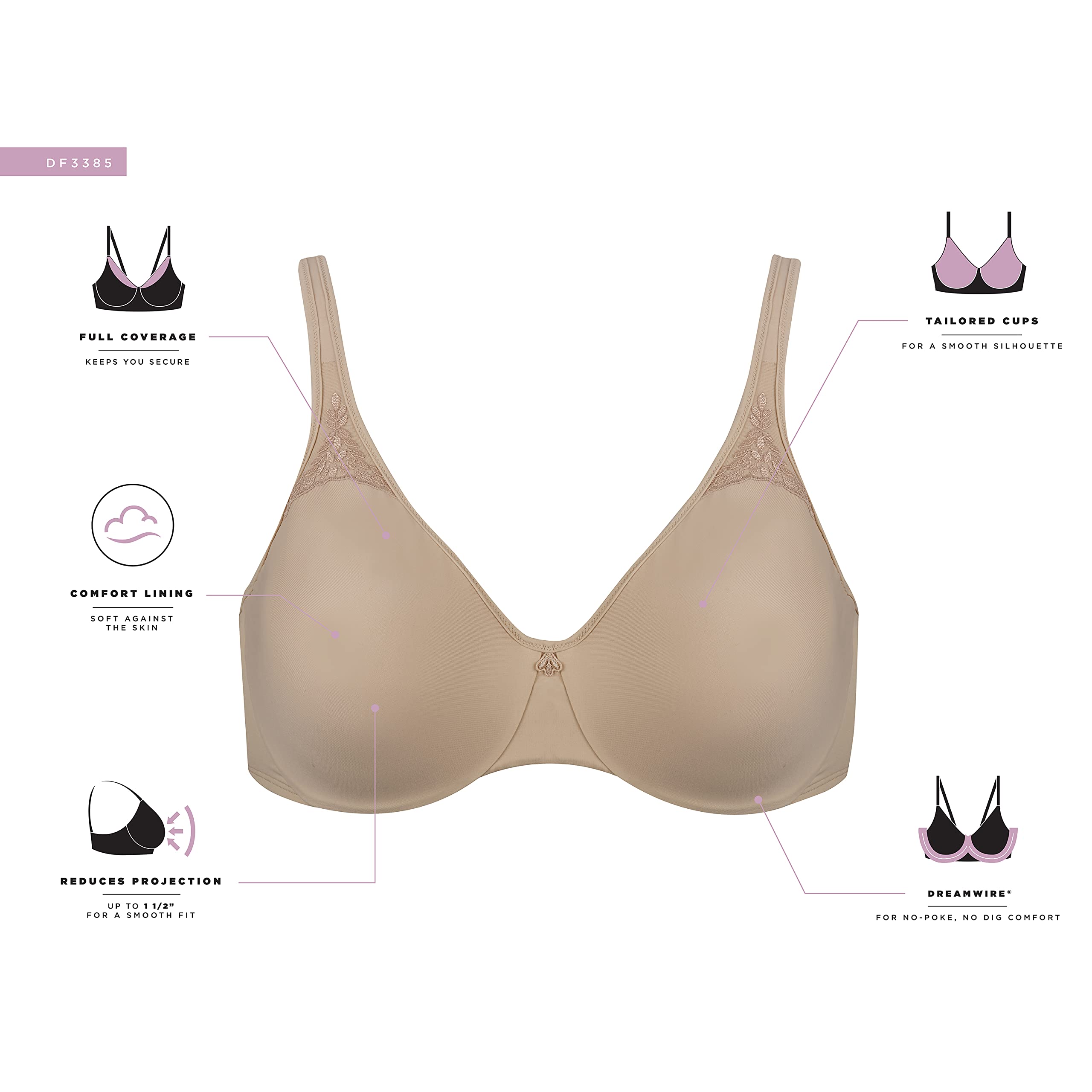 Description If you’re searching for a minimizer bra that delivers both comfort and results, meet the Bali® Passion for Comfort® Underwire Minimizer Bra. This full-coverage style is designed to reduce your bustline by up to 1.5 inches, so your clothes fit better while you still enjoy softness and support. Hidden underwires provide gentle lift, while the smooth, seamless cups virtually disappear under tees, knits, and button-downs. Lightweight fabric feels silky against your skin and creates a sleek silhouette that’s perfect for everyday wear. Adjustable straps and a hook-and-eye back closure give you a customized fit, while lace details at the straps add a touch of feminine style.