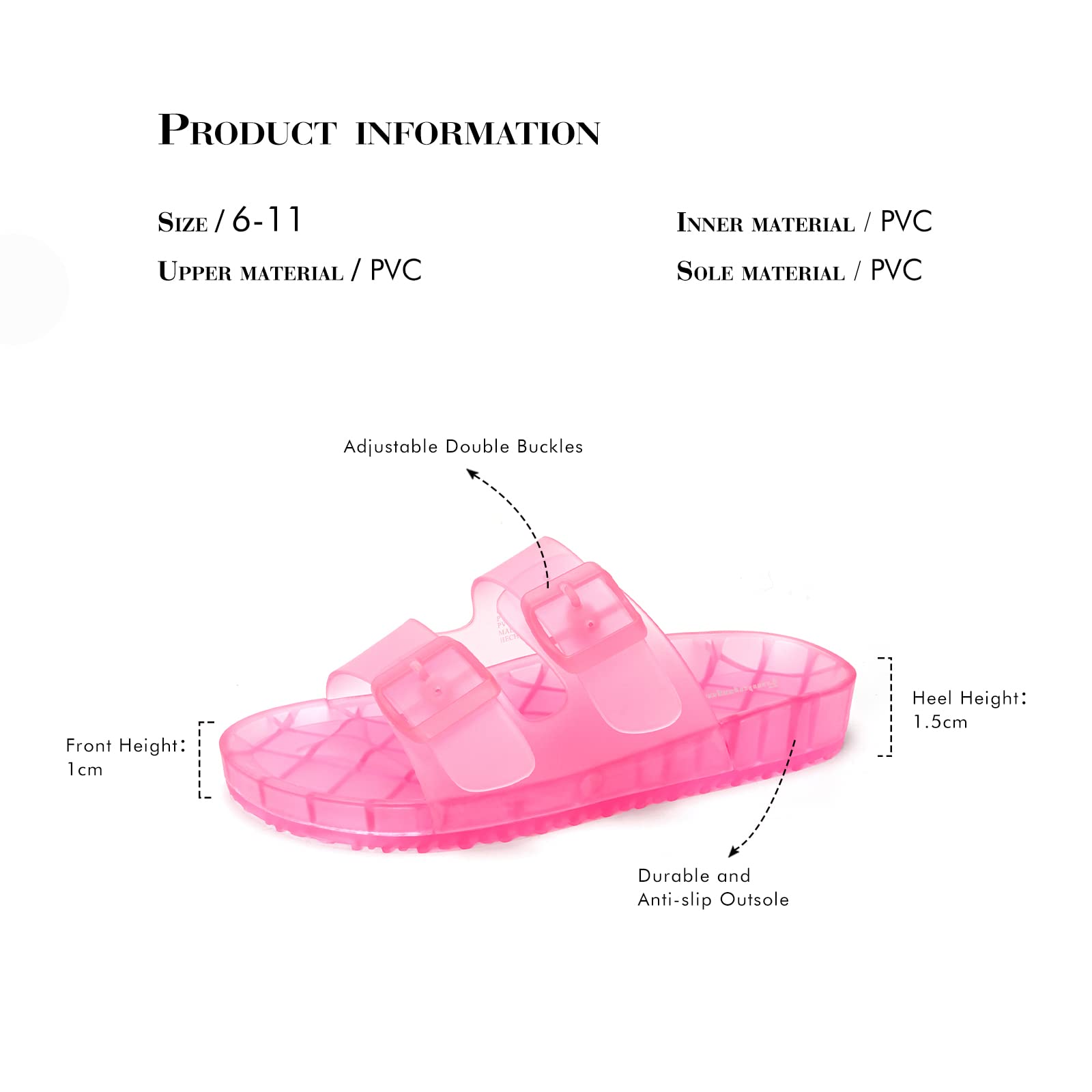 【Shoes material】The sandals are made of PVC. Due to the nature of the material itself, they may become hard over time. The sole has a wavy pattern, which is durable and anti-slip.