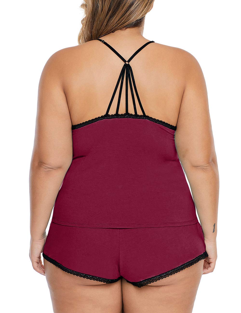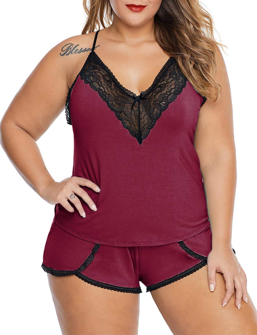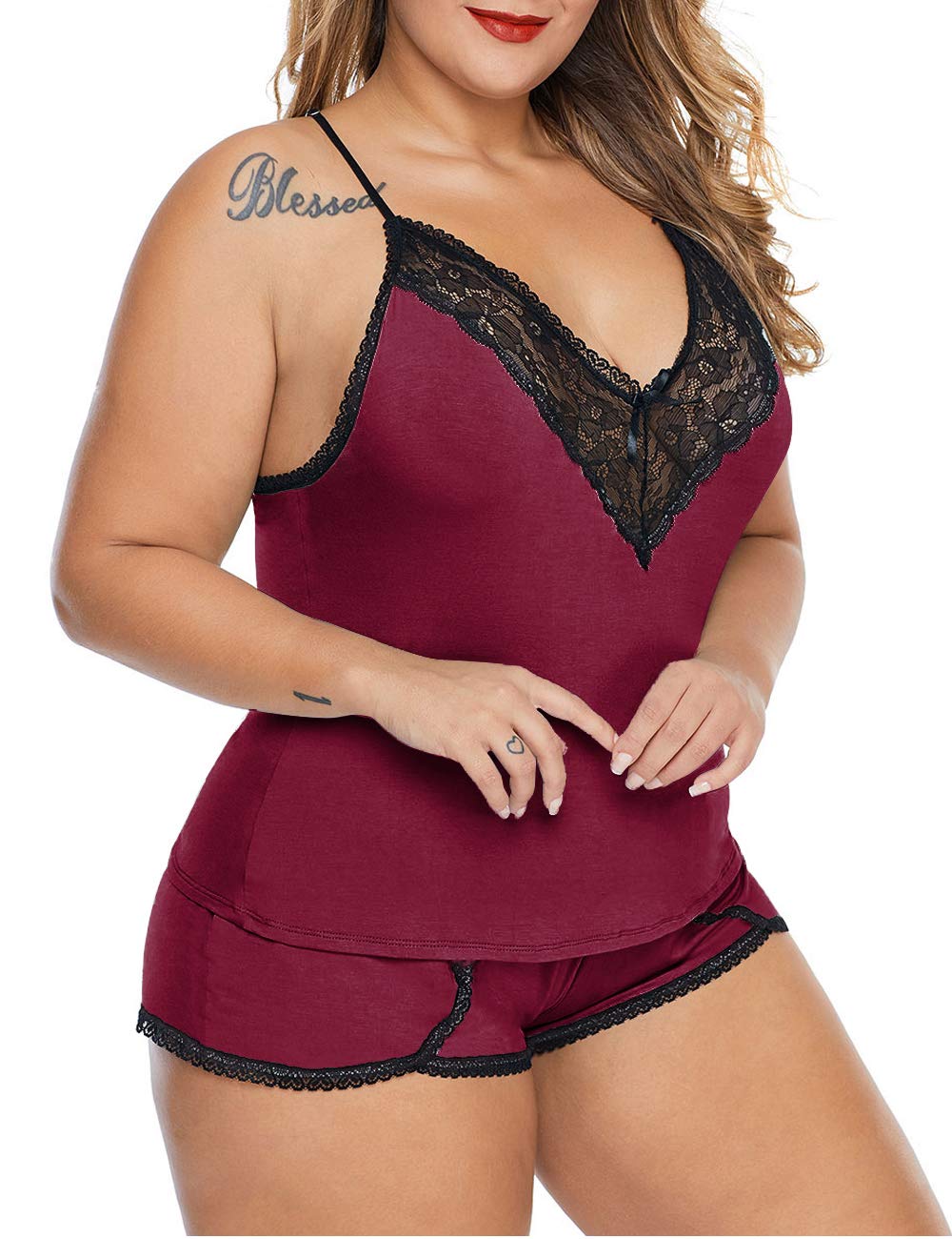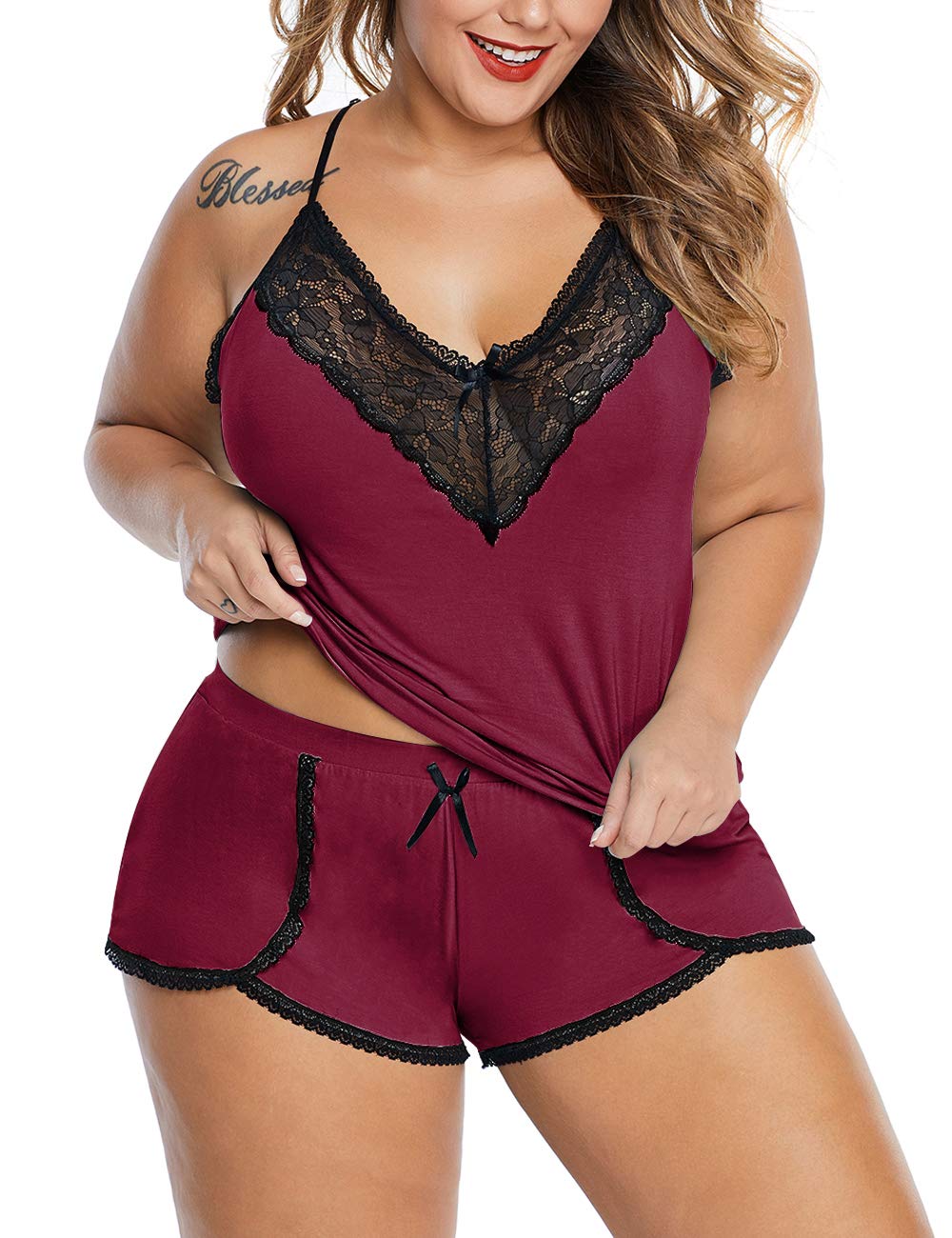 ❀ Features: Plus size cami shorts set,V neckline with lace patchwork and bow details, unique back design, adjustable spaghetti straps, sexy camisole short set, lace pajama cami set, sexy lace pj shorts for women with shorts makes you more sexy and noble.