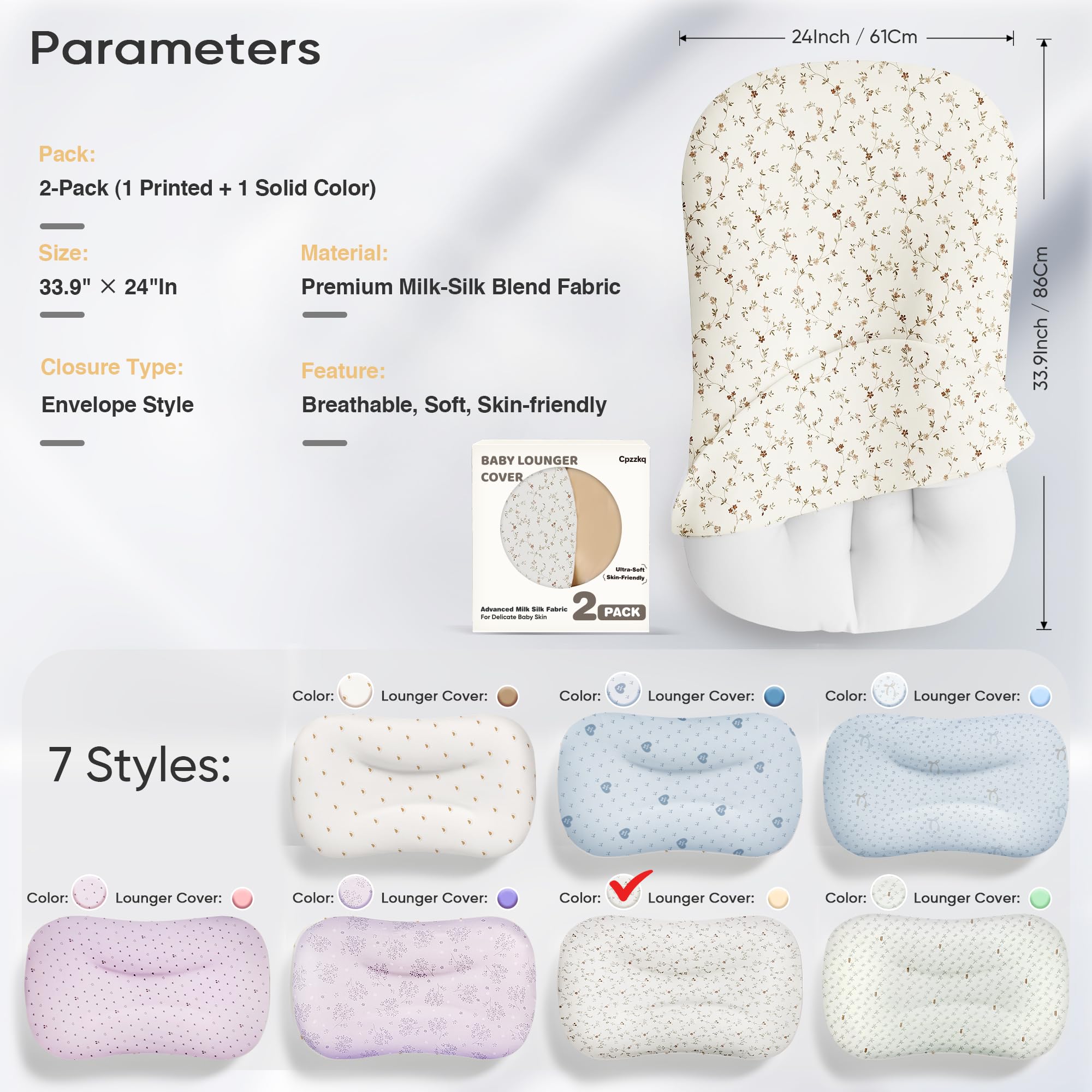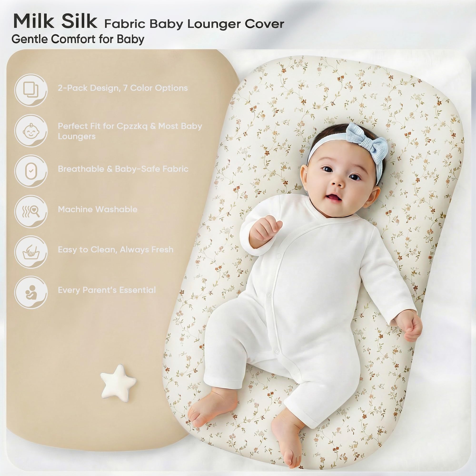 Give your little one the comfort they deserve with our 2-Pack Baby Lounger Covers, perfectly sized for the Cpzzkq baby lounger and most standard loungers (33.9" x 24"). Each set includes one printed and one solid-color cover — an easy way to refresh your nursery and switch styles in seconds. Crafted from silky milk-silk blended fabric, these infant lounger covers feel soft and smooth against delicate skin. The breathable, quick-dry material helps keep your baby fresh and comfy during tummy time, play, or cuddle sessions in the nursery. Designed with gentle, hypoallergenic materials and an envelope-style closure for a snug fit, each lounger cover is machine washable, shrink-resistant, and odor-free — making cleanup effortless for busy parents while keeping your baby’s space fresh. A perfect balance of beauty and function, our baby lounger covers bring comfort, safety, and style into your nursery — because your baby deserves the softest touch every single day.