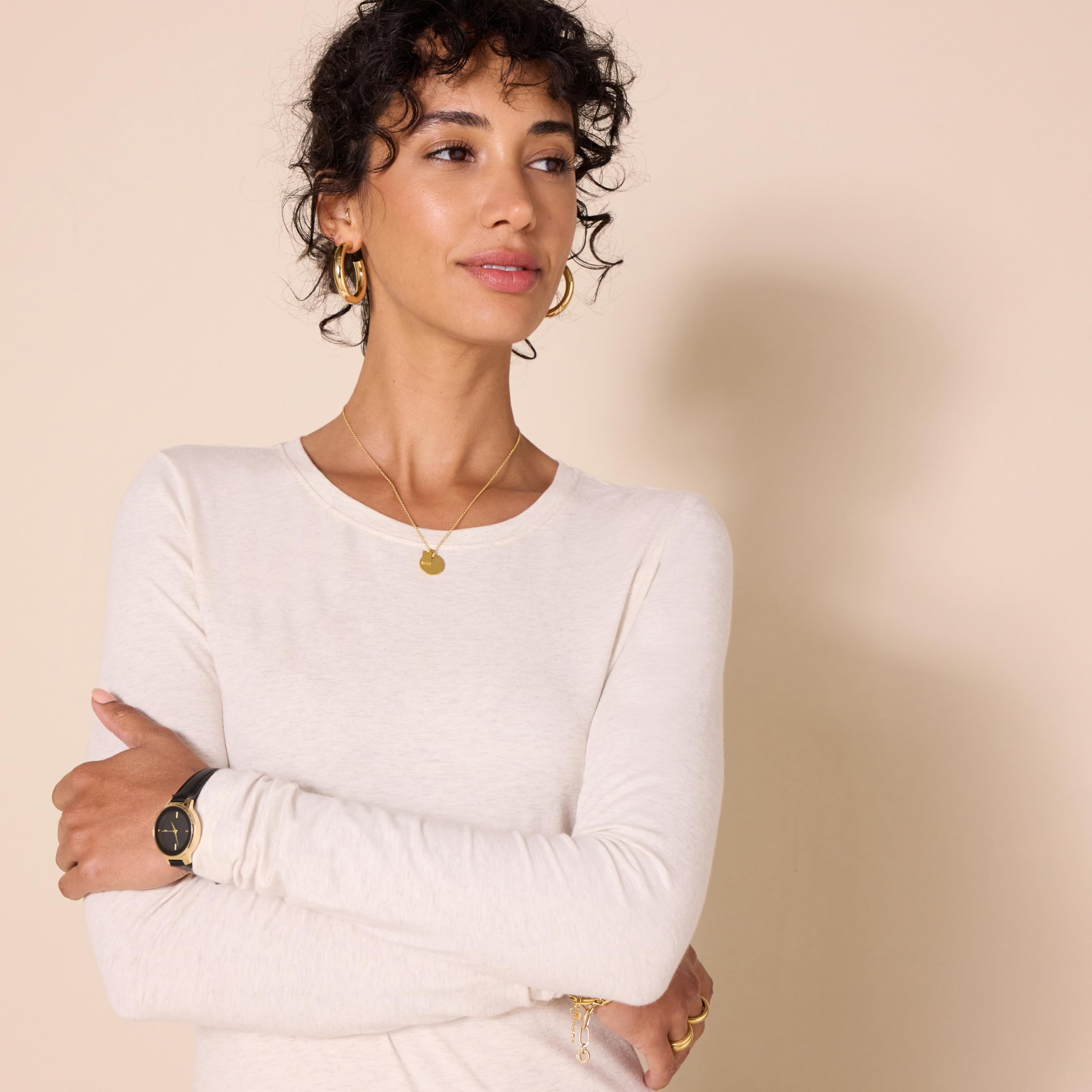 ESSENTIAL T-SHIRT: This versatile t-shirt is a classic wardrobe essential, perfect layered under your favorite jacket or cardigan, or wear on its own for casual, everyday style